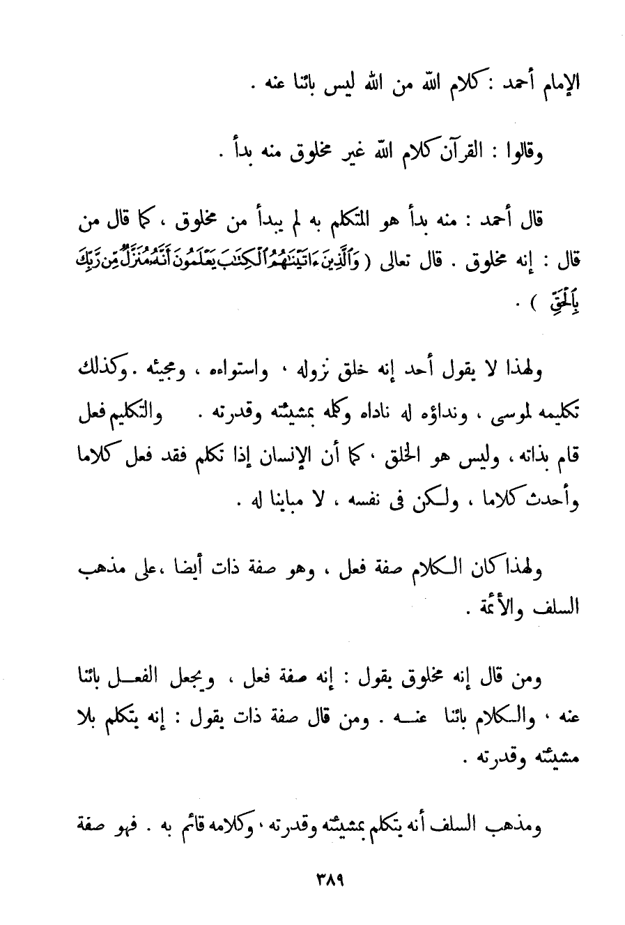 الْإِمَامُ أَحْمَد: كَلَامُ اللَّه مِنْ اللَّهِ لَيْسَ بَائِنًا عَنْهُ. وَقَالُوا: الْقُرْآنُ كَلَامُ اللَّهِ غَيْرُ مَخْلُوقٍ مِنْهُ بَدَأَ. قَالَ أَحْمَد: مِنْهُ بَدَأَ هُوَ الْمُتَكَلِّمُ بِهِ لَمْ يَبْدَأْ مِنْ مَخْلُوقٍ كَمَا قَالَ مَنْ قَالَ: إنَّهُ مَخْلُوقٌ. قَالَ تَعَالَى {وَالَّذِينَ آتَيْنَاهُمُ الْكِتَابَ يَعْلَمُونَ أَنَّهُ مُنَزَّلٌ مِنْ رَبِّكَ بِالْحَقِّ} . وَلِهَذَا لَا يَقُولُ أَحَدٌ إنَّهُ خَلَقَ نُزُولَهُ وَاسْتِوَاءَهُ وَمَجِيئَهُ. وَكَذَلِكَ تَكْلِيمُهُ لِمُوسَى وَنِدَاؤُهُ لَهُ نَادَاهُ وَكَلَّمَهُ بِمَشِيئَتِهِ وَقُدْرَتِهِ. وَالتَّكْلِيمُ فِعْلٌ قَامَ بِذَاتِهِ وَلَيْسَ هُوَ الْخَلْقُ كَمَا أَنَّ الْإِنْسَانَ إذَا تَكَلَّمَ فَقَدْ فَعَلَ كَلَامًا وَأَحْدَثَ كَلَامًا وَلَكِنْ فِي نَفْسِهِ لَا مُبَايِنًا لَهُ. وَلِهَذَا كَانَ الْكَلَامُ صِفَةَ فِعْلٍ وَهُوَ صِفَةُ ذَاتٍ أَيْضًا عَلَى مَذْهَبِ السَّلَفِ وَالْأَئِمَّةِ. وَمَنْ قَالَ إنَّهُ مَخْلُوقٌ يَقُولُ: إنَّهُ صِفَةُ فِعْلٍ وَيُجْعَلُ الْفِعْلُ بَائِنًا عَنْهُ وَالْكَلَامُ بَائِنًا عَنْهُ. وَمَنْ قَالَ صِفَةَ ذَاتٍ يَقُولُ: إنَّهُ يَتَكَلَّمُ بِلَا مَشِيئَتِهِ وَقُدْرَتِهِ. وَمَذْهَبُ السَّلَفِ أَنَّهُ يَتَكَلَّمُ بِمَشِيئَتِهِ وَقُدْرَتِهِ وَكَلَامُهُ قَائِمٌ بِهِ. فَهُوَ صِفَةُ