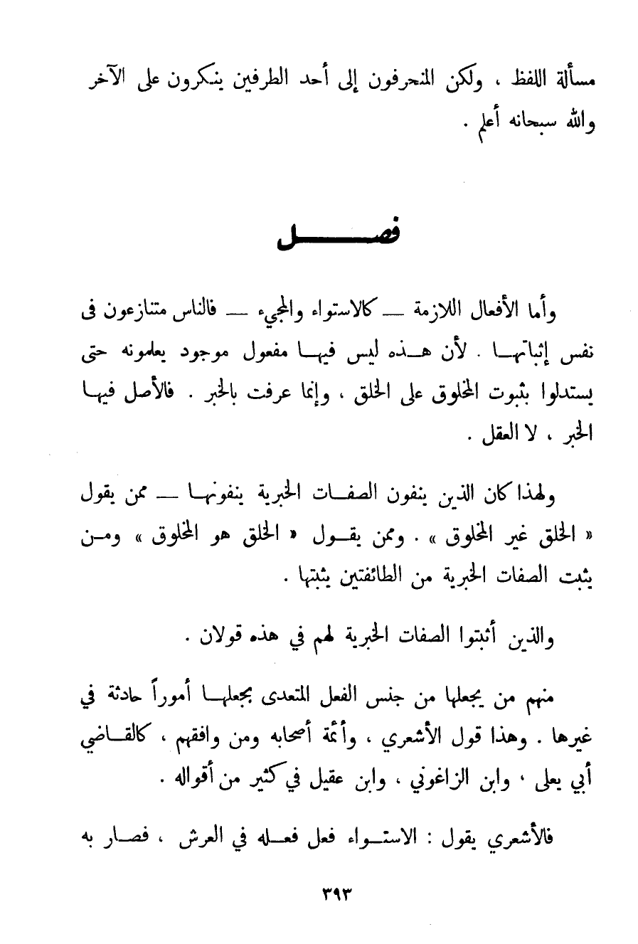 وَأَمَّا الْأَفْعَالُ اللَّازِمَةُ كَالِاسْتِوَاءِ وَالْمَجِيءِ فَالنَّاسُ مُتَنَازِعُونَ فِي نَفْسِ إثْبَاتِهَا. لِأَنَّ هَذِهِ لَيْسَ فِيهَا مَفْعُولٌ مَوْجُودٌ يَعْلَمُونَهُ حَتَّى يَسْتَدِلُّوا بِثُبُوتِ الْمَخْلُوقِ عَلَى الْخَلْقِ وَإِنَّمَا عُرِفَتْ بِالْخَبَرِ. فَالْأَصْلُ فِيهَا الْخَبَرُ لَا الْعَقْلُ. وَلِهَذَا كَانَ الَّذِينَ يَنْفُونَ الصِّفَاتِ الْخَبَرِيَّةَ يَنْفُونَهَا مِمَّنْ يَقُولُ " الْخَلْقُ غَيْرُ الْمَخْلُوقِ ". وَمِمَّنْ يَقُولُ " الْخَلْقُ هُوَ الْمَخْلُوقُ " وَمَنْ يُثْبِتُ الصِّفَاتِ الْخَبَرِيَّةَ مِنْ الطَّائِفَتَيْنِ يُثْبِتُهَا.