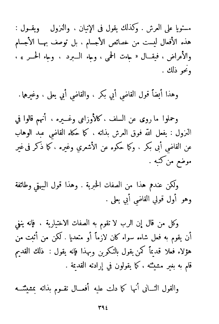 مُسْتَوِيًا عَلَى الْعَرْشِ. وَكَذَلِكَ يَقُولُ فِي الْإِتْيَانِ وَالنُّزُولِ. وَيَقُولُ: هَذِهِ الْأَفْعَالُ لَيْسَتْ مِنْ خَصَائِصِ الْأَجْسَامِ بَلْ تُوصَفُ بِهَا الْأَجْسَامُ وَالْأَعْرَاضُ فَيُقَالُ " جَاءَتْ الْحُمَّى وَجَاءَ الْبَرْدُ وَجَاءَ الْحُرُّ " وَنَحْوُ ذَلِكَ. وَهَذَا أَيْضًا قَوْلُ الْقَاضِي أَبِي بَكْرٍ وَالْقَاضِي أَبِي يَعْلَى وَغَيْرِهِمَا. وَحَمَلُوا مَا رُوِيَ عَنْ السَّلَفِ كالأوزاعي وَغَيْرِهِ أَنَّهُمْ قَالُوا فِي النُّزُولِ: يَفْعَلُ اللَّه فَوْقَ الْعَرْشِ بِذَاتِهِ كَمَا حَكَاهُ الْقَاضِي عَبْدُ الْوَهَّابِ عَنْ الْقَاضِي أَبِي بَكْرٍ وَكَمَا حَكَوْهُ عَنْ الْأَشْعَرِيِّ وَغَيْرِهِ كَمَا ذُكِرَ فِي غَيْرِ مَوْضِعٍ مِنْ كُتُبِهِ. وَلَكِنْ عِنْدَهُمْ هَذَا مِنْ الصِّفَاتِ الْخَبَرِيَّةِ. وَهَذَا قَوْلُ البيهقي وَطَائِفَةٍ وَهُوَ أَوَّلُ قَوْلَيْ الْقَاضِي أَبِي يَعْلَى. وَكُلُّ مَنْ قَالَ إنَّ الرَّبَّ لَا تَقُومُ بِهِ الصِّفَاتُ الِاخْتِيَارِيَّةُ فَإِنَّهُ يَنْفِي أَنْ يَقُومَ بِهِ فِعْلٌ شَاءَهُ سَوَاءٌ كَانَ لَازِمًا أَوْ مُتَعَدِّيًا. لَكِنْ مَنْ أَثْبَتَ مِنْ هَؤُلَاءِ فِعْلًا قَدِيمًا كَمَنْ يَقُولُ بِالتَّكْوِينِ وَبِهَذَا فَإِنَّهُ يَقُولُ: ذَلِكَ الْقَدِيمُ قَامَ بِهِ بِغَيْرِ مَشِيئَتِهِ كَمَا يَقُولُونَ فِي إرَادَتِهِ الْقَدِيمَةِ. وَالْقَوْلُ الثَّانِي أَنَّهَا كَمَا دَلَّتْ عَلَيْهِ أَفْعَالٌ تَقُومُ بِذَاتِهِ بِمَشِيئَتِهِ