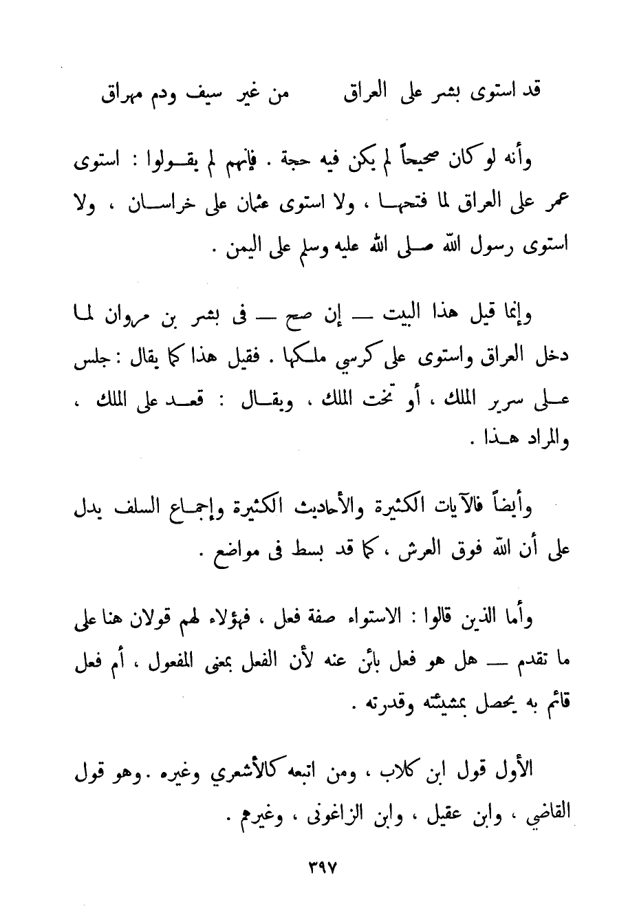 وَأَنَّهُ لَوْ كَانَ صَحِيحًا لَمْ يَكُنْ فِيهِ حُجَّةٌ. فَإِنَّهُمْ لَمْ يَقُولُوا: اسْتَوَى عُمَرُ عَلَى الْعِرَاقِ لَمَّا فَتَحَهَا وَلَا اسْتَوَى عُثْمَانُ عَلَى خُرَاسَانَ وَلَا اسْتَوَى رَسُولُ اللَّه صَلَّى اللَّهُ عَلَيْهِ وَسَلَّمَ عَلَى الْيَمَنِ. وَإِنَّمَا قِيلَ هَذَا الْبَيْتُ إنْ صَحَّ فِي بِشْرِ بْنِ مَرْوَانَ لَمَّا دَخَلَ الْعِرَاقَ وَاسْتَوَى عَلَى كُرْسِيِّ مَلِكِهَا. فَقِيلَ هَذَا كَمَا يُقَالُ: جَلَسَ عَلَى سَرِيرِ الْمُلْكِ أَوْ تَحْتَ الْمُلْكِ وَيُقَالُ: قَعَدَ عَلَى الْمُلْكِ وَالْمُرَادُ هَذَا. وَأَيْضًا فَالْآيَاتُ الْكَثِيرَةُ وَالْأَحَادِيثُ الْكَثِيرَةُ وَإِجْمَاعُ السَّلَفِ يَدُلُّ عَلَى أَنَّ اللَّهَ فَوْقَ الْعَرْشِ كَمَا قَدْ بُسِطَ فِي مَوَاضِعَ. وَأَمَّا الَّذِينَ قَالُوا: الِاسْتِوَاءُ صِفَةُ فِعْلٍ فَهَؤُلَاءِ لَهُمْ قَوْلَانِ هُنَا عَلَى مَا تَقَدَّمَ هَلْ هُوَ فِعْلٌ بَائِنٌ عَنْهُ لِأَنَّ الْفِعْلَ بِمَعْنَى الْمَفْعُولِ أَمْ فِعْلٌ قَائِمٌ بِهِ يَحْصُلُ بِمَشِيئَتِهِ وَقُدْرَتِهِ. الْأَوَّلُ قَوْلُ ابْنِ كِلَابٍ وَمَنْ اتَّبَعَهُ كَالْأَشْعَرِيِّ وَغَيْرِهِ. وَهُوَ قَوْلُ الْقَاضِي وَابْنِ عَقِيلٍ وَابْنِ الزَّاغُونِي وَغَيْرِهِمْ.