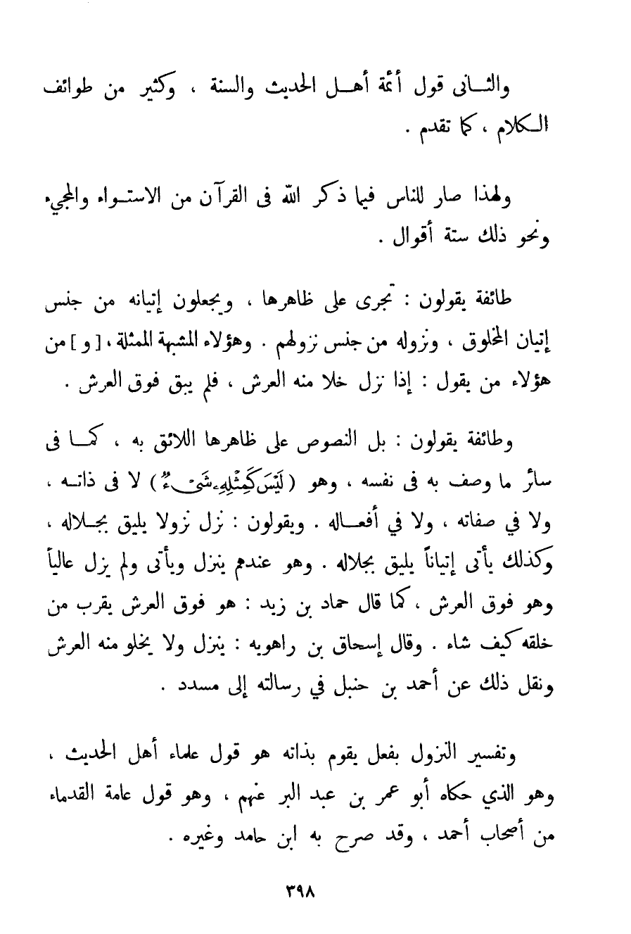 وَالثَّانِي قَوْلُ أَئِمَّةِ أَهْلِ الْحَدِيثِ وَالسُّنَّةِ وَكَثِيرٍ مِنْ طَوَائِفِ الْكَلَامِ كَمَا تَقَدَّمَ. وَلِهَذَا صَارَ لِلنَّاسِ فِيمَا ذَكَرَ اللَّهُ فِي الْقُرْآنِ مِنْ الِاسْتِوَاءِ وَالْمَجِيءِ وَنَحْوِ ذَلِكَ سِتَّةُ أَقْوَالٍ. طَائِفَةٌ يَقُولُونَ: تَجْرِي عَلَى ظَاهِرِهَا وَيَجْعَلُونَ إتْيَانَهُ مِنْ جِنْسِ إتْيَانِ الْمَخْلُوقِ وَنُزُولَهُ مِنْ جِنْسِ نُزُولِهِمْ. وَهَؤُلَاءِ الْمُشَبِّهَةُ الْمُمَثِّلَةُ وَمِنْ هَؤُلَاءِ مَنْ يَقُولُ: إذَا نَزَلَ خَلَا مِنْهُ الْعَرْشُ فَلَمْ يَبْقَ فَوْقَ الْعَرْشِ. وَطَائِفَةٌ يَقُولُونَ: بَلْ النُّصُوصُ عَلَى ظَاهِرِهَا اللَّائِقِ بِهِ كَمَا فِي سَائِرِ مَا وُصِفَ بِهِ فِي نَفْسِهِ وَهُوَ {لَيْسَ كَمِثْلِهِ شَيْءٌ} لَا فِي ذَاتِهِ وَلَا فِي صِفَاتِهِ وَلَا فِي أَفْعَالِهِ. وَيَقُولُونَ: نَزَلَ نُزُولًا يَلِيقُ بِجَلَالِهِ وَكَذَلِكَ يَأْتِي إتْيَانًا يَلِيقُ بِجَلَالِهِ. وَهُوَ عِنْدُهُمْ يَنْزِلُ وَيَأْتِي وَلَمْ يَزَلْ عَالِيًا وَهُوَ فَوْقَ الْعَرْشِ كَمَا قَالَ حَمَّادُ بْنُ زَيْدٍ: هُوَ فَوْقَ الْعَرْشِ يَقْرُبُ مِنْ خَلْقِهِ كَيْفَ شَاءَ. وَقَالَ إسْحَاقُ بْنُ رَاهَوَيْه: يَنْزِلُ وَلَا يَخْلُو مِنْهُ الْعَرْشُ وَنُقِلَ ذَلِكَ عَنْ أَحْمَد بْنِ حَنْبَلٍ فِي رِسَالَتِهِ إلَى مُسَدَّدٍ. وَتَفْسِيرُ النُّزُولِ بِفِعْلِ يَقُومُ بِذَاتِهِ هُوَ قَوْلُ عُلَمَاءِ أَهْلِ الْحَدِيثِ وَهُوَ الَّذِي حَكَاهُ أَبُو عُمَرَ بْنُ عَبْدِ الْبَرِّ عَنْهُمْ وَهُوَ قَوْلُ عَامَّةِ الْقُدَمَاءِ مِنْ أَصْحَابِ أَحْمَد وَقَدْ صَرَّحَ بِهِ ابْنُ حَامِدٍ وَغَيْرُهُ.