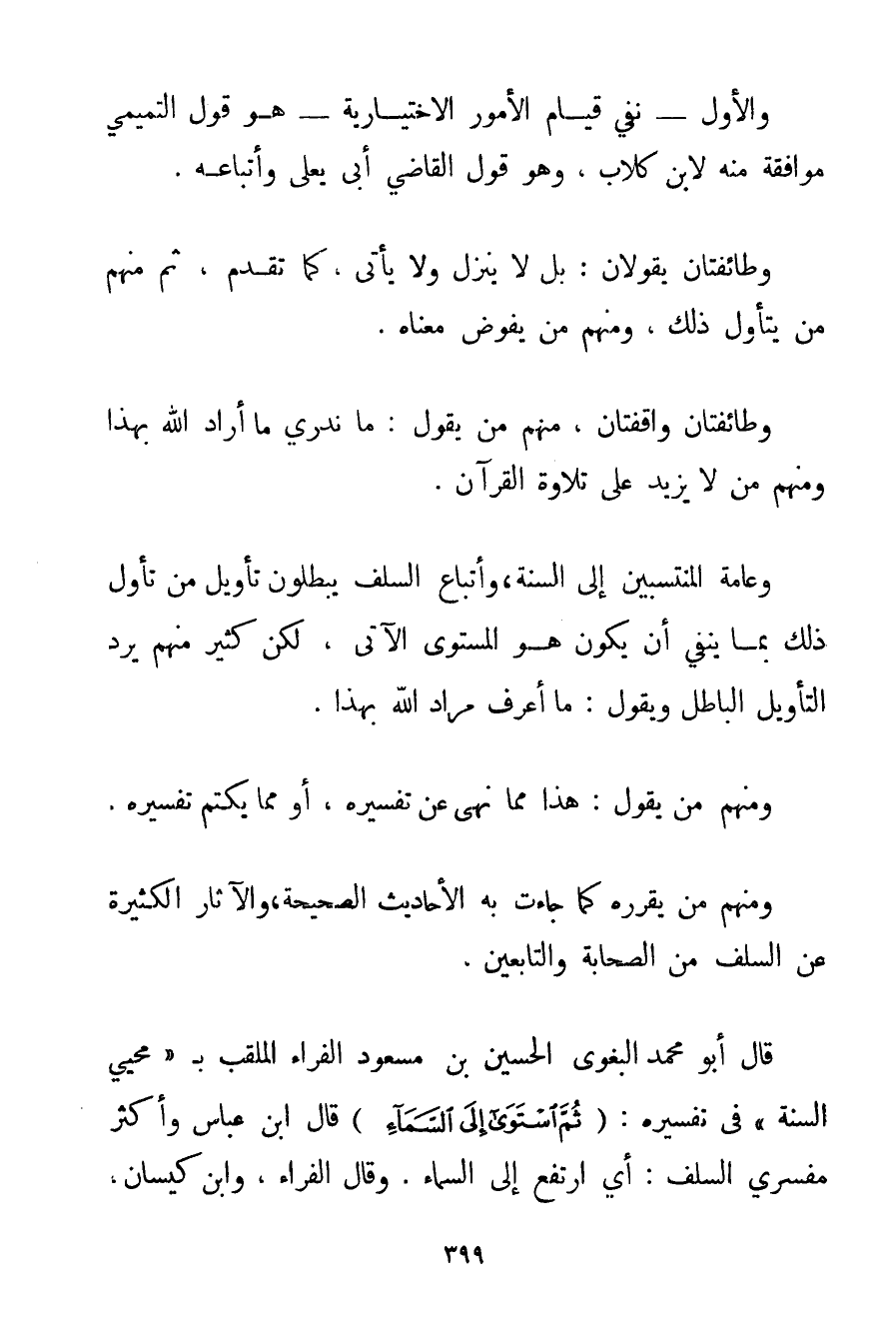 وَالْأَوَّلُ نَفْيُ قِيَامِ الْأُمُورِ الِاخْتِيَارِيَّةِ هُوَ قَوْلُ التَّمِيمِيِّ مُوَافَقَةً مِنْهُ لِابْنِ كِلَابٍ وَهُوَ قَوْلُ الْقَاضِي أَبِي يَعْلَى وَأَتْبَاعِهِ. وَطَائِفَتَانِ يَقُولَانِ: بَلْ لَا يَنْزِلُ وَلَا يَأْتِي كَمَا تَقَدَّمَ ثُمَّ مِنْهُمْ مَنْ يَتَأَوَّلُ ذَلِكَ وَمِنْهُمْ مَنْ يُفَوِّضُ مَعْنَاهُ. وَطَائِفَتَانِ وَاقِفَتَانِ مِنْهُمْ مَنْ يَقُولُ: مَا نَدْرِي مَا أَرَادَ اللَّهُ بِهَذَا وَمِنْهُمْ مَنْ لَا يَزِيدُ عَلَى تِلَاوَةِ الْقُرْآنِ. وَعَامَّةُ الْمُنْتَسِبِينَ إلَى السُّنَّةِ وَأَتْبَاعُ السَّلَفِ يُبْطِلُونَ تَأْوِيلَ مَنْ تَأَوَّلَ ذَلِكَ بِمَا يَنْفِي أَنْ يَكُونَ هُوَ الْمُسْتَوِي الْآتِي لَكِنْ كَثِيرٌ مِنْهُمْ يَرُدُّ التَّأْوِيلَ الْبَاطِلَ وَيَقُولُ: مَا أَعِرْفُ مُرَادَ اللَّهِ بِهَذَا. وَمِنْهُمْ مَنْ يَقُولُ: هَذَا مِمَّا نُهِيَ عَنْ تَفْسِيرِهِ أَوْ مِمَّا يُكْتَمُ تَفْسِيرُهُ. وَمِنْهُمْ مَنْ يُقَرِّرُهُ كَمَا جَاءَتْ بِهِ الْأَحَادِيثُ الصَّحِيحَةُ وَالْآثَارُ الْكَثِيرَةُ عَنْ السَّلَفِ مِنْ الصَّحَابَةِ وَالتَّابِعِينَ. قَالَ أَبُو مُحَمَّدٍ البغوي الْحُسَيْنُ بْنُ مَسْعُودٍ الْفَرَّاءُ الْمُلَقَّبُ بـ مُحْيِي السُّنَّةِ فِي تَفْسِيرِهِ: {ثُمَّ اسْتَوَى إلَى السَّمَاءِ} قَالَ ابْنُ عَبَّاسٍ وَأَكْثَرُ مُفَسِّرِي السَّلَفِ: أَيْ ارْتَفَعَ إلَى السَّمَاءِ. وَقَالَ الْفَرَّاءُ وَابْنُ كيسان