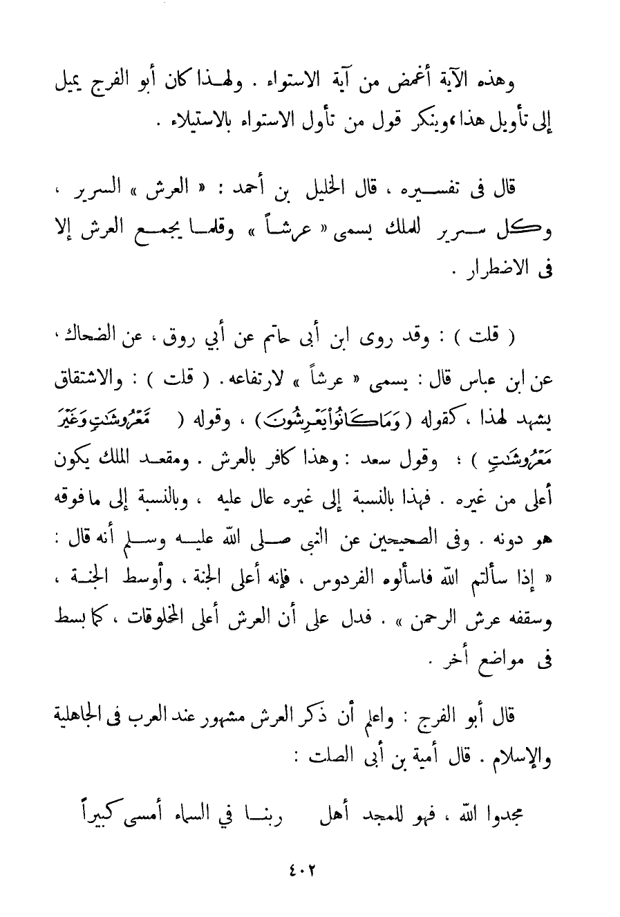 وَهَذِهِ الْآيَةُ أغمض مِنْ آيَةِ الِاسْتِوَاءِ. وَلِهَذَا كَانَ أَبُو الْفَرَجِ يَمِيلُ إلَى تَأْوِيلِ هَذَا وَيُنْكِرُ قَوْلَ مَنْ تَأَوَّلَ الِاسْتِوَاءَ بِالِاسْتِيلَاءِ. قَالَ فِي تَفْسِيرِهِ قَالَ الْخَلِيلُ بْنُ أَحْمَد: " الْعَرْشُ " السَّرِيرُ وَكُلُّ سَرِيرٍ لِلْمُلْكِ يُسَمَّى " عَرْشًا " وَقَلَّمَا يُجْمَعُ الْعَرْشُ إلَّا فِي الِاضْطِرَارِ. قُلْت: وَقَدْ رَوَى ابْنُ أَبِي حَاتِمٍ عَنْ أَبِي رَوْقٍ عَنْ الضَّحَّاكِ عَنْ ابْنِ عَبَّاسٍ قَالَ: يُسَمَّى " عَرْشًا " لِارْتِفَاعِهِ. قُلْت: وَالِاشْتِقَاقُ يَشْهَدُ لِهَذَا كَقَوْلِهِ {وَمَا كَانُوا يَعْرِشُونَ} وَقَوْلِهِ {مَعْرُوشَاتٍ وَغَيْرَ مَعْرُوشَاتٍ} . وَقَوْلُ سَعْدٍ: وَهَذَا كَافِرٌ بِالْعَرْشِ. وَمَقْعَدُ الْمَلِكِ يَكُونُ أَعْلَى مِنْ غَيْرِهِ. فَهَذَا بِالنِّسْبَةِ إلَى غَيْرِهِ عَالٍ عَلَيْهِ وَبِالنِّسْبَةِ إلَى مَا فَوْقَهُ هُوَ دُونَهُ. وَفِي الصَّحِيحَيْنِ عَنْ النَّبِيِّ صَلَّى اللَّهُ عَلَيْهِ وَسَلَّمَ أَنَّهُ قَالَ: {إذَا سَأَلْتُمْ اللَّهَ فَاسْأَلُوهُ الْفِرْدَوْسَ فَإِنَّهُ أَعْلَى الْجَنَّةِ وَأَوْسَطُ الْجَنَّةِ وَسَقْفُهُ عَرْشُ الرَّحْمَنِ} . فَدَلَّ عَلَى أَنَّ الْعَرْشَ أَعْلَى الْمَخْلُوقَاتِ كَمَا بُسِطَ فِي مَوَاضِعَ أُخَرٍ. قَالَ أَبُو الْفَرَجِ: وَاعْلَمْ أَنَّ ذِكْرَ الْعَرْشِ مَشْهُورٌ عِنْدَ الْعَرَبِ فِي الْجَاهِلِيَّةِ وَالْإِسْلَامِ. قَالَ أُمَيَّةُ بْنُ أَبِي الصَّلْتِ: