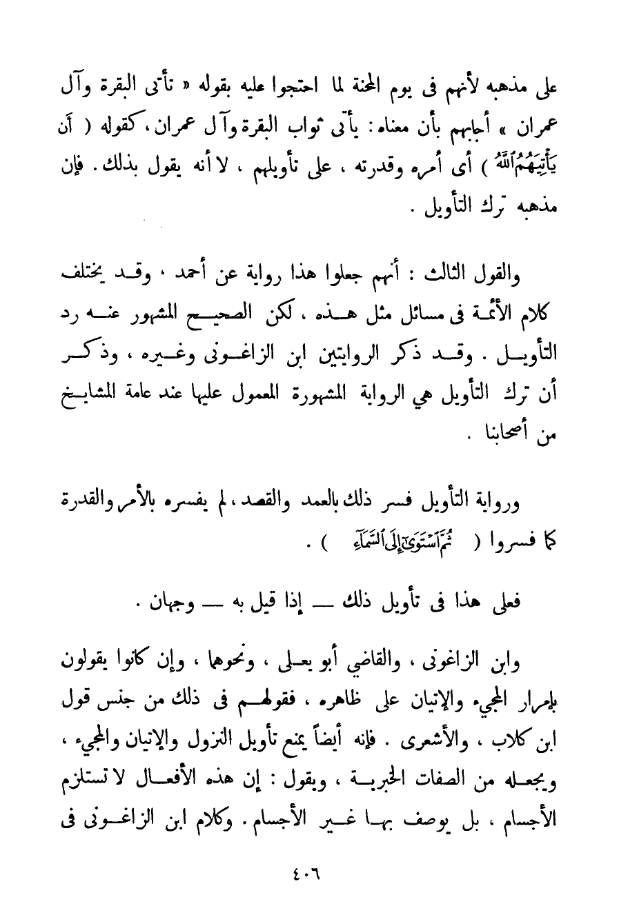 عَلَى مَذْهَبِهِ لِأَنَّهُمْ فِي يَوْمِ الْمِحْنَةِ لَمَّا احْتَجُّوا عَلَيْهِ بِقَوْلِهِ " تَأْتِي الْبَقَرَةُ وَآلُ عِمْرَانَ " أَجَابَهُمْ بِأَنَّ مَعْنَاهُ: يَأْتِي ثَوَابُ الْبَقَرَةِ وَآلِ عِمْرَانَ كَقَوْلِهِ {أَنْ يَأْتِيَهُمُ اللَّهُ} أَيْ أَمْرُهُ وَقُدْرَتُهُ عَلَى تَأْوِيلِهِمْ لَا أَنَّهُ يَقُولُ بِذَلِكَ. فَإِنَّ مَذْهَبَهُ تَرْكُ التَّأْوِيلِ. وَالْقَوْلُ الثَّالِثُ: أَنَّهُمْ جَعَلُوا هَذَا رِوَايَةً عَنْ أَحْمَد وَقَدْ يَخْتَلِفُ كَلَامُ الْأَئِمَّةِ فِي مَسَائِلَ مِثْلِ هَذِهِ لَكِنَّ الصَّحِيحَ الْمَشْهُورَ عَنْهُ رِدُّ التَّأْوِيلِ. وَقَدْ ذَكَرَ الرِّوَايَتَيْنِ ابْنُ الزَّاغُونِي وَغَيْرُهُ وَذَكَرَ أَنَّ تَرْكَ التَّأْوِيلِ هِيَ الرِّوَايَةُ الْمَشْهُورَةُ الْمَعْمُولُ عَلَيْهَا عِنْدَ عَامَّةِ الْمَشَايِخِ مِنْ أَصْحَابِنَا. وَرِوَايَةُ التَّأْوِيلِ فَسَّرَ ذَلِكَ بِالْعَمْدِ وَالْقَصْدِ لَمْ يُفَسِّرْهُ بِالْأَمْرِ وَالْقُدْرَةِ كَمَا فَسَّرُوا {ثُمَّ اسْتَوَى إلَى السَّمَاءِ} . فَعَلَى هَذَا فِي تَأْوِيلِ ذَلِكَ إذَا قِيلَ بِهِ وَجْهَانِ. وَابْنُ الزَّاغُونِي وَالْقَاضِي أَبُو يَعْلَى وَنَحْوُهُمَا وَإِنْ كَانُوا يَقُولُونَ بِإِمْرَارِ الْمَجِيءِ وَالْإِتْيَانِ عَلَى ظَاهِرِهِ فَقَوْلُهُمْ فِي ذَلِكَ مِنْ جِنْسِ قَوْلِ ابْنِ كِلَابٍ وَالْأَشْعَرِيِّ. فَإِنَّهُ أَيْضًا يَمْنَعُ تَأْوِيلَ النُّزُولِ وَالْإِتْيَانِ وَالْمَجِيءِ وَيَجْعَلُهُ مِنْ الصِّفَاتِ الْخَبَرِيَّةِ وَيَقُولُ: إنَّ هَذِهِ الْأَفْعَالَ لَا تَسْتَلْزِمُ الْأَجْسَامَ بَلْ يُوصَفُ بِهَا غَيْرُ الْأَجْسَامِ. وَكَلَامُ ابْنِ الزَّاغُونِي فِي هَذَا