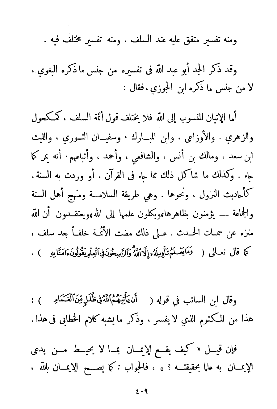وَمِنْهُ تَفْسِيرٌ مُتَّفَقٌ عَلَيْهِ عِنْدَ السَّلَفِ وَمِنْهُ تَفْسِيرٌ مُخْتَلَفٌ فِيهِ. وَقَدْ ذَكَرَ الْجَدُّ أَبُو عَبْدِ اللَّهِ فِي تَفْسِيرِهِ مِنْ جِنْسِ مَا ذَكَرَهُ البغوي لَا مِنْ جِنْسِ مَا ذَكَرَهُ ابْنُ الْجَوْزِيِّ فَقَالَ: أَمَّا الْإِتْيَانُ الْمَنْسُوبُ إلَى اللَّهِ فَلَا يَخْتَلِفُ قَوْلُ أَئِمَّةِ السَّلَفِ كَمَكْحُولِ وَالزُّهْرِيِّ. وَالْأَوْزَاعِي وَابْنِ الْمُبَارَكِ وَسُفْيَانَ الثَّوْرِيِّ وَاللَّيْثِ بْنِ سَعْدٍ وَمَالِك بْنِ أَنَسٍ وَالشَّافِعِيِّ وَأَحْمَد وَأَتْبَاعِهِمْ أَنَّهُ يَمُرُّ كَمَا جَاءَ. وَكَذَلِكَ مَا شَاكَلَ ذَلِكَ مِمَّا جَاءَ فِي الْقُرْآنِ أَوْ وَرَدَتْ بِهِ السُّنَّةُ كَأَحَادِيثِ النُّزُولِ وَنَحْوِهَا. وَهِيَ طَرِيقَةُ السَّلَامَةِ وَمَنْهَجُ أَهْلِ السُّنَّةِ وَالْجَمَاعَةِ يُؤْمِنُونَ بِظَاهِرِهَا وَيَكِلُونَ عِلْمَهَا إلَى اللَّهِ وَيَعْتَقِدُونَ أَنَّ اللَّهَ مُنَزَّهٌ عَنْ سِمَاتِ الْحَدَثِ. عَلَى ذَلِكَ مَضَتْ الْأَئِمَّةُ خَلَفًا بَعْدَ سَلَفٍ كَمَا قَالَ تَعَالَى {وَمَا يَعْلَمُ تَأْوِيلَهُ إلَّا اللَّهُ وَالرَّاسِخُونَ فِي الْعِلْمِ يَقُولُونَ آمَنَّا بِهِ} . وَقَالَ ابْنُ السَّائِبِ فِي قَوْلِهِ {أَنْ يَأْتِيَهُمُ اللَّهُ فِي ظُلَلٍ مِنَ الْغَمَامِ} : هَذَا مِنْ الْمَكْتُومِ الَّذِي لَا يُفَسَّرُ وَذَكَرَ مَا يُشْبِهُ كَلَامَ الخطابي فِي هَذَا. فَإِنْ قِيلَ " كَيْفَ يَقَعُ الْإِيمَانُ بِمَا لَا يُحِيطُ مَنْ يَدَّعِي الْإِيمَانَ بِهِ عِلْمًا بِحَقِيقَتِهِ؟ " فَالْجَوَابُ: كَمَا يَصِحُّ الْإِيمَانُ بِاَللَّهِ