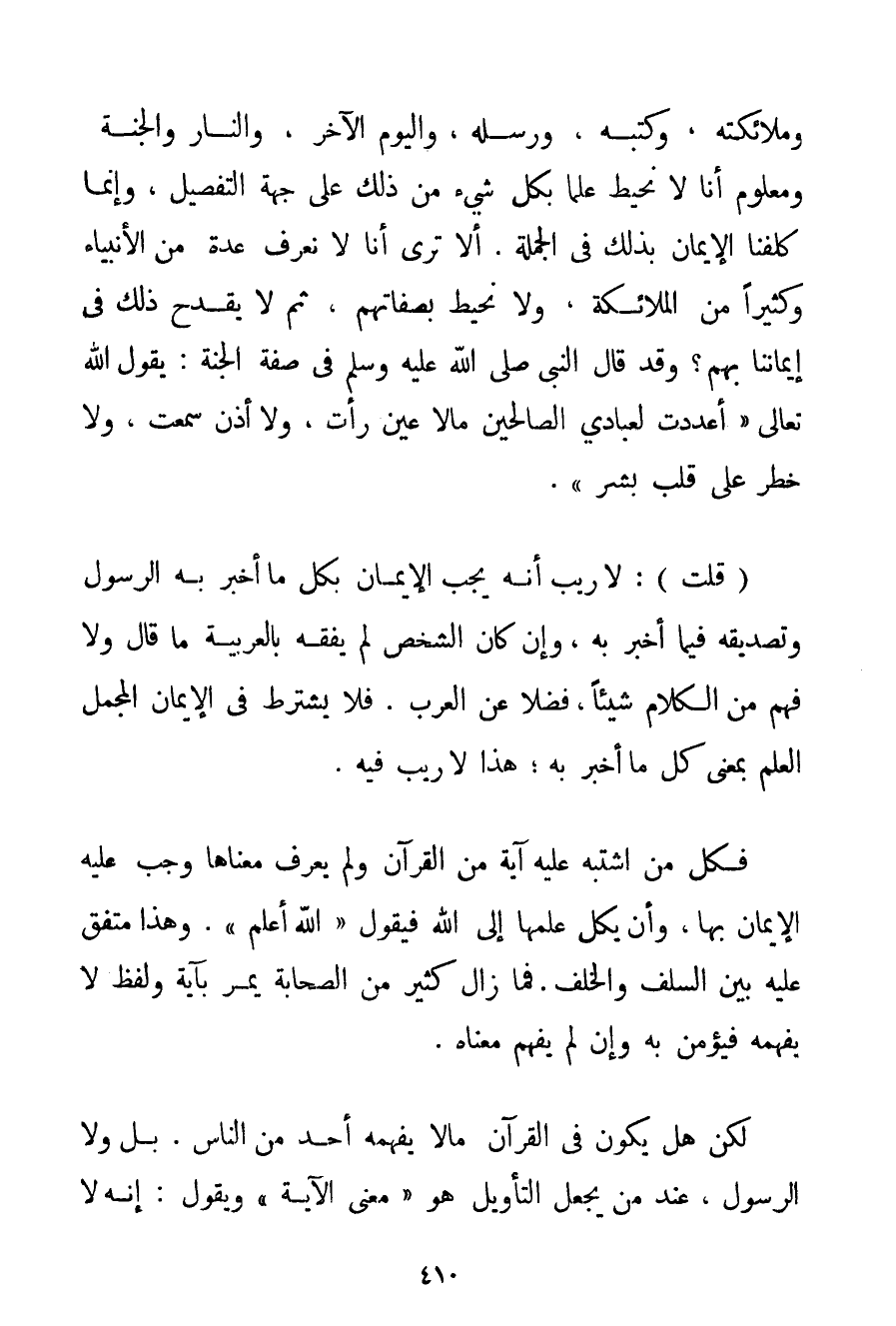 وَمَلَائِكَتِهِ وَكُتُبِهِ وَرُسُلِهِ وَالْيَوْمِ الْآخِرِ وَالنَّارِ وَالْجَنَّةِ. وَمَعْلُومٌ أَنَّا لَا نُحِيطُ عِلْمًا بِكُلِّ شَيْءٍ مِنْ ذَلِكَ عَلَى جِهَةِ التَّفْصِيلِ وَإِنَّمَا كُلِّفْنَا الْإِيمَانَ بِذَلِكَ فِي الْجُمْلَةِ. أَلَا تَرَى أَنَّا لَا نَعْرِفُ عِدَّةً مِنْ الْأَنْبِيَاءِ وَكَثِيرًا مِنْ الْمَلَائِكَةِ وَلَا نُحِيطُ بِصِفَاتِهِمْ ثُمَّ لَا يَقْدَحُ ذَلِكَ فِي إيمَانِنَا بِهِمْ؟ وَقَدْ قَالَ النَّبِيُّ صَلَّى اللَّهُ عَلَيْهِ وَسَلَّمَ فِي صِفَةِ الْجَنَّةِ: {يَقُولُ اللَّهُ تَعَالَى أَعْدَدْت لَعِبَادِي الصَّالِحِينَ مَا لَا عَيْنٌ رَأَتْ وَلَا أُذُنٌ سَمِعَتْ وَلَا خَطَرَ عَلَى قَلْبِ بَشَرٍ} . (قُلْت: لَا رَيْبَ أَنَّهُ يَجِبُ الْإِيمَانُ بِكُلِّ مَا أَخْبَرَ بِهِ الرَّسُولُ وَتَصْدِيقُهُ فِيمَا أَخْبَرَ بِهِ وَإِنْ كَانَ الشَّخْصُ لَمْ يَفْقَهْ بِالْعَرَبِيَّةِ مَا قَالَ وَلَا فَهِمَ مِنْ الْكَلَامِ شَيْئًا فَضْلًا عَنْ الْعَرَبِ. فَلَا يُشْتَرَطُ فِي الْإِيمَانِ الْمُجْمَلِ الْعِلْمُ بِمَعْنَى كُلِّ مَا أَخْبَرَ بِهِ؛ هَذَا لَا رَيْبَ فِيهِ. فَكُلُّ مَنْ اشْتَبَهَ عَلَيْهِ آيَةٌ مِنْ الْقُرْآنِ وَلَمْ يَعْرِفْ مَعْنَاهَا وَجَبَ عَلَيْهِ الْإِيمَانُ بِهَا وَأَنْ يَكِلَ عِلْمَهَا إلَى اللَّهِ فَيَقُولُ " اللَّهُ أَعْلَمُ ". وَهَذَا مُتَّفَقٌ عَلَيْهِ بَيْنِ السَّلَفِ وَالْخَلَفِ. فَمَا زَالَ كَثِيرٌ مِنْ الصَّحَابَةِ يَمُرُّ بِآيَةِ وَلَفْظٍ لَا يَفْهَمُهُ فَيُؤْمِنُ بِهِ وَإِنْ لَمْ يَفْهَمْ مَعْنَاهُ. لَكِنْ هَلْ يَكُونُ فِي الْقُرْآنِ مَا لَا يَفْهَمُهُ أَحَدٌ مِنْ النَّاسِ. بَلْ وَلَا الرَّسُولُ عِنْدَ مَنْ يَجْعَلُ التَّأْوِيلَ هُوَ " مَعْنَى الْآيَةِ " وَيَقُولُ: إنَّهُ لَا
