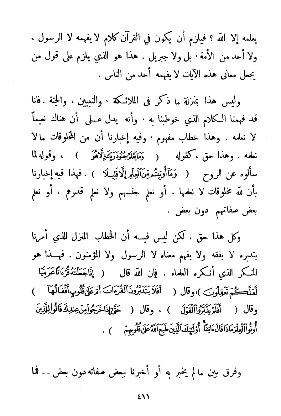 يَعْلَمُهُ إلَّا اللَّهُ؟ فَيَلْزَمُ أَنْ يَكُونَ فِي الْقُرْآنِ كَلَامٌ لَا يَفْهَمُهُ لَا الرَّسُولُ وَلَا أَحَدٌ مِنْ الْأُمَّةِ بَلْ وَلَا جِبْرِيلُ. هَذَا هُوَ الَّذِي يَلْزَمُ عَلَى قَوْلِ مَنْ يَجْعَلُ مَعَانِيَ هَذِهِ الْآيَاتِ لَا يَفْهَمُهُ أَحَدٌ مِنْ النَّاسِ. وَلَيْسَ هَذَا بِمَنْزِلَةِ مَا ذُكِرَ فِي الْمَلَائِكَةِ وَالنَّبِيِّينَ. وَالْجَنَّةِ. فَإِنَّا قَدْ فَهِمْنَا الْكَلَامَ الَّذِي خُوطِبْنَا بِهِ وَأَنَّهُ يَدُلُّ عَلَى أَنَّ هُنَاكَ نَعِيمًا لَا نَعْلَمُهُ. وَهَذَا خِطَابٌ مَفْهُومٌ وَفِيهِ إخْبَارُنَا أَنَّ مِنْ الْمَخْلُوقَاتِ مَا لَا نَعْلَمُهُ. وَهَذَا حَقٌّ كَقَوْلِهِ {وَمَا يَعْلَمُ جُنُودَ رَبِّكَ إلَّا هُوَ} وَقَوْلِهِ لَمَّا سَأَلُوهُ عَنْ الرُّوحِ {وَمَا أُوتِيتُمْ مِنَ الْعِلْمِ إلَّا قَلِيلًا} . فَهَذَا فِيهِ إخْبَارُنَا بِأَنَّ لِلَّهِ مَخْلُوقَاتٍ لَا نَعْلَمُهَا أَوْ نَعْلَمُ جِنْسَهُمْ وَلَا نَعْلَمُ قَدْرَهُمْ أَوْ نَعْلَمُ بَعْضَ صِفَاتِهِمْ دُونَ بَعْضٍ. وَكُلُّ هَذَا حَقٌّ لَكِنْ لَيْسَ فِيهِ أَنَّ الْخِطَابَ الْمُنَزَّلَ الَّذِي أُمِرْنَا بِتَدَبُّرِهِ لَا يَفْقَهُ وَلَا يَفْهَمُ مَعْنَاهُ لَا الرَّسُولُ وَلَا الْمُؤْمِنُونَ. فَهَذَا هُوَ الْمُنْكَرُ الَّذِي أَنْكَرَهُ الْعُلَمَاءُ. فَإِنَّ اللَّهَ قَالَ {إنَّا جَعَلْنَاهُ قُرْآنًا عَرَبِيًّا لَعَلَّكُمْ تَعْقِلُونَ} وَقَالَ {أَفَلَا يَتَدَبَّرُونَ الْقُرْآنَ أَمْ عَلَى قُلُوبٍ أَقْفَالُهَا} وَقَالَ {أَفَلَمْ يَدَّبَّرُوا الْقَوْلَ} وَقَالَ {حَتَّى إذَا خَرَجُوا مِنْ عِنْدِكَ قَالُوا لِلَّذِينَ أُوتُوا الْعِلْمَ مَاذَا قَالَ آنِفًا أُولَئِكَ الَّذِينَ طَبَعَ اللَّهُ عَلَى قُلُوبِهِمْ} . وَفَرَّقَ بَيْنَ مَا لَمْ يُخْبِرْ بِهِ أَوْ أَخْبَرَنَا بِبَعْضِ صِفَاتِهِ دُونَ بَعْضٍ فَمَا