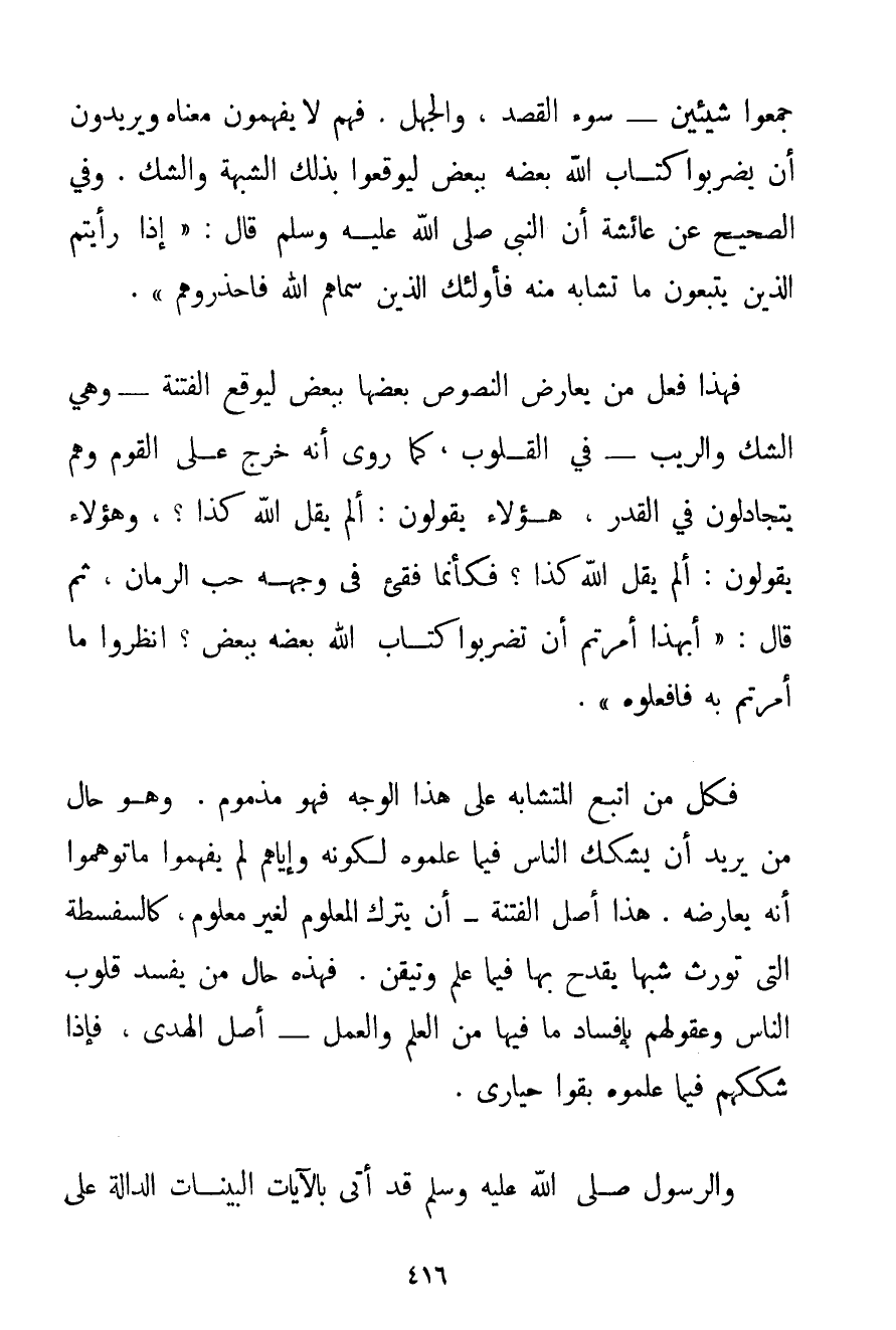 جَمَعُوا شَيْئَيْنِ سُوءَ الْقَصْدِ وَالْجَهْلِ. فَهُمْ لَا يَفْهَمُونَ مَعْنَاهُ وَيُرِيدُونَ أَنْ يَضْرِبُوا كِتَابَ اللَّهِ بَعْضَهُ بِبَعْضِ لِيُوقِعُوا بِذَلِكَ الشُّبْهَةَ وَالشَّكَّ. وَفِي الصَّحِيحِ عَنْ عَائِشَةَ أَنَّ النَّبِيَّ صَلَّى اللَّهُ عَلَيْهِ وَسَلَّمَ قَالَ: {إذَا رَأَيْتُمْ الَّذِينَ يَتَّبِعُونَ مَا تَشَابَهَ مِنْهُ فَأُولَئِكَ الَّذِينَ سَمَّاهُمْ اللَّهُ فَاحْذَرُوهُمْ} . فَهَذَا فِعْلُ مَنْ يُعَارِضُ النُّصُوصَ بَعْضَهَا بِبَعْضِ لِيُوقِعَ الْفِتْنَةَ وَهِيَ الشَّكُّ وَالرَّيْبُ فِي الْقُلُوبِ كَمَا رُوِيَ أَنَّهُ {خَرَجَ عَلَى الْقَوْمِ وَهُمْ يَتَجَادَلُونَ فِي الْقَدَرِ هَؤُلَاءِ يَقُولُونَ: أَلَمْ يَقُلْ اللَّهُ كَذَا؟ وَهَؤُلَاءِ يَقُولُونَ: أَلَمْ يَقُلْ اللَّهُ كَذَا؟ فَكَأَنَّمَا فُقِئَ فِي وَجْهِهِ حَبُّ الرُّمَّانِ ثُمَّ قَالَ: أَبِهَذَا أُمِرْتُمْ أَنْ تَضْرِبُوا كِتَابَ اللَّهِ بَعْضَهُ بِبَعْضِ؟ اُنْظُرُوا مَا أُمِرْتُمْ بِهِ فَافْعَلُوهُ} . فَكُلُّ مَنْ اتَّبَعَ الْمُتَشَابِهَ عَلَى هَذَا الْوَجْهِ فَهُوَ مَذْمُومٌ. وَهُوَ حَالُ مَنْ يُرِيدُ أَنْ يُشَكِّكَ النَّاسَ فِيمَا عَلِمُوهُ لِكَوْنِهِ وَإِيَّاهُمْ لَمْ يَفْهَمُوا مَا تَوَهَّمُوا أَنَّهُ يُعَارِضُهُ. هَذَا أَصْلُ الْفِتْنَةِ أَنْ يُتْرَكَ الْمَعْلُومُ لِغَيْرِ مَعْلُومٍ كَالسَّفْسَطَةِ الَّتِي تُورِثُ شُبَهًا يَقْدَحُ بِهَا فِيمَا عُلِمَ وَتُيُقِّنَ. فَهَذِهِ حَالُ مَنْ يُفْسِدُ قُلُوبَ النَّاسِ وَعُقُولَهُمْ بِإِفْسَادِ مَا فِيهَا مِنْ الْعِلْمِ وَالْعَمَلِ أَصْلَ الْهُدَى فَإِذَا شَكَّكَهُمْ فِيمَا عَلِمُوهُ بَقُوا حَيَارَى.
