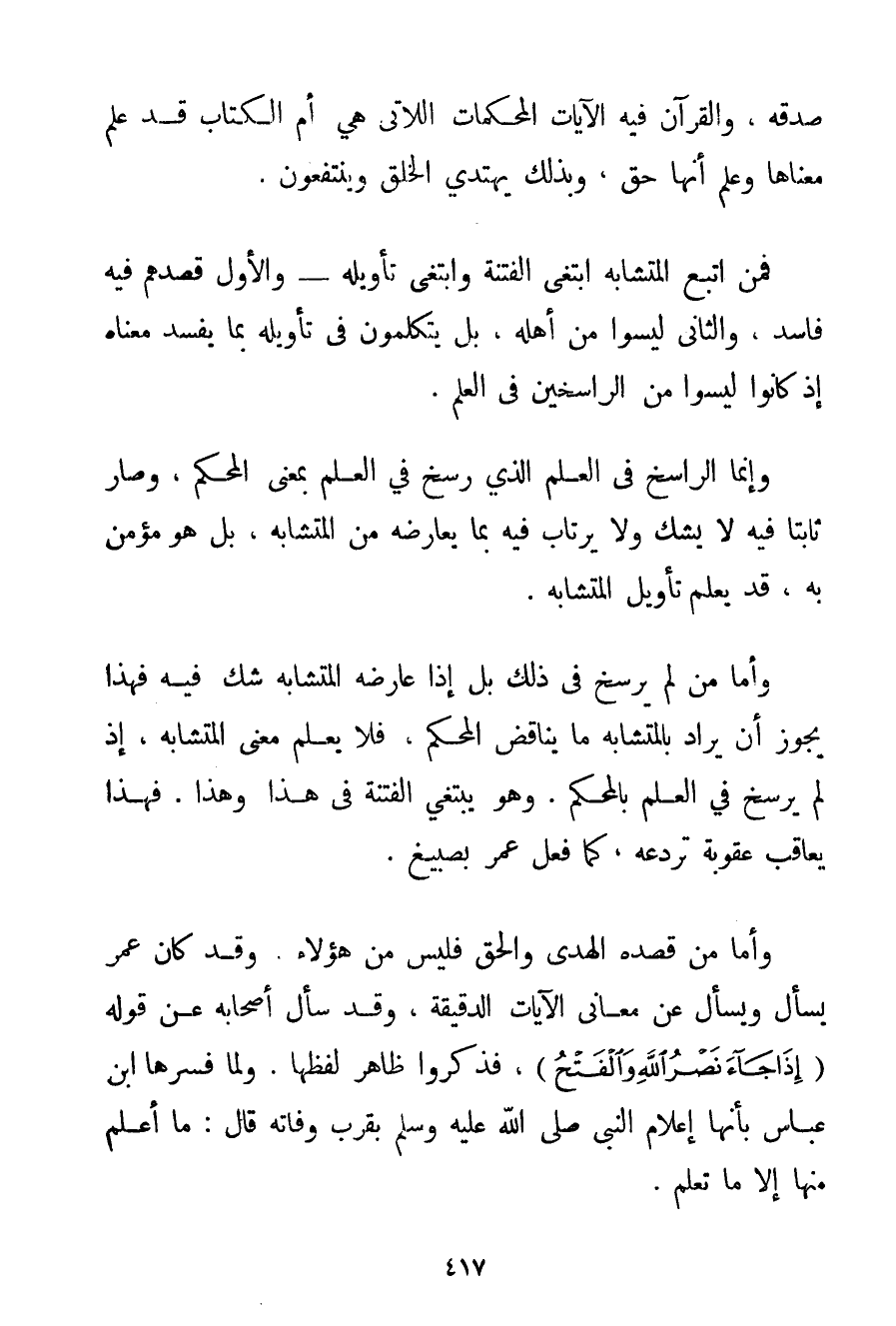 صِدْقِهِ وَالْقُرْآنُ فِيهِ الْآيَاتُ الْمُحْكَمَاتُ اللَّاتِي هِيَ أُمُّ الْكِتَابِ قَدْ عَلِمَ مَعْنَاهَا وَعَلِمَ أَنَّهَا حَقٌّ وَبِذَلِكَ يَهْتَدِي الْخَلْقُ وَيَنْتَفِعُونَ. فَمَنْ اتَّبَعَ الْمُتَشَابِهَ ابْتَغَى الْفِتْنَةَ وَابْتَغَى تَأْوِيلَهُ وَالْأَوَّلُ قَصْدُهُمْ فِيهِ فَاسِدٌ وَالثَّانِي لَيْسُوا مِنْ أَهْلِهِ بَلْ يَتَكَلَّمُونَ فِي تَأْوِيلِهِ بِمَا يُفْسِدُ مَعْنَاهُ إذْ كَانُوا لَيْسُوا مِنْ الرَّاسِخِينَ فِي الْعِلْمِ. وَإِنَّمَا الرَّاسِخُ فِي الْعِلْمِ الَّذِي رَسَخَ فِي الْعِلْمِ بِمَعْنَى الْمُحْكَمِ وَصَارَ ثَابِتًا فِيهِ لَا يَشُكُّ وَلَا يَرْتَابُ فِيهِ بِمَا يُعَارِضُهُ مِنْ الْمُتَشَابِهِ بَلْ هُوَ مُؤْمِنٌ بِهِ قَدْ يَعْلَمُونَ تَأْوِيلَ الْمُتَشَابِهِ. وَأَمَّا مَنْ لَمْ يَرْسَخْ فِي ذَلِكَ بَلْ إذَا عَارَضَهُ الْمُتَشَابِهُ شَكَّ فِيهِ فَهَذَا يَجُوزُ أَنْ يُرَادَ بِالْمُتَشَابِهِ مَا يُنَاقِضُ الْمُحْكَمَ فَلَا يَعْلَمُ مَعْنَى الْمُتَشَابِهِ إذْ لَمْ يَرْسَخْ فِي الْعِلْمِ بِالْمُحْكَمِ. وَهُوَ يَبْتَغِي الْفِتْنَةَ فِي هَذَا وَهَذَا. فَهَذَا يُعَاقَبُ عُقُوبَةً تَرْدَعُهُ كَمَا فَعَلَ عُمَرُ بِصَبِيغِ. وَأَمَّا مَنْ قَصْدُهُ الْهُدَى وَالْحَقُّ فَلَيْسَ مِنْ هَؤُلَاءِ. وَقَدْ كَانَ عُمَرُ يَسْأَلُ وَيُسْأَلُ عَنْ مَعَانِي الْآيَاتِ الدَّقِيقَةِ وَقَدْ سَأَلَ أَصْحَابَهُ عَنْ قَوْلِهِ {إذَا جَاءَ نَصْرُ اللَّهِ وَالْفَتْحُ} فَذَكَرُوا ظَاهِرَ لَفْظِهَا. وَلَمَّا فَسَّرَهَا ابْنُ عَبَّاسٍ بِأَنَّهَا إعْلَامُ النَّبِيِّ صَلَّى اللَّهُ عَلَيْهِ وَسَلَّمَ بِقُرْبِ وَفَاتِهِ قَالَ: مَا أَعْلَمُ مِنْهَا إلَّا مَا تَعْلَمُ.