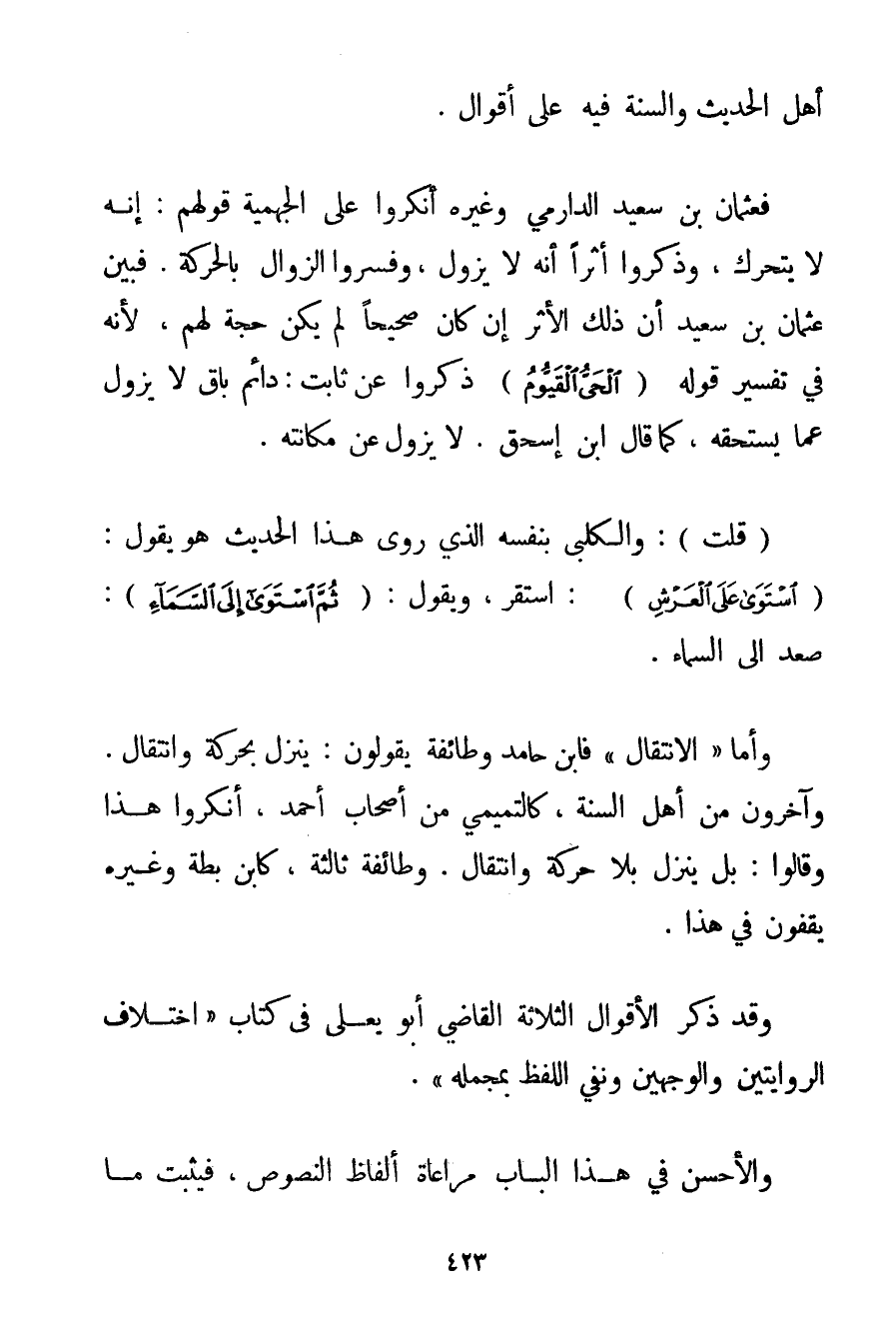 أَهْلُ الْحَدِيثِ وَالسُّنَّةِ فِيهِ عَلَى أَقْوَالٍ. فَعُثْمَانُ بْنُ سَعِيدٍ الدارمي وَغَيْرُهُ أَنْكَرُوا عَلَى الْجَهْمِيَّة قَوْلَهُمْ: إنَّهُ لَا يَتَحَرَّكُ وَذَكَرُوا أَثَرًا أَنَّهُ لَا يَزُولُ وَفَسَّرُوا الزَّوَالَ بِالْحَرَكَةِ. فَبَيَّنَّ عُثْمَانُ بْنُ سَعِيدٍ أَنَّ ذَلِكَ الْأَثَرَ إنْ كَانَ صَحِيحًا لَمْ يَكُنْ حُجَّةً لَهُمْ لِأَنَّهُ فِي تَفْسِيرِ قَوْلِهِ {الْحَيُّ الْقَيُّومُ} ذَكَرُوا عَنْ ثَابِتٍ: دَائِمٌ بَاقٍ لَا يَزُولُ عَمَّا يَسْتَحِقُّهُ كَمَا قَالَ ابْنُ إسْحَاقَ. لَا يَزُولُ عَنْ مَكَانَتِهِ. قُلْت: وَالْكَلْبِيُّ بِنَفَسِهِ الَّذِي رَوَى هَذَا الْحَدِيثَ هُوَ يَقُولُ: {اسْتَوَى عَلَى الْعَرْشِ} اسْتَقَرَّ وَيَقُولُ: {ثُمَّ اسْتَوَى إلَى السَّمَاءِ} صَعِدَ إلَى السَّمَاءِ. وَأَمَّا " الِانْتِقَالُ " فَابْنُ حَامِدٍ وَطَائِفَةٌ يَقُولُونَ: يَنْزِلُ بِحَرَكَةِ وَانْتِقَالٍ. وَآخَرُونَ مِنْ أَهْلِ السُّنَّةِ كَالتَّمِيمِيِّ مِنْ أَصْحَابِ أَحْمَد أَنْكَرُوا هَذَا وَقَالُوا: بَلْ يَنْزِلُ بِلَا حَرَكَةٍ وَانْتِقَالٍ. وَطَائِفَةٌ ثَالِثَةٌ كَابْنِ بَطَّةَ وَغَيْرِهِ يَقِفُونَ فِي هَذَا. وَقَدْ ذَكَرَ الْأَقْوَالَ الثَّلَاثَةَ الْقَاضِي أَبُو يَعْلَى فِي كِتَابِ " اخْتِلَافِ الرِّوَايَتَيْنِ وَالْوَجْهَيْنِ وَنَفْيِ اللَّفْظِ بِمُجْمَلِهِ ". وَالْأَحْسَنُ فِي هَذَا الْبَابِ مُرَاعَاةُ أَلْفَاظِ النُّصُوصِ فَيُثْبِتُ مَا