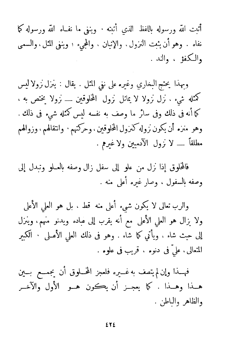 أَثْبَتَ اللَّهُ وَرَسُولُهُ بِاللَّفْظِ الَّذِي أَثْبَتَهُ وَيَنْفِي مَا نَفَاهُ اللَّهُ وَرَسُولُهُ كَمَا نَفَاهُ. وَهُوَ أَنْ يُثْبِتَ النُّزُولَ وَالْإِتْيَانَ وَالْمَجِيءَ؛ وَيَنْفِيَ الْمِثْلَ وَالسَّمِيَّ وَالْكُفُؤَ وَالنِّدَّ. وَبِهَذَا يَحْتَجُّ الْبُخَارِيُّ وَغَيْرُهُ عَلَى نَفْيِ الْمِثْلِ. يُقَالُ: يَنْزِلُ نُزُولًا لَيْسَ كَمِثْلِهِ شَيْءٌ نَزَلَ نُزُولًا لَا يُمَاثِلُ نُزُولَ الْمَخْلُوقِينَ نُزُولًا يَخْتَصُّ بِهِ كَمَا أَنَّهُ فِي ذَلِكَ وَفِي سَائِرِ مَا وَصَفَ بِهِ نَفْسَهُ لَيْسَ كَمِثْلِهِ شَيْءٌ فِي ذَلِكَ. وَهُوَ مُنَزَّهٌ أَنْ يَكُونَ نُزُولُهُ كَنُزُولِ الْمَخْلُوقِينَ وَحَرَكَتِهِمْ وَانْتِقَالِهِمْ وَزَوَالِهِمْ مُطْلَقًا لَا نُزُولَ الْآدَمِيِّينَ وَلَا غَيْرِهِمْ. فَالْمَخْلُوقُ إذَا نَزَلَ مِنْ عُلْوٍ إلَى سُفْلٍ زَالَ وَصْفُهُ بِالْعُلُوِّ وَتَبَدَّلَ إلَى وَصْفِهِ بِالسُّفُولِ وَصَارَ غَيْرُهُ أَعْلَى مِنْهُ. وَالرَّبُّ تَعَالَى لَا يَكُونُ شَيْءٌ أَعْلَى مِنْهُ قَطُّ بَلْ هُوَ الْعَلِيُّ الْأَعْلَى وَلَا يَزَالُ هُوَ الْعَلِيُّ الْأَعْلَى مَعَ أَنَّهُ يَقْرُبُ إلَى عِبَادِهِ وَيَدْنُو مِنْهُمْ وَيَنْزِلُ إلَى حَيْثُ شَاءَ وَيَأْتِي كَمَا شَاءَ. وَهُوَ فِي ذَلِكَ الْعَلِيُّ الْأَعْلَى الْكَبِيرُ الْمُتَعَالِي عَلِيٌّ فِي دُنُوِّهِ قَرِيبٌ فِي عُلُوِّهِ. فَهَذَا وَإِنْ لَمْ يَتَّصِفْ بِهِ غَيْرُهُ فَلِعَجْزِ الْمَخْلُوقِ أَنْ يَجْمَعَ بَيْنَ هَذَا وَهَذَا. كَمَا يَعْجِزُ أَنْ يَكُونَ هُوَ الْأَوَّلُ وَالْآخِرُ وَالظَّاهِرُ وَالْبَاطِنُ.