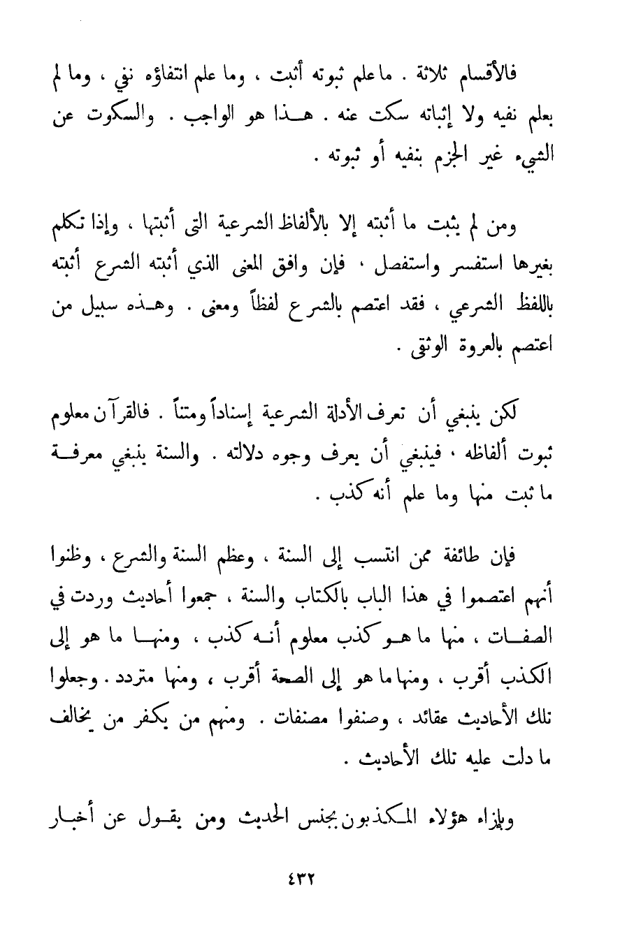 لَكِنْ يَنْبَغِي أَنْ تُعْرَفَ الْأَدِلَّةُ الشَّرْعِيَّةُ إسْنَادًا وَمَتْنًا. فَالْقُرْآنُ مَعْلُومٌ ثُبُوتَ أَلْفَاظِهِ فَيَنْبَغِي أَنْ يُعْرَفَ وُجُوهُ دَلَالَتِهِ. وَالسُّنَّةُ يَنْبَغِي مَعْرِفَةُ مَا ثَبَتَ مِنْهَا وَمَا عُلِمَ أَنَّهُ كَذِبٌ. فَإِنَّ طَائِفَةً مِمَّنْ انْتَسَبَ إلَى السُّنَّةِ وَعَظَّمَ السُّنَّةَ وَالشَّرْعَ وَظَنُّوا أَنَّهُمْ اعْتَصَمُوا فِي هَذَا الْبَابِ بِالْكِتَابِ وَالسُّنَّةِ جَمَعُوا أَحَادِيثَ وَرَدَتْ فِي الصِّفَاتِ مِنْهَا مَا هُوَ كَذِبٌ مَعْلُومٌ أَنَّهُ كَذِبٌ وَمِنْهَا مَا هُوَ إلَى الْكَذِبِ أَقْرَبُ وَمِنْهَا مَا هُوَ إلَى الصِّحَّةِ أَقْرَبُ وَمِنْهَا مُتَرَدَّدٌ. وَجَعَلُوا تِلْكَ الْأَحَادِيثَ عَقَائِدَ وَصَنَّفُوا مُصَنَّفَاتٍ. وَمِنْهُمْ مَنْ يُكَفِّرُ مَنْ يُخَالِفُ مَا دَلَّتْ عَلَيْهِ تِلْكَ الْأَحَادِيثُ. وَبِإِزَاءِ هَؤُلَاءِ الْمُكَذِّبِينَ بِجِنْسِ الْحَدِيثِ وَمَنْ يَقُولُ عَنْ أَخْبَارِ