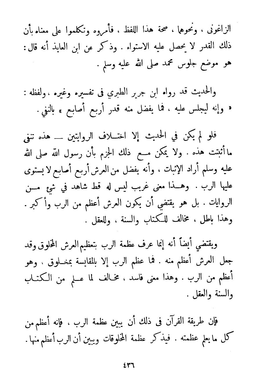 الزَّاغُونِي وَنَحْوُهُمَا صِحَّةَ هَذَا اللَّفْظَ فَأَمَرُّوهُ وَتَكَلَّمُوا عَلَى مَعْنَاهُ بِأَنَّ ذَلِكَ الْقَدْرَ لَا يَحْصُلُ عَلَيْهِ الِاسْتِوَاءُ. وَذُكِرَ عَنْ ابْنِ العايذ أَنَّهُ قَالَ: هُوَ مَوْضِعُ جُلُوسِ مُحَمَّدٍ صَلَّى اللَّهُ عَلَيْهِ وَسَلَّمَ. وَالْحَدِيثُ قَدْ رَوَاهُ ابْنُ جَرِيرٍ الطبري فِي تَفْسِيرِهِ وَغَيْرُهُ وَلَفْظُهُ: {وَإِنَّهُ لَيَجْلِسُ عَلَيْهِ فَمَا يَفْضُلُ مِنْهُ قَدْرُ أَرْبَعِ أَصَابِعَ} بِالنَّفْيِ. فَلَوْ لَمْ يَكُنْ فِي الْحَدِيثِ إلَّا اخْتِلَافُ الرِّوَايَتَيْنِ هَذِهِ تَنْفِي مَا أَثْبَتَتْ هَذِهِ. وَلَا يُمْكِنُ مَعَ ذَلِكَ الْجَزْمِ بِأَنَّ رَسُولَ اللَّهِ صَلَّى اللَّهُ عَلَيْهِ وَسَلَّمَ أَرَادَ الْإِثْبَاتَ وَأَنَّهُ يَفْضُلُ مِنْ الْعَرْشِ أَرْبَعُ أَصَابِعَ لَا يَسْتَوِي عَلَيْهَا الرَّبُّ. وَهَذَا مَعْنًى غَرِيبٌ لَيْسَ لَهُ قَطُّ شَاهِدٌ فِي شَيْءٍ مِنْ الرِّوَايَاتِ. بَلْ هُوَ يَقْتَضِي أَنْ يَكُونَ الْعَرْشُ أَعْظَمَ مِنْ الرَّبِّ وَأَكْبَرَ. وَهَذَا بَاطِلٌ مُخَالِفٌ لِلْكِتَابِ وَالسُّنَّةِ وَلِلْعَقْلِ. وَيَقْتَضِي أَيْضًا أَنَّهُ إنَّمَا عَرَفَ عَظَمَةَ الرَّبِّ بِتَعْظِيمِ الْعَرْشِ الْمَخْلُوقِ وَقَدْ جَعَلَ الْعَرْشَ أَعْظَمَ مِنْهُ. فَمَا عَظُمَ الرَّبُّ إلَّا بِالْمُقَايَسَةِ بِمَخْلُوقِ وَهُوَ أَعْظَمُ مِنْ الرَّبِّ. وَهَذَا مَعْنًى فَاسِدٌ مُخَالِفٌ لِمَا عُلِمَ مِنْ الْكِتَابِ وَالسُّنَّةِ وَالْعَقْلِ. فَإِنَّ طَرِيقَةَ الْقُرْآنِ فِي ذَلِكَ أَنْ يُبَيِّنَ عَظَمَةَ الرَّبِّ فَإِنَّهُ أَعْظَمُ مِنْ كُلِّ مَا يَعْلَمُ عَظَمَتَهُ. فَيَذْكُرُ عَظَمَةَ الْمَخْلُوقَاتِ وَيُبَيِّنُ أَنَّ الرَّبَّ أَعْظَمُ مِنْهَا.
