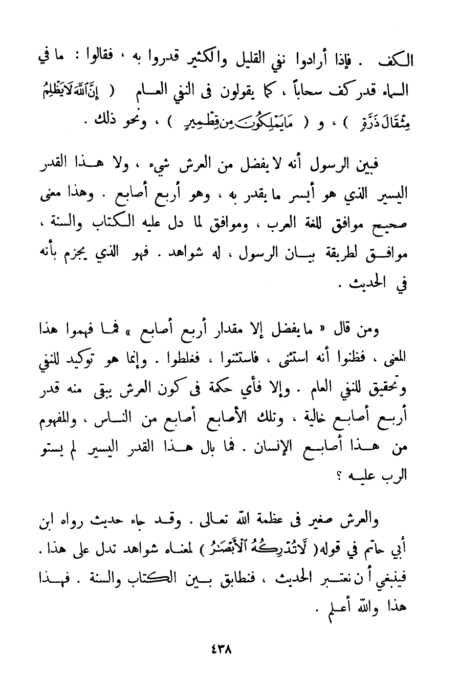 الْكَفُّ. فَإِذَا أَرَادُوا نَفْيَ الْقَلِيلِ وَالْكَثِيرِ قَدَّرُوا بِهِ فَقَالُوا: مَا فِي السَّمَاءِ قَدْرُ كَفٍّ سَحَابًا كَمَا يَقُولُونَ فِي النَّفْيِ الْعَامِّ {إنَّ اللَّهَ لَا يَظْلِمُ مِثْقَالَ ذَرَّةٍ} وَ {مَا يَمْلِكُونَ مِنْ قِطْمِيرٍ} وَنَحْوِ ذَلِكَ. فَبَيَّنَ الرَّسُولُ أَنَّهُ لَا يَفْضُلُ مِنْ الْعَرْشِ شَيْءٌ وَلَا هَذَا الْقَدْرُ الْيَسِيرُ الَّذِي هُوَ أَيْسَرُ مَا يُقَدَّرُ بِهِ وَهُوَ أَرْبَعُ أَصَابِعَ. وَهَذَا مَعْنًى صَحِيحٌ مُوَافِقٌ لِلُغَةِ الْعَرَبِ وَمُوَافِقٌ لِمَا دَلَّ عَلَيْهِ الْكِتَابُ وَالسُّنَّةُ مُوَافِقٌ لِطَرِيقَةِ بَيَانِ الرَّسُولِ لَهُ شَوَاهِدُ. فَهُوَ الَّذِي يُجْزَمُ بِأَنَّهُ فِي الْحَدِيثِ. وَمَنْ قَالَ " مَا يَفْضُلُ إلَّا مِقْدَارَ أَرْبَعِ أَصَابِعَ " فَمَا فَهِمُوا هَذَا الْمَعْنَى فَظَنُّوا أَنَّهُ اسْتَثْنَى فَاسْتَثْنَوْا فَغَلِطُوا. وَإِنَّمَا هُوَ تَوْكِيدٌ لِلنَّفْيِ وَتَحْقِيقٌ لِلنَّفْيِ الْعَامِّ. وَإِلَّا فَأَيُّ حِكْمَةٍ فِي كَوْنِ الْعَرْشِ يَبْقَى مِنْهُ قَدْرُ أَرْبَعِ أَصَابِعَ خَالِيَةٍ وَتِلْكَ الْأَصَابِعُ أَصَابِعُ مِنْ النَّاسِ وَالْمَفْهُومُ مِنْ هَذَا أَصَابِعُ الْإِنْسَانِ. فَمَا بَالُ هَذَا الْقَدْرُ الْيَسِيرُ لَمْ يَسْتَوِ الرَّبُّ عَلَيْهِ؟ وَالْعَرْشُ صَغِيرٌ فِي عَظَمَةِ اللَّهِ تَعَالَى. وَقَدْ جَاءَ حَدِيثٌ رَوَاهُ ابْنُ أَبِي حَاتِمٍ فِي قَوْلِهِ {لَا تُدْرِكُهُ الْأَبْصَارُ} لِمَعْنَاهُ شَوَاهِدُ تَدُلُّ عَلَى هَذَا. فَيَنْبَغِي أَنْ نَعْتَبِرَ الْحَدِيثَ فَنُطَابِقَ بَيْنَ الْكِتَابِ وَالسُّنَّةِ. فَهَذَا هَذَا وَاَللَّهُ أَعْلَمُ.