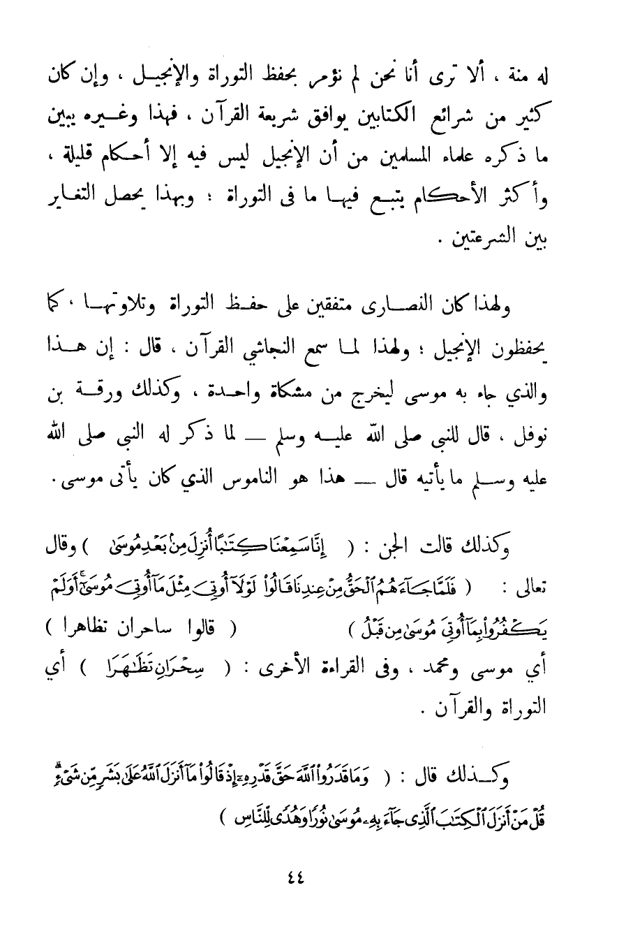 لَهُ مِنَّةً أَلَا تَرَى أَنَّا نَحْنُ لَمْ نُؤْمَرْ بِحِفْظِ التَّوْرَاةِ وَالْإِنْجِيلِ وَإِنْ كَانَ كَثِيرٌ مِنْ شَرَائِعِ الْكِتَابَيْنِ يُوَافِقُ شَرِيعَةَ الْقُرْآنِ فَهَذَا وَغَيْرُهُ يُبَيِّنُ مَا ذَكَرَهُ عُلَمَاءُ الْمُسْلِمِينَ مِنْ أَنَّ الْإِنْجِيلَ لَيْسَ فِيهِ إلَّا أَحْكَامٌ قَلِيلَةٌ وَأَكْثَرُ الْأَحْكَامِ يَتْبَعُ فِيهَا مَا فِي التَّوْرَاةِ؛ وَبِهَذَا يَحْصُلُ التَّغَايُرُ بَيْنَ الشرعتين. وَلِهَذَا كَانَ النَّصَارَى مُتَّفِقِينَ عَلَى حِفْظِ التَّوْرَاةِ وَتِلَاوَتِهَا كَمَا يَحْفَظُونَ الْإِنْجِيلَ؛ وَلِهَذَا لَمَّا سَمِعَ النَّجَاشِيُّ الْقُرْآنَ قَالَ: إنَّ هَذَا وَاَلَّذِي جَاءَ بِهِ مُوسَى لَيَخْرُجُ مِنْ مِشْكَاةٍ وَاحِدَةٍ وَكَذَلِكَ وَرَقَةُ بْنُ نَوْفَلٍ قَالَ لِلنَّبِيِّ صَلَّى اللَّهُ عَلَيْهِ وَسَلَّمَ - لَمَّا ذَكَرَ لَهُ النَّبِيُّ صَلَّى اللَّهُ عَلَيْهِ وَسَلَّمَ مَا يَأْتِيهِ قَالَ هَذَا هُوَ النَّامُوسُ الَّذِي كَانَ يَأْتِي مُوسَى. وَكَذَلِكَ قَالَتْ الْجِنُّ: {إنَّا سَمِعْنَا كِتَابًا أُنْزِلَ مِنْ بَعْدِ مُوسَى} وَقَالَ تَعَالَى: {فَلَمَّا جَاءَهُمُ الْحَقُّ مِنْ عِنْدِنَا قَالُوا لَوْلَا أُوتِيَ مِثْلَ مَا أُوتِيَ مُوسَى أَوَلَمْ يَكْفُرُوا بِمَا أُوتِيَ مُوسَى مِنْ قَبْلُ} قَالُوا سَاحِرَانِ تَظَاهَرَا أَيْ مُوسَى وَمُحَمَّدٌ وَفِي الْقِرَاءَةِ الْأُخْرَى: {سِحْرَانِ تَظَاهَرَا} أَيْ التَّوْرَاةُ وَالْقُرْآنُ. وَكَذَلِكَ قَالَ: {وَمَا قَدَرُوا اللَّهَ حَقَّ قَدْرِهِ إذْ قَالُوا مَا أَنْزَلَ اللَّهُ عَلَى بَشَرٍ مِنْ شَيْءٍ قُلْ مَنْ أَنْزَلَ الْكِتَابَ الَّذِي جَاءَ بِهِ