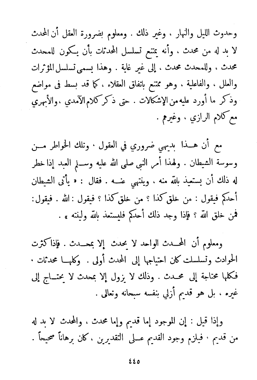 وَحُدُوثِ اللَّيْلِ وَالنَّهَارِ وَغَيْرِ ذَلِكَ. وَمَعْلُومٌ بِضَرُورَةِ الْعَقْلِ أَنَّ الْمُحْدَثَ لَا بُدَّ لَهُ مِنْ مُحْدِثٍ وَأَنَّهُ يَمْتَنِعُ تَسَلْسُلُ الْمُحْدَثَاتِ بِأَنْ يَكُونَ لِلْمُحْدَثِ مُحْدِثٌ وَلِلْمُحْدَثِ مُحْدِثٌ إلَى غَيْرِ غَايَةٍ. وَهَذَا يُسَمَّى تَسَلْسُلَ الْمُؤَثِّرَاتِ وَالْعِلَلِ وَالْفَاعِلِيَّةِ وَهُوَ مُمْتَنِعٌ بِاتِّفَاقِ الْعُقَلَاءِ كَمَا قَدْ بُسِطَ فِي مَوَاضِعَ وَذُكِرَ مَا أَوْرَدَ عَلَيْهِ مِنْ الْإِشْكَالَاتِ. حَتَّى ذُكِرَ كَلَامُ الآمدي والأبهري مَعَ كَلَامِ الرَّازِي وَغَيْرِهِمْ. مَعَ أَنَّ هَذَا بَدِيهِيٌّ ضَرُورِيٌّ فِي الْعُقُولِ وَتِلْكَ الْخَوَاطِرُ مِنْ وَسْوَسَةِ الشَّيْطَانِ. وَلِهَذَا أَمَرَ النَّبِيُّ صَلَّى اللَّهُ عَلَيْهِ وَسَلَّمَ الْعَبْدَ إذَا خَطَرَ لَهُ ذَلِكَ أَنْ يَسْتَعِيذَ بِاَللَّهِ مِنْهُ وَيَنْتَهِيَ عَنْهُ. فَقَالَ: {يَأْتِي الشَّيْطَانُ أَحَدَكُمْ فَيَقُولُ: مَنْ خَلَقَ كَذَا؟ مَنْ خَلَقَ كَذَا؟ فَيَقُولُ: اللَّهُ. فَيَقُولُ: فَمَنْ خَلَقَ اللَّهَ؟ فَإِذَا وَجَدَ ذَلِكَ أَحَدُكُمْ فَلْيَسْتَعِذْ بِاَللَّهِ وَلْيَنْتَهِ} . وَمَعْلُومٌ أَنَّ الْمُحْدِثَ الْوَاحِدَ لَا يُحْدِثُ إلَّا بِمُحْدِثِ. فَإِذَا كَثُرَتْ الْحَوَادِثُ وَتَسَلْسَلَتْ كَانَ احْتِيَاجُهَا إلَى الْمُحْدِثِ أَوْلَى. وَكُلُّهَا مُحْدَثَاتٌ فَكُلُّهَا مُحْتَاجَةٌ إلَى مُحْدِثٍ. وَذَلِكَ لَا يَزُولُ إلَّا بِمُحْدِثِ لَا يَحْتَاجُ إلَى غَيْرِهِ بَلْ هُوَ قَدِيمٌ أَزَلِيٌّ بِنَفْسِهِ سُبْحَانَهُ وَتَعَالَى. وَإِذَا قِيلَ: إنَّ الْمَوْجُودَ إمَّا قَدِيمٌ وَإِمَّا مُحْدَثٌ وَالْمُحْدَثُ لَا بُدَّ لَهُ مِنْ قَدِيمٍ فَيَلْزَمُ وُجُودُ الْقَدِيمِ عَلَى التَّقْدِيرَيْنِ كَانَ بُرْهَانًا صَحِيحًا.