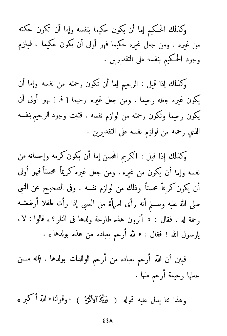 وَفِي الصَّحِيحِ عَنْ النَّبِيِّ صَلَّى اللَّهُ عَلَيْهِ وَسَلَّمَ {أَنَّهُ رَأَى امْرَأَةً مِنْ السَّبْيِ إذَا رَأَتْ طِفْلًا أَرْضَعْته رَحْمَةً لَهُ فَقَالَ: أَتَرَوْنَ هَذِهِ طَارِحَةً وَلَدَهَا فِي النَّارِ؟ قَالُوا: لَا يَا رَسُولَ اللَّهِ فَقَالَ: لَلَّهُ أَرْحَمُ بِعِبَادِهِ مِنْ هَذِهِ بِوَلَدِهَا} . فَبَيَّنَ أَنَّ اللَّهَ أَرْحَمُ بِعِبَادِهِ مِنْ أَرْحَمِ الْوَالِدَاتِ بِوَلَدِهَا. فَإِنَّهُ مَنْ جَعَلَهَا رَحِيمَةً أَرْحَمُ مِنْهَا. وَهَذَا مِمَّا يَدُلُّ عَلَيْهِ قَوْلُهُ {وَرَبُّكَ الْأَكْرَمُ} وَقَوْلُنَا " اللَّهُ أَكْبَرُ "