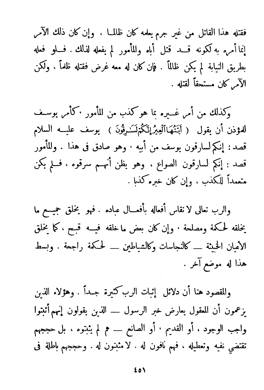 فَقَتَلَهُ هَذَا الْقَاتِلُ مِنْ غَيْرِ جُرْمٍ يَعْلَمُهُ كَانَ ظَالِمًا وَإِنْ كَانَ ذَلِكَ الْآمِرُ إنَّمَا أَمَرَهُ بِهِ لِكَوْنِهِ قَدْ قَتَلَ أَبَاهُ وَالْمَأْمُورُ لَمْ يَفْعَلْهُ لِذَلِكَ. فَلَوْ فَعَلَهُ بِطَرِيقِ النِّيَابَةِ لَمْ يَكُنْ ظَالِمًا. فَإِنْ كَانَ لَهُ مَعَهُ غَرَضٌ فَقَتَلَهُ ظُلْمًا وَلَكِنَّ الْآمِرَ كَانَ مُسْتَحِقًّا لِقَتْلِهِ. وَكَذَلِكَ مَنْ أَمَرَ غَيْرَهُ بِمَا هُوَ كَذِبٌ مِنْ الْمَأْمُورِ كَأَمْرِ يُوسُفَ لِلْمُؤَذِّنِ أَنْ يَقُولَ {أَيَّتُهَا الْعِيرُ إنَّكُمْ لَسَارِقُونَ} يُوسُفُ عَلَيْهِ السَّلَامُ قَصَدَ. إنَّكُمْ لَسَارِقُونَ يُوسُفَ مِنْ أَبِيهِ وَهُوَ صَادِقٌ فِي هَذَا. وَالْمَأْمُورُ قَصَدَ: إنَّكُمْ لَسَارِقُونَ الصُّوَاعَ وَهُوَ يَظُنُّ أَنَّهُمْ سَرَقُوهُ فَلَمْ يَكُنْ مُتَعَمِّدًا لِلْكَذِبِ وَإِنْ كَانَ خَبَرُهُ كَذِبًا. وَالرَّبُّ تَعَالَى لَا تُقَاسُ أَفْعَالُهُ بِأَفْعَالِ عِبَادِهِ. فَهُوَ يَخْلُقُ جَمِيعَ مَا يَخْلُقُهُ لِحِكْمَةِ وَمَصْلَحَةٍ وَإِنْ كَانَ بَعْضُ مَا خَلَقَهُ فِيهِ قُبْحٌ كَمَا يَخْلُقُ الْأَعْيَانَ الْخَبِيثَةَ كَالنَّجَاسَاتِ وَكَالشَّيَاطِينِ لِحِكْمَةِ رَاجِحَةٍ. وَبَسْطُ هَذَا لَهُ مَوْضِعٌ آخَرُ. وَالْمَقْصُودُ هُنَا أَنَّ دَلَائِلَ إثْبَاتِ الرَّبِّ كَثِيرَةٌ جِدًّا. وَهَؤُلَاءِ الَّذِينَ يَزْعُمُونَ أَنَّ الْمَعْقُولَ يُعَارِضُ خَبَرَ الرَّسُولِ الَّذِينَ يَقُولُونَ إنَّهُمْ أَثْبَتُوا وَاجِبَ الْوُجُودِ أَوْ الْقَدِيمَ أَوْ الصَّانِعَ هُمْ لَمْ يُثْبِتُوهُ بَلْ حُجَجُهُمْ تَقْتَضِي نَفْيَهُ وَتَعْطِيلَهُ فَهُمْ نَافُونَ لَهُ. لَا مُثْبِتُونَ لَهُ. وَحُجَجُهُمْ بَاطِلَةٌ