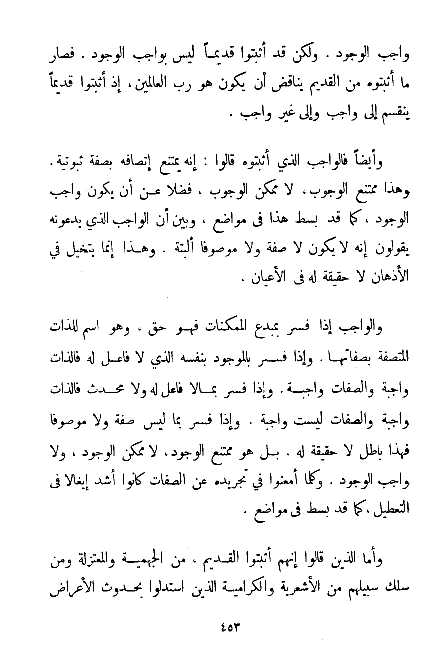 وَاجِبُ الْوُجُودِ. وَلَكِنْ قَدْ أَثْبَتُوا قَدِيمًا لَيْسَ بِوَاجِبِ الْوُجُودِ. فَصَارَ مَا أَثْبَتُوهُ مِنْ الْقَدِيمِ يُنَاقِضُ أَنْ يَكُونَ هُوَ رَبَّ الْعَالَمِينَ إذْ أَثْبَتُوا قَدِيمًا يَنْقَسِمُ إلَى وَاجِبٍ وَإِلَى غَيْرِ وَاجِبٍ. وَأَيْضًا فَالْوَاجِبُ الَّذِي أَثْبَتُوهُ قَالُوا: إنَّهُ يَمْتَنِعُ اتِّصَافُهُ بِصِفَةِ ثُبُوتِيَّةٍ. وَهَذَا مُمْتَنِعُ الْوُجُوبِ لَا مُمْكِنُ الْوُجُوبِ فَضْلًا عَنْ أَنْ يَكُونَ وَاجِبَ الْوُجُودِ كَمَا قَدْ بُسِطَ هَذَا فِي مَوَاضِعَ وَبَيَّنَ أَنَّ الْوَاجِبَ الَّذِي يَدَّعُونَهُ يَقُولُونَ إنَّهُ لَا يَكُونُ لَا صِفَةً وَلَا مَوْصُوفًا أَلْبَتَّةَ. وَهَذَا إنَّمَا يَتَخَيَّلُ فِي الْأَذْهَانِ لَا حَقِيقَةَ لَهُ فِي الْأَعْيَانِ. وَالْوَاجِبُ إذَا فُسِّرَ بِمُبْدِعِ الْمُمَكَّنَاتِ فَهُوَ حَقٌّ وَهُوَ اسْمٌ لِلَّذَّاتِ الْمُتَّصِفَةِ بِصِفَاتِهَا. وَإِذَا فُسِّرَ بِالْمَوْجُودِ بِنَفَسِهِ الَّذِي لَا فَاعِلَ لَهُ فَالذَّاتُ وَاجِبَةٌ وَالصِّفَاتُ وَاجِبَةٌ. وَإِذَا فُسِّرَ بِمَا لَا فَاعِلَ لَهُ وَلَا مُحْدِثَ فَالذَّاتُ وَاجِبَةٌ وَالصِّفَاتُ لَيْسَتْ وَاجِبَةً. وَإِذَا فُسِّرَ بِمَا لَيْسَ صِفَةً وَلَا مَوْصُوفًا فَهَذَا بَاطِلٌ لَا حَقِيقَةَ لَهُ. بَلْ هُوَ مُمْتَنِعُ الْوُجُودِ لَا مُمْكِنَ الْوُجُودِ وَلَا وَاجِبَ الْوُجُودِ. وَكُلَّمَا أَمْعَنُوا فِي تَجْرِيدِهِ عَنْ الصِّفَاتِ كَانُوا أَشَدَّ إيغَالًا فِي التَّعْطِيلِ كَمَا قَدْ بُسِطَ فِي مَوَاضِعَ. وَأَمَّا الَّذِينَ قَالُوا إنَّهُمْ أَثْبَتُوا الْقَدِيمَ مِنْ الْجَهْمِيَّة وَالْمُعْتَزِلَةِ وَمَنْ سَلَكَ سَبِيلَهُمْ مِنْ الْأَشْعَرِيَّةِ والكَرَّامِيَة الَّذِينَ اسْتَدَلُّوا بِحُدُوثِ الْأَعْرَاضِ