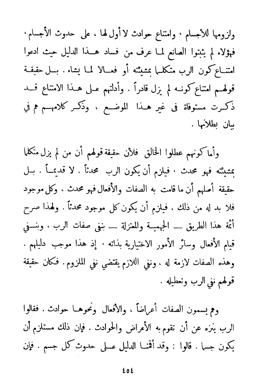 وَلُزُومِهَا لِلْأَجْسَامِ وَامْتِنَاعِ حَوَادِثَ لَا أَوَّلَ لَهَا عَلَى حُدُوثِ الْأَجْسَامِ فَهَؤُلَاءِ لَمْ يُثْبِتُوا الصَّانِعَ لِمَا عُرِفَ مِنْ فَسَادِ هَذَا الدَّلِيلِ حَيْثُ ادَّعَوْا امْتِنَاعَ كَوْنِ الرَّبِّ مُتَكَلِّمًا بِمَشِيئَتِهِ أَوْ فَعَّالًا لِمَا يَشَاءُ. بَلْ حَقِيقَةُ قَوْلِهِمْ امْتِنَاعُ كَوْنِهِ لَمْ يَزَلْ قَادِرًا. وَأَدِلَّتُهُمْ عَلَى هَذَا الِامْتِنَاعِ قَدْ ذُكِرَتْ مُسْتَوْفَاةً فِي غَيْرِ هَذَا الْمَوْضِعِ وَذُكِرَ كَلَامُهُمْ هُمْ فِي بَيَانِ بُطْلَانِهَا. وَأَمَّا كَوْنُهُمْ عَطَّلُوا الْخَالِقَ فَلِأَنَّ حَقِيقَةَ قَوْلِهِمْ أَنَّ مَنْ لَمْ يَزَلْ مُتَكَلِّمًا بِمَشِيئَتِهِ فَهُوَ مُحْدِثٌ فَيَلْزَمُ أَنْ يَكُونَ الرَّبُّ مُحْدِثًا لَا قَدِيمًا. بَلْ حَقِيقَةُ أَصْلِهِمْ أَنَّ مَا قَامَتْ بِهِ الصِّفَاتُ وَالْأَفْعَالُ فَهُوَ مُحْدَثٌ وَكُلُّ مَوْجُودٍ فَلَا بُدَّ لَهُ مِنْ ذَلِكَ فَيَلْزَمُ أَنْ يَكُونَ كُلُّ مَوْجُودٍ مُحْدِثًا. وَلِهَذَا صَرَّحَ أَئِمَّةُ هَذَا الطَّرِيقِ الْجَهْمِيَّة وَالْمُعْتَزِلَةُ بِنَفْيِ صِفَاتِ الرَّبِّ وَبِنَفْيِ قِيَامِ الْأَفْعَالِ وَسَائِرِ الْأُمُورِ الِاخْتِيَارِيَّةِ بِذَاتِهِ إذْ هَذَا مُوجَبُ دَلِيلِهِمْ. وَهَذِهِ الصِّفَاتُ لَازِمَةٌ لَهُ وَنَفْيُ اللَّازِمِ يَقْتَضِي نَفْيَ الْمَلْزُومِ. فَكَانَ حَقِيقَةُ قَوْلِهِمْ نَفْيَ الرَّبِّ وَتَعْطِيلَهُ. وَهُمْ يُسَمُّونَ الصِّفَاتِ أَعْرَاضًا وَالْأَفْعَالَ وَنَحْوَهَا حَوَادِثَ. فَقَالُوا الرَّبُّ يُنَزَّهُ عَنْ أَنْ تَقُومَ بِهِ الْأَعْرَاضُ وَالْحَوَادِثُ. فَإِنَّ ذَلِكَ مُسْتَلْزِمٌ أَنْ يَكُونَ جِسْمًا. قَالُوا: وَقَدْ أَقَمْنَا الدَّلِيلَ عَلَى حُدُوثِ كُلِّ جِسْمٍ. فَإِنَّ