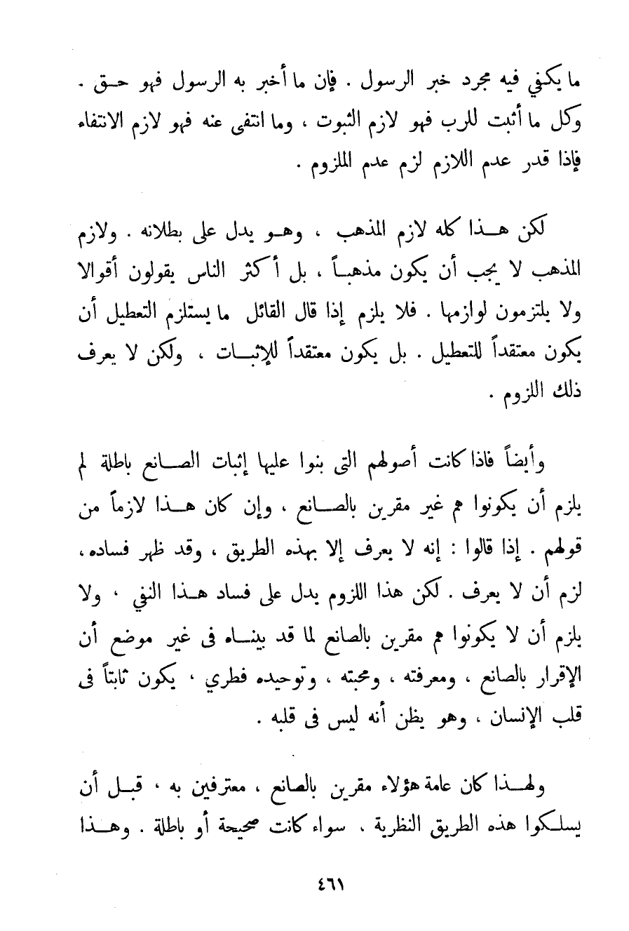 مَا يَكْفِي فِيهِ مُجَرَّدُ خَبَرِ الرَّسُولِ. فَإِنَّ مَا أَخْبَرَ بِهِ الرَّسُولُ فَهُوَ حَقٌّ. وَكُلُّ مَا أَثْبَتَ لِلرَّبِّ فَهُوَ لَازِمُ الثُّبُوتِ وَمَا انْتَفَى عَنْهُ فَهُوَ لَازِمُ الِانْتِفَاءِ فَإِذَا قَدَّرَ عَدَمَ اللَّازِمِ لَزِمَ عَدَمُ الْمَلْزُومِ. لَكِنَّ هَذَا كُلَّهُ لَازِمُ الْمَذْهَبِ وَهُوَ يَدُلُّ عَلَى بُطْلَانِهِ. وَلَازِمُ الْمَذْهَبِ لَا يَجِبُ أَنْ يَكُونَ مَذْهَبًا بَلْ أَكْثَرُ النَّاسِ يَقُولُونَ أَقْوَالًا وَلَا يَلْتَزِمُونَ لَوَازِمَهَا. فَلَا يَلْزَمُ إذَا قَالَ الْقَائِلُ مَا يَسْتَلْزِمُ التَّعْطِيلَ أَنْ يَكُونَ مُعْتَقِدًا لِلتَّعْطِيلِ. بَلْ يَكُونُ مُعْتَقِدًا لِلْإِثْبَاتِ وَلَكِنْ لَا يُعْرَفُ ذَلِكَ اللُّزُومُ. وَأَيْضًا فَإِذَا كَانَتْ أُصُولُهُمْ الَّتِي بَنَوْا عَلَيْهَا إثْبَاتَ الصَّانِعِ بَاطِلَةً لَمْ يَلْزَمْ أَنْ يَكُونُوا هُمْ غَيْرَ مُقِرِّينَ بِالصَّانِعِ وَإِنْ كَانَ هَذَا لَازِمًا مِنْ قَوْلِهِمْ. إذَا قَالُوا: إنَّهُ لَا يُعْرَفُ إلَّا بِهَذِهِ الطَّرِيقِ وَقَدْ ظَهَرَ فَسَادُهُ لَزِمَ أَنْ لَا يُعْرَفَ. لَكِنَّ هَذَا اللُّزُومَ يَدُلُّ عَلَى فَسَادِ هَذَا النَّفْيِ وَلَا يَلْزَمُ أَنْ لَا يَكُونُوا هُمْ مُقِرِّينَ بِالصَّانِعِ لِمَا قَدْ بَيَّنَّاهُ فِي غَيْرِ مَوْضِعٍ أَنَّ الْإِقْرَارَ بِالصَّانِعِ وَمَعْرِفَتَهُ وَمَحَبَّتَهُ وَتَوْحِيدَهُ فِطْرِيٌّ يَكُونُ ثَابِتًا فِي قَلْبِ الْإِنْسَانِ وَهُوَ يَظُنُّ أَنَّهُ لَيْسَ فِي قَلْبِهِ. وَلِهَذَا كَانَ عَامَّةُ هَؤُلَاءِ مُقِرِّينَ بِالصَّانِعِ مُعْتَرِفِينَ بِهِ قَبْلَ أَنْ يَسْلُكُوا هَذِهِ الطَّرِيقَ النَّظَرِيَّةَ سَوَاءٌ كَانَتْ صَحِيحَةً أَوْ بَاطِلَةً. وَهَذَا