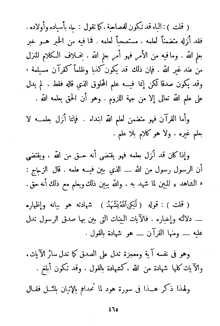 قُلْت: الْبَاءُ قَدْ يَكُونُ لِلْمُصَاحَبَةِ كَمَا تَقُولُ: جَاءَ بِأَسْيَادِهِ وَأَوْلَادِهِ. فَقَدْ أَنْزَلَهُ مُتَضَمِّنًا لِعِلْمِهِ مُسْتَصْحِبًا لِعِلْمِهِ. فَمَا فِيهِ مِنْ الْخَبَرِ هُوَ خَبَرٌ بِعِلْمِ اللَّهِ. وَمَا فِيهِ مِنْ الْأَمْرِ فَهُوَ أَمْرٌ بِعِلْمِ اللَّهِ بِخِلَافِ الْكَلَامِ الْمُنَزَّلِ مِنْ عِنْدِ غَيْرِ اللَّهِ. فَإِنَّ ذَلِكَ قَدْ يَكُونُ كَذِبًا وَظُلْمًا كَقُرْآنِ مُسَيْلِمَةَ وَقَدْ يَكُونُ صِدْقًا لَكِنَّ إنَّمَا فِيهِ عِلْمُ الْمَخْلُوقِ الَّذِي قَالَهُ فَقَطْ لَمْ يَدُلَّ عَلَى عِلْمِ اللَّه تَعَالَى إلَّا مِنْ جِهَةِ اللُّزُومِ. وَهُوَ أَنَّ الْحَقَّ يَعْلَمُهُ اللَّهُ. وَأَمَّا الْقُرْآنُ فَهُوَ مُتَضَمِّنٌ لِعِلْمِ اللَّهِ ابْتِدَاءً: فَإِنَّمَا أَنْزَلَ بِعِلْمِهِ لَا بِعِلْمِ غَيْرِهِ وَلَا هُوَ كَلَامٌ بِلَا عِلْمٍ. وَإِذَا كَانَ قَدْ أَنْزَلَ بِعِلْمِهِ فَهُوَ يَقْتَضِي أَنَّهُ حَقٌّ مِنْ اللَّهِ وَيَقْتَضِي أَنَّ الرَّسُولَ رَسُولٌ مِنْ اللَّهِ الَّذِي بَيَّنَ فِيهِ عِلْمَهُ. قَالَ الزَّجَّاجُ: " الشَّاهِدُ " الْمُبَيِّنُ لِمَا شَهِدَ بِهِ وَاَللَّهُ يُبَيِّنُ ذَلِكَ وَيَعْلَمُ مَعَ ذَلِكَ أَنَّهُ حَقٌّ. (قُلْت: قَوْلُهُ {لَكِنِ اللَّهُ يَشْهَدُ} شَهَادَتُهُ هُوَ بَيَانُهُ وَإِظْهَارُهُ دَلَالَتُهُ وَإِخْبَارُهُ. فَالْآيَاتُ الْبَيِّنَاتُ الَّتِي بَيَّنَ بِهَا صِدْقَ الرَّسُولِ تَدُلُّ عَلَيْهِ وَمِنْهَا الْقُرْآنُ هُوَ شَهَادَةٌ بِالْقَوْلِ. وَهُوَ فِي نَفْسِهِ آيَةٌ وَمُعْجِزَةٌ تَدُلُّ عَلَى الصِّدْقِ كَمَا تَدُلُّ سَائِرُ الْآيَاتِ وَالْآيَاتُ كُلُّهَا شَهَادَةٌ مِنْ اللَّهِ كَشَهَادَةِ بِالْقَوْلِ وَقَدْ تَكُونُ أَبْلَغَ. وَلِهَذَا ذَكَرَ هَذَا فِي سُورَةِ هُودٍ لَمَّا تَحَدَّاهُمْ بِالْإِتْيَانِ بِالْمِثْلِ فَقَالَ