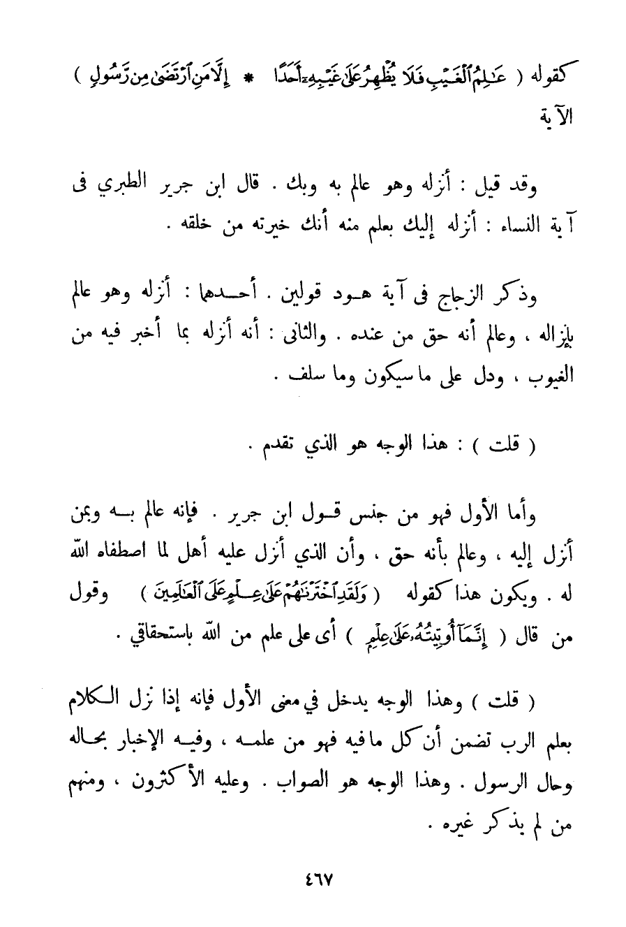 كَقَوْلِهِ {عَالِمُ الْغَيْبِ فَلَا يُظْهِرُ عَلَى غَيْبِهِ أَحَدًا} {إلَّا مَنِ ارْتَضَى مِنْ رَسُولٍ} الْآيَةَ وَقَدْ قِيلَ: أَنْزَلَهُ وَهُوَ عَالِمٌ بِهِ وَبِك. قَالَ ابْنُ جَرِيرٍ الطبري فِي آيَةِ النِّسَاءِ: أَنْزَلَهُ إلَيْك بِعِلْمِ مِنْهُ أَنَّك خِيرَتَهُ مِنْ خَلْقِهِ. وَذَكَرَ الزَّجَّاجُ فِي آيَةِ هُودٍ قَوْلَيْنِ أَحَدِهِمَا: أَنْزَلَهُ وَهُوَ عَالِمٌ بِإِنْزَالِهِ وَعَالِمٌ أَنَّهُ حَقٌّ مِنْ عِنْدِهِ. وَالثَّانِي: أَنَّهُ أَنْزَلَهُ بِمَا أَخْبَرَ فِيهِ مِنْ الْغُيُوبِ وَدَلَّ عَلَى مَا سَيَكُونُ وَمَا سَلَفَ. (قُلْت: هَذَا الْوَجْهُ هُوَ الَّذِي تُقَدَّمُ. وَأَمَّا الْأَوَّلُ فَهُوَ مِنْ جِنْسِ قَوْلِ ابْنِ جَرِيرٍ. فَإِنَّهُ عَالِمٌ بِهِ وَبِمَنْ أَنْزَلَ إلَيْهِ وَعَالِمٌ بِأَنَّهُ حَقٌّ وَأَنَّ الَّذِي أَنْزَلَ عَلَيْهِ أَهْلٌ لِمَا اصْطَفَاهُ اللَّهُ لَهُ وَيَكُونُ هَذَا كَقَوْلِهِ {وَلَقَدِ اخْتَرْنَاهُمْ عَلَى عِلْمٍ عَلَى الْعَالَمِينَ} وَقَوْلِ مَنْ قَالَ {إنَّمَا أُوتِيتُهُ عَلَى عِلْمٍ} أَيْ عَلَى عِلْمٍ مِنْ اللَّهِ بِاسْتِحْقَاقِي. (قُلْت وَهَذَا الْوَجْهُ يَدْخُلُ فِي مَعْنَى الْأَوَّلِ فَإِنَّهُ إذَا نَزَلَ الْكَلَامُ بِعِلْمِ الرَّبِّ تَضَمَّنَ أَنَّ كُلَّ مَا فِيهِ فَهُوَ مِنْ عِلْمِهِ وَفِيهِ الْإِخْبَارُ بِحَالِهِ وَحَالِ الرَّسُولِ. وَهَذَا الْوَجْهُ هُوَ الصَّوَابُ. وَعَلَيْهِ الْأَكْثَرُونَ وَمِنْهُمْ مَنْ لَمْ يَذْكُرْ غَيْرَهُ.