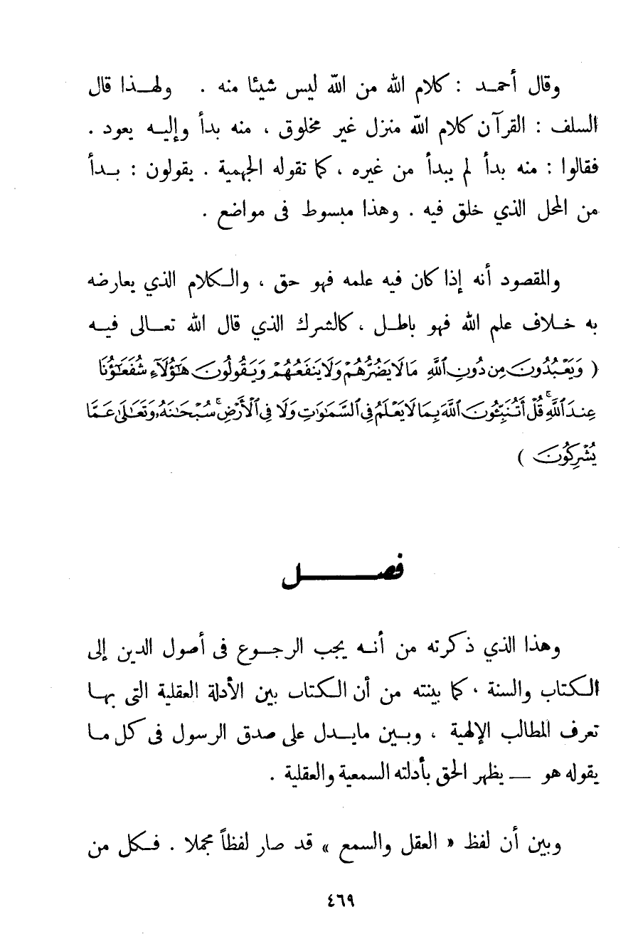 وَهَذَا الَّذِي ذَكَرْته مِنْ أَنَّهُ يَجِبُ الرُّجُوعُ فِي أُصُولِ الدِّينِ إلَى الْكِتَاب وَالسُّنَّةِ كَمَا بَيَّنَتْهُ مِنْ أَنَّ الْكِتَابَ بَيَّنَ الْأَدِلَّةَ الْعَقْلِيَّةَ الَّتِي بِهَا تُعْرَفُ الْمَطَالِبُ الْإِلَهِيَّةُ وَبَيَّنَ مَا يَدُلُّ عَلَى صِدْقِ الرَّسُولِ فِي كُلِّ مَا يَقُولُهُ هُوَ يُظْهِرُ الْحَقَّ بِأَدِلَّتِهِ السَّمْعِيَّةِ وَالْعَقْلِيَّةِ. وَبَيَّنَ أَنَّ لَفْظَ " الْعَقْلِ وَالسَّمْعِ " قَدْ صَارَ لَفْظًا مُجْمَلًا. فَكُلُّ مَنْ