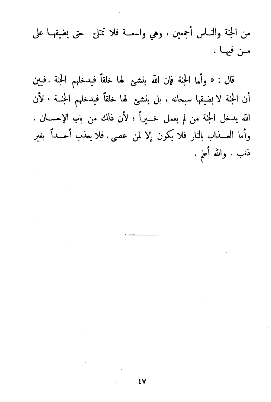 مِنْ الْجِنَّةِ وَالنَّاسِ أَجْمَعِينَ وَهِيَ وَاسِعَةٌ فَلَا تَمْتَلِئُ حَتَّى يُضَيِّقَهَا عَلَى مَنْ فِيهَا. قَالَ: " وَأَمَّا الْجَنَّةُ فَإِنَّ اللَّهَ يُنْشِئُ لَهَا خَلْقًا فَيُدْخِلُهُمْ الْجَنَّةَ. فَبَيَّنَ أَنَّ الْجَنَّةَ لَا يُضَيِّقُهَا سُبْحَانَهُ بَلْ يُنْشِئُ لَهَا خَلْقًا فَيُدْخِلُهُمْ الْجَنَّةَ لِأَنَّ اللَّهَ يُدْخِلُ الْجَنَّةَ مَنْ لَمْ يَعْمَلْ خَيْرًا؛ لِأَنَّ ذَلِكَ مِنْ بَابِ الْإِحْسَانِ. وَأَمَّا الْعَذَابُ بِالنَّارِ فَلَا يَكُونُ إلَّا لِمَنْ عَصَى فَلَا يُعَذِّبُ أَحَدًا بِغَيْرِ ذَنْبٍ. وَاَللَّهُ أَعْلَمُ.