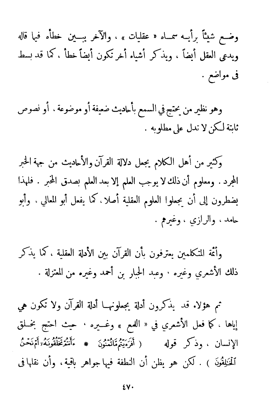 وَضَعَ شَيْئًا بِرَأْيِهِ سَمَّاهُ " عَقْلِيَّاتٍ " وَالْآخَرُ يُبَيِّنُ خَطَأَهُ فِيمَا قَالَهُ وَيَدَّعِي الْعَقْلَ أَيْضًا وَيَذْكُرُ أَشْيَاءَ أُخَرَ تَكُونُ أَيْضًا خَطَأً كَمَا قَدْ بُسِطَ فِي مَوَاضِعَ. وَهُوَ نَظِيرُ مَنْ يَحْتَجُّ فِي السَّمْعِ بِأَحَادِيثَ ضَعِيفَةٍ أَوْ مَوْضُوعَةٍ أَوْ نُصُوصٍ ثَابِتَةٍ لَكِنْ لَا تَدُلُّ عَلَى مَطْلُوبِهِ. وَكَثِيرٌ مِنْ أَهْلِ الْكَلَامِ يَجْعَلُ دَلَالَةَ الْقُرْآنِ وَالْأَحَادِيثِ مِنْ جِهَةِ الْخَبَرِ الْمُجَرَّدِ. وَمَعْلُومٌ أَنَّ ذَلِكَ لَا يُوجِبُ الْعِلْمَ إلَّا بَعْدَ الْعِلْمِ بِصِدْقِ الْمُخْبِرِ. فَلِهَذَا يَضْطَرُّونَ إلَى أَنْ يَجْعَلُوا الْعُلُومَ الْعَقْلِيَّةَ أَصْلًا كَمَا يَفْعَلُ أَبُو الْمَعَالِي وَأَبُو حَامِد وَالرَّازِي وَغَيْرهمْ. وَأَئِمَّة الْمُتَكَلِّمِينَ يَعْتَرِفُونَ بِأَنَّ الْقُرْآنَ بَيْنَ الْأَدِلَّةِ الْعَقْلِيَّةِ كَمَا يَذْكُرُ ذَلِكَ الْأَشْعَرِيّ وَغَيْره وَعَبْد الْجَبَّار بْن أَحْمَد وَغَيْره مِنْ الْمُعْتَزِلَة. ثُمَّ هَؤُلَاءِ قَدْ يَذْكُرُونَ أَدِلَّةً يَجْعَلُونَهَا أَدِلَّة الْقُرْآنِ وَلَا تَكُونُ هِيَ إيَّاهَا كَمَا فَعَلَ الْأَشْعَرِيّ فِي " اللُّمَعِ " وَغَيْرِهِ حَيْثُ احْتَجَّ بِخَلْقِ الْإِنْسَانِ وَذَكَرَ قَوْلِهِ {أَفَرَأَيْتُمْ مَا تُمْنُونَ} {أَأَنْتُمْ تَخْلُقُونَهُ أَمْ نَحْنُ الْخَالِقُونَ} . لَكِنْ هُوَ يَظُنُّ أَنَّ النُّطْفَةَ فِيهَا جَوَاهِرُ بَاقِيَةٌ وَأَنَّ نَقْلَهَا فِي