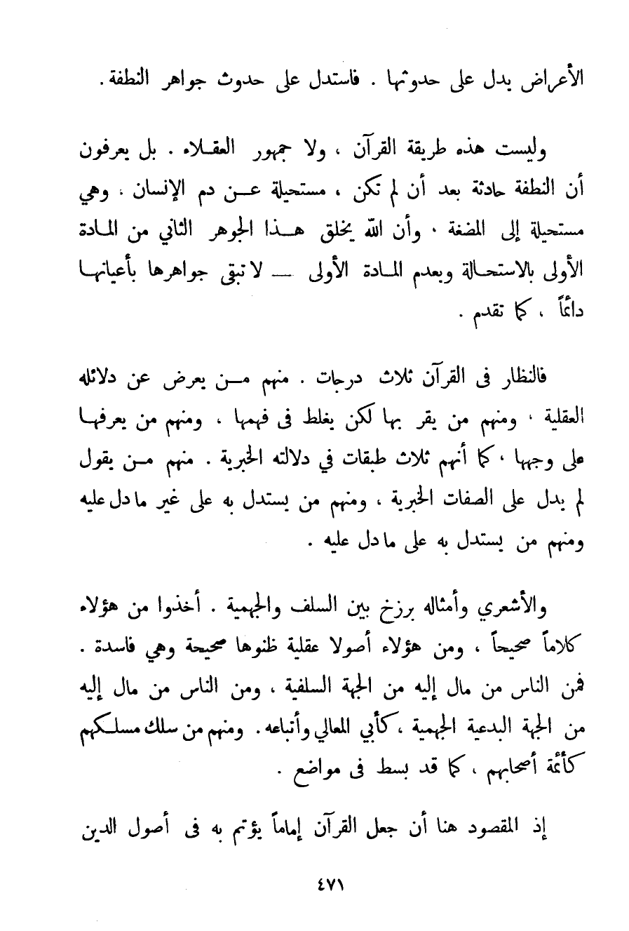 الْأَعْرَاضِ يَدُلُّ عَلَى حُدُوثِهَا. فَاسْتَدَلَّ عَلَى حُدُوثِ جَوَاهِرِ النُّطْفَةِ. وَلَيْسَتْ هَذِهِ طَرِيقَةَ الْقُرْآنِ وَلَا جُمْهُورَ الْعُقَلَاءِ. بَلْ يَعْرِفُونَ أَنَّ النُّطْفَةَ حَادِثَةٌ بَعْدَ أَنْ لَمْ تَكُنْ مُسْتَحِيلَةً عَنْ دَمِ الْإِنْسَانِ؛ وَهِيَ مُسْتَحِيلَةٌ إلَى الْمُضْغَةِ وَأَنَّ اللَّهَ يَخْلُقُ هَذَا الْجَوْهَرَ الثَّانِيَ مِنْ الْمَادَّةِ الْأُولَى بِالِاسْتِحَالَةِ وَيَعْدَمُ الْمَادَّةَ الْأُولَى لَا تَبْقَى جَوَاهِرُهَا بِأَعْيَانِهَا دَائِمًا كَمَا تَقَدَّمَ. فَالنُّظَّارُ فِي الْقُرْآنِ ثَلَاثُ دَرَجَاتٍ. مِنْهُمْ مَنْ يُعْرِضُ عَنْ دَلَائِلِهِ الْعَقْلِيَّةِ وَمِنْهُمْ مَنْ يُقِرُّ بِهَا لَكِنْ يَغْلَطُ فِي فَهْمِهَا وَمِنْهُمْ مَنْ يَعْرِفُهَا عَلَى وَجْهِهَا كَمَا أَنَّهُمْ ثَلَاثُ طَبَقَاتٍ فِي دَلَالَتِهِ الْخَبَرِيَّةِ. مِنْهُمْ مَنْ يَقُولُ لَمْ يَدُلَّ عَلَى الصِّفَاتِ الْخَبَرِيَّةِ وَمِنْهُمْ مَنْ يَسْتَدِلُّ بِهِ عَلَى غَيْرِ مَا دَلَّ عَلَيْهِ وَمِنْهُمْ مَنْ يَسْتَدِلُّ بِهِ عَلَى مَا دَلَّ عَلَيْهِ. وَالْأَشْعَرِيُّ وَأَمْثَالُهُ بَرْزَخٌ بَيْنَ السَّلَفِ وَالْجَهْمِيَّة. أَخَذُوا مِنْ هَؤُلَاءِ كَلَامًا صَحِيحًا وَمِنْ هَؤُلَاءِ أُصُولًا عَقْلِيَّةً ظَنُّوهَا صَحِيحَةً وَهِيَ فَاسِدَةٌ. فَمِنْ النَّاسِ مَنْ مَالَ إلَيْهِ مِنْ الْجِهَةِ السَّلَفِيَّةِ وَمِنْ النَّاسِ مَنْ مَالَ إلَيْهِ مِنْ الْجِهَةِ الْبِدْعِيَّةِ الْجَهْمِيَّة كَأَبِي الْمَعَالِي وَأَتْبَاعِهِ. وَمِنْهُمْ مَنْ سَلَكَ مَسْلَكَهُمْ كَأَئِمَّةِ أَصْحَابِهِمْ كَمَا قَدْ بُسِطَ فِي مَوَاضِعَ.