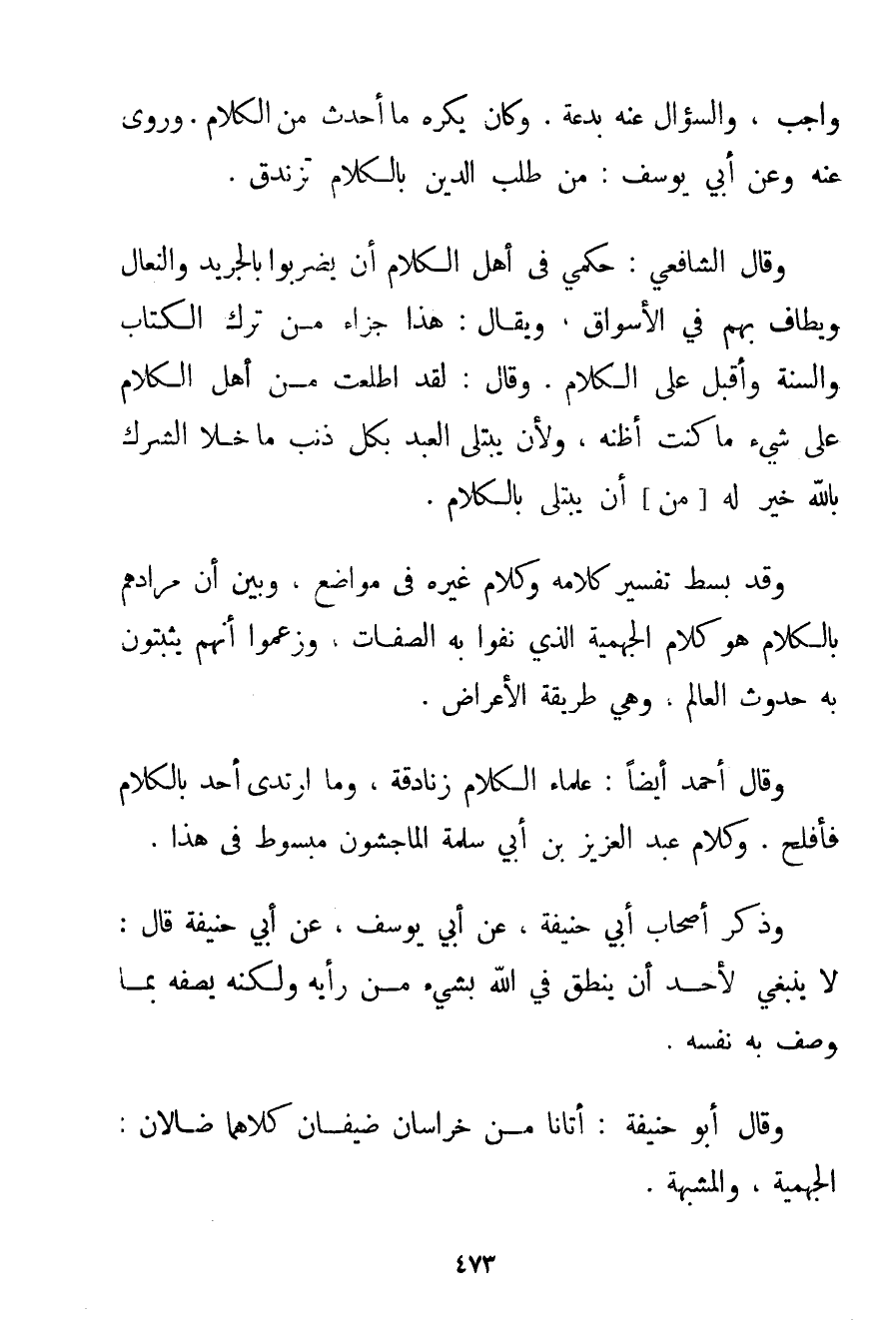 وَالسُّؤَالُ عَنْهُ بِدْعَةٌ. وَكَانَ يَكْرَهُ مَا أَحْدَثَ مِنْ الْكَلَامِ. وَرُوِيَ عَنْهُ وَعَنْ أَبِي يُوسُفَ: مَنْ طَلَبَ الدِّينَ بِالْكَلَامِ تَزَنْدَقَ. وَقَالَ الشَّافِعِيُّ: حُكْمِي فِي أَهْلِ الْكَلَامِ أَنْ يُضْرَبُوا بِالْجَرِيدِ وَالنِّعَالِ وَيُطَافُ بِهِمْ فِي الْأَسْوَاقِ وَيُقَالُ: هَذَا جَزَاءُ مَنْ تَرَكَ الْكِتَابَ وَالسُّنَّةَ وَأَقْبَلَ عَلَى الْكَلَامِ. وَقَالَ: لَقَدْ اطَّلَعْت مِنْ أَهْلِ الْكَلَامِ عَلَى شَيْءٍ مَا كُنْت أَظُنُّهُ وَلَأَنْ يُبْتَلَى الْعَبْدُ بِكُلِّ ذَنْبٍ مَا خَلَا الشِّرْكَ بِاَللَّهِ خَيْرٌ لَهُ مِنْ أَنْ يُبْتَلَى بِالْكَلَامِ. وَقَدْ بُسِطَ تَفْسِيرُ كَلَامِهِ وَكَلَامِ غَيْرِهِ فِي مَوَاضِعَ وَبَيَّنَ أَنَّ مُرَادَهُمْ بِالْكَلَامِ هُوَ كَلَامُ الْجَهْمِيَّة الَّذِي نَفَوْا بِهِ الصِّفَاتِ وَزَعَمُوا أَنَّهُمْ يُثْبِتُونَ بِهِ حُدُوثَ الْعَالَمِ وَهِيَ طَرِيقَةُ الْأَعْرَاضِ. وَقَالَ أَحْمَد أَيْضًا: عُلَمَاءُ الْكَلَامِ زَنَادِقَةٌ وَمَا ارْتَدَى أَحَدٌ بِالْكَلَامِ فَأَفْلَحَ. وَكَلَامُ عَبْدِ الْعَزِيزِ بْنِ أَبِي سَلَمَةَ الماجشون مَبْسُوطٌ فِي هَذَا. وَذَكَرَ أَصْحَابُ أَبِي حَنِيفَةَ عَنْ أَبِي يُوسُفَ عَنْ أَبِي حَنِيفَةَ قَالَ: لَا يَنْبَغِي لِأَحَدِ أَنْ يَنْطِقَ فِي اللَّهِ بِشَيْءِ مِنْ رَأْيِهِ وَلَكِنَّهُ يَصِفُهُ بِمَا وَصَفَ بِهِ نَفْسَهُ. وَقَالَ أَبُو حَنِيفَةَ: أَتَانَا مِنْ خُرَاسَانَ ضَيْفَانِ كِلَاهُمَا ضَالَّانِ الْجَهْمِيَّة وَالْمُشَبِّهَةُ.