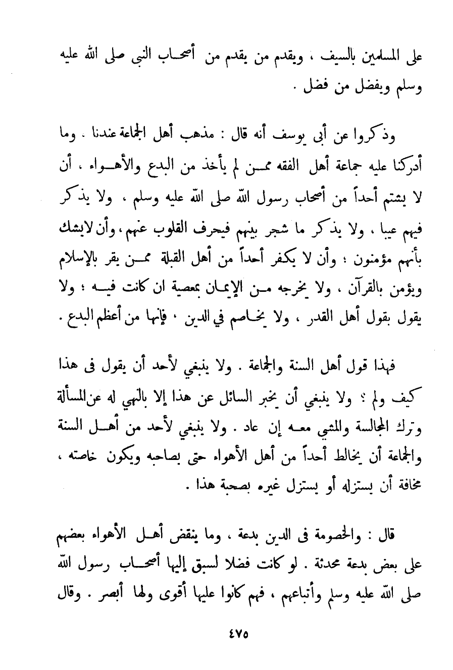 عَلَى الْمُسْلِمِينَ بِالسَّيْفِ وَيُقَدِّمُ مَنْ يُقَدَّمُ مِنْ أَصْحَابِ النَّبِيِّ صَلَّى اللَّهُ عَلَيْهِ وَسَلَّمَ وَيُفَضِّلُ مَنْ فُضِّلَ. وَذَكَرُوا عَنْ أَبِي يُوسُفَ أَنَّهُ قَالَ: مَذْهَبُ أَهْلِ الْجَمَاعَةِ عِنْدَنَا وَمَا أَدْرَكْنَا عَلَيْهِ جَمَاعَةَ أَهْلِ الْفِقْهِ مِمَّنْ لَمْ يَأْخُذْ مِنْ الْبِدَعِ وَالْأَهْوَاءِ أَنْ لَا يَشْتُمَ أَحَدًا مِنْ أَصْحَابِ رَسُولِ اللَّهِ صَلَّى اللَّهُ عَلَيْهِ وَسَلَّمَ؟ وَلَا يَذْكُرَ فِيهِمْ عَيْبًا وَلَا يَذْكُرَ مَا شَجَرَ بَيْنَهُمْ فَيُحَرِّفَ الْقُلُوبَ عَنْهُمْ وَأَنْ لَا يَشُكَّ بِأَنَّهُمْ مُؤْمِنُونَ وَأَنْ لَا يُكَفِّرَ أَحَدًا مِنْ أَهْلِ الْقِبْلَةِ مِمَّنْ يُقِرُّ بِالْإِسْلَامِ وَيُؤْمِنُ بِالْقُرْآنِ وَلَا يُخْرِجُهُ مِنْ الْإِيمَانِ بِمَعْصِيَةِ إنْ كَانَتْ فِيهِ؛ وَلَا يَقُولُ بِقَوْلِ أَهْلِ الْقَدَرِ وَلَا يُخَاصِمُ فِي الدِّينِ فَإِنَّهَا مِنْ أَعْظَمِ الْبِدَعِ. فَهَذَا قَوْلُ أَهْلِ السُّنَّةِ وَالْجَمَاعَةِ. وَلَا يَنْبَغِي لِأَحَدِ أَنْ يَقُولَ فِي هَذَا كَيْفَ وَلِمَ؟ وَلَا يَنْبَغِي أَنْ يُخْبِرَ السَّائِلَ عَنْ هَذَا إلَّا بِالنَّهْيِ لَهُ عَنْ الْمَسْأَلَةِ وَتَرْكِ الْمُجَالَسَةِ وَالْمَشْيِ مَعَهُ إنْ عَادَ. وَلَا يَنْبَغِي لِأَحَدِ مِنْ أَهْلِ السُّنَّةِ وَالْجَمَاعَةِ أَنْ يُخَالِطَ أَحَدًا مِنْ أَهْلِ الْأَهْوَاءِ حَتَّى يُصَاحِبَهُ وَيَكُونَ خَاصَّتَهُ مَخَافَةَ أَنْ يَسْتَزِلَّهُ أَوْ يَسْتَزِلَّ غَيْرَهُ بِصُحْبَةِ هَذَا. قَالَ: وَالْخُصُومَةُ فِي الدِّينِ بِدْعَةٌ وَمَا يَنْقُضُ أَهْلُ الْأَهْوَاءِ بَعْضُهُمْ عَلَى بَعْضٍ بِدْعَةٌ مُحْدَثَةٌ. لَوْ كَانَتْ فَضْلًا لَسَبَقَ إلَيْهَا أَصْحَابُ رَسُولِ اللَّهِ صَلَّى اللَّهُ عَلَيْهِ وَسَلَّمَ وَأَتْبَاعُهُمْ فَهُمْ كَانُوا عَلَيْهَا أَقْوَى وَلَهَا أَبْصَرُ. وَقَالَ