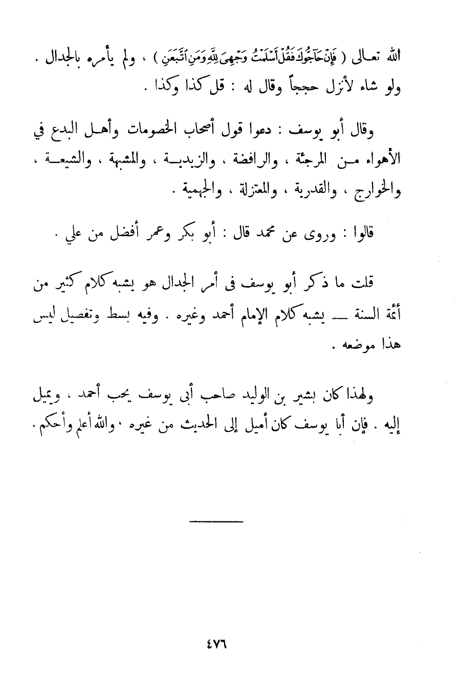 اللَّهُ تَعَالَى {فَإِنْ حَاجُّوكَ فَقُلْ أَسْلَمْتُ وَجْهِيَ لِلَّهِ وَمَنِ اتَّبَعَنِ} وَلَمْ يَأْمُرْهُ بِالْجِدَالِ. وَلَوْ شَاءَ لَأَنْزَلَ حُجَجًا وَقَالَ لَهُ: قُلْ كَذَا وَكَذَا. وَقَالَ أَبُو يُوسُفَ: دَعُوا قَوْلَ أَصْحَابِ الْخُصُومَاتِ وَأَهْلِ الْبِدَعِ فِي الْأَهْوَاءِ مِنْ الْمُرْجِئَةِ وَالرَّافِضَةِ وَالزَّيْدِيَّةِ وَالْمُشَبِّهَةِ وَالشِّيعَةِ وَالْخَوَارِجِ وَالْقَدَرِيَّةِ وَالْمُعْتَزِلَةِ وَالْجَهْمِيَّة. قَالُوا: وَرُوِيَ عَنْ مُحَمَّدٍ قَالَ: أَبُو بَكْرٍ وَعُمَرُ أَفْضَلُ مِنْ عَلِيٍّ. قُلْت مَا ذَكَرَ أَبُو يُوسُفَ فِي أَمْرِ الْجِدَالِ هُوَ يُشْبِهُ كَلَامَ كَثِيرٍ مِنْ أَئِمَّةِ السُّنَّةِ يُشْبِهُ كَلَامَ الْإِمَامِ أَحْمَد وَغَيْرِهِ. وَفِيهِ بَسْطٌ وَتَفْصِيلٌ لَيْسَ هَذَا مَوْضِعَهُ. وَلِهَذَا كَانَ بِشْرُ بْنُ الْوَلِيدِ صَاحِبُ أَبِي يُوسُفَ يُحِبُّ أَحْمَد وَيَمِيلُ إلَيْهِ. فَإِنَّ أَبَا يُوسُفَ كَانَ أَمْيَلَ إلَى الْحَدِيثِ مِنْ غَيْرِهِ وَاَللَّهُ أَعْلَمُ وَأَحْكَمُ.