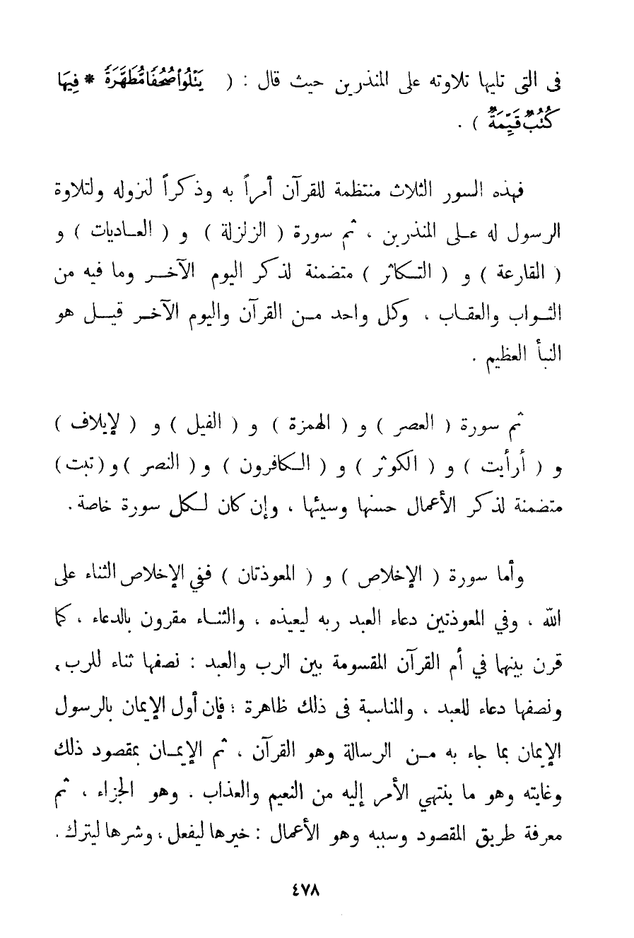 فِي الَّتِي تَلِيهَا تِلَاوَتَهُ عَلَى الْمُنْذَرِينَ حَيْثُ قَالَ: {يَتْلُو صُحُفًا مُطَهَّرَةً} {فِيهَا كُتُبٌ قَيِّمَةٌ} . فهذه السُّوَرُ الثَّلَاثُ مُنْتَظِمَةٌ لِلْقُرْآنِ أَمْرًا بِهِ وَذِكْرًا لِنُزُولِهِ وَلِتِلَاوَةِ الرَّسُولِ لَهُ عَلَى الْمُنْذَرِينَ ثُمَّ سُورَةُ (الزَّلْزَلَةِ) و (الْعَادِيَّاتِ) و (الْقَارِعَةِ) و (التَّكَاثُرِ) مُتَضَمِّنَةٌ لِذِكْرِ الْيَوْمِ الْآخِرِ وَمَا فِيهِ مِنْ الثَّوَابِ وَالْعِقَابِ وَكُلُّ وَاحِدٍ مِنْ الْقُرْآنِ وَالْيَوْمِ الْآخِرِ قِيلَ هُوَ النَّبَأُ الْعَظِيمُ. ثُمَّ سُورَةُ (الْعَصْرِ) و (الْهُمَزَةِ) و (الْفِيلِ) و (لِإِيلَافِ) و (أَرَأَيْت) و (الْكَوْثَرِ) و (الْكَافِرُونَ) و (النَّصْرِ) و (تَبَّتْ) مُتَضَمِّنَةٌ لِذِكْرِ الْأَعْمَالِ حَسَنِهَا وَسَيِّئِهَا وَإِنْ كَانَ لِكُلِّ سُورَةٍ خَاصَّةٌ. وَأَمَّا سُورَةُ (الْإِخْلَاصِ و (الْمُعَوِّذَتَانِ فَفِي الْإِخْلَاصِ الثَّنَاءُ عَلَى اللَّهِ وَفِي الْمُعَوِّذَتَيْنِ دُعَاءُ الْعَبْدِ رَبَّهُ لِيُعِيذَهُ وَالثَّنَاءُ مَقْرُونٌ بِالدُّعَاءِ كَمَا قَرَنَ بَيْنَهُمَا فِي أُمِّ الْقُرْآنِ الْمَقْسُومَةِ بَيْنَ الرَّبِّ وَالْعَبْدِ: نِصْفُهَا ثَنَاءٌ لِلرَّبِّ وَنِصْفُهَا دُعَاءٌ لِلْعَبْدِ وَالْمُنَاسَبَةُ فِي ذَلِكَ ظَاهِرَةٌ؛ فَإِنَّ أَوَّلَ الْإِيمَانِ بِالرَّسُولِ الْإِيمَانُ بِمَا جَاءَ بِهِ مِنْ الرِّسَالَةِ وَهُوَ الْقُرْآنُ ثُمَّ الْإِيمَانُ بِمَقْصُودِ ذَلِكَ وَغَايَتُهُ وَهُوَ مَا يَنْتَهِي الْأَمْرُ إلَيْهِ مِنْ النَّعِيمِ وَالْعَذَابِ: وَهُوَ الْجَزَاءُ ثُمَّ مَعْرِفَةُ طَرِيقِ الْمَقْصُودِ وَسَبَبُهُ وَهُوَ الْأَعْمَالُ: خَيْرُهَا لِيَفْعَلَ وَشَرُّهَا لِيَتْرُكَ.