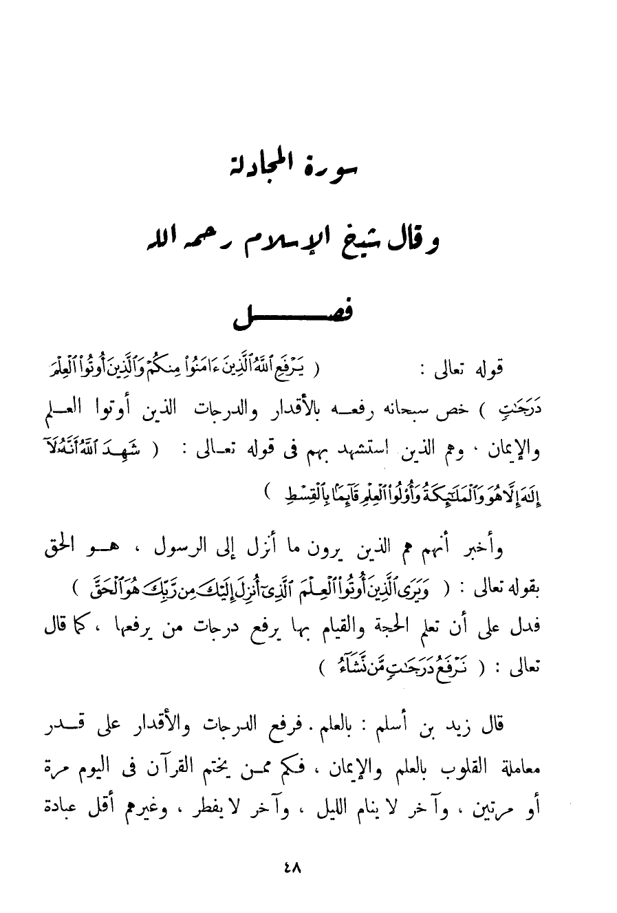 قَوْله تَعَالَى {يَرْفَعِ اللَّهُ الَّذِينَ آمَنُوا مِنْكُمْ وَالَّذِينَ أُوتُوا الْعِلْمَ دَرَجَاتٍ} خَصَّ سُبْحَانَهُ رَفْعَهُ بِالْأَقْدَارِ وَالدَّرَجَاتِ الَّذِينَ أُوتُوا الْعِلْمَ وَالْإِيمَانَ وَهُمْ الَّذِينَ اسْتَشْهَدَ بِهِمْ فِي قَوْله تَعَالَى {شَهِدَ اللَّهُ أَنَّهُ لَا إلَهَ إلَّا هُوَ وَالْمَلَائِكَةُ وَأُولُو الْعِلْمِ قَائِمًا بِالْقِسْطِ} وَأَخْبَرَ أَنَّهُمْ هُمْ الَّذِينَ يَرَوْنَ مَا أُنْزِلَ إلَى الرَّسُولِ هُوَ الْحَقُّ بِقَوْلِهِ تَعَالَى: {وَيَرَى الَّذِينَ أُوتُوا الْعِلْمَ الَّذِي أُنْزِلَ إلَيْكَ مِنْ رَبِّكَ هُوَ الْحَقَّ} فَدَلَّ عَلَى أَنَّ تَعَلُّمَ الْحُجَّةِ وَالْقِيَامَ بِهَا يَرْفَعُ دَرَجَاتِ مَنْ يَرْفَعُهَا كَمَا قَالَ تَعَالَى: {نَرْفَعُ دَرَجَاتٍ مَنْ نَشَاءُ} قَالَ زَيْدُ بْنُ أَسْلَمَ: بِالْعِلْمِ. فَرَفْعُ الدَّرَجَاتِ وَالْأَقْدَارِ عَلَى قَدْرِ مُعَامَلَةِ الْقُلُوبِ بِالْعِلْمِ وَالْإِيمَانِ فَكَمْ مِمَّنْ يَخْتِمُ الْقُرْآنَ فِي الْيَوْمِ مَرَّةً أَوْ مَرَّتَيْنِ وَآخَرُ لَا يَنَامُ اللَّيْلَ وَآخَرُ لَا يُفْطِرُ وَغَيْرُهُمْ أَقَلُّ عِبَادَةً