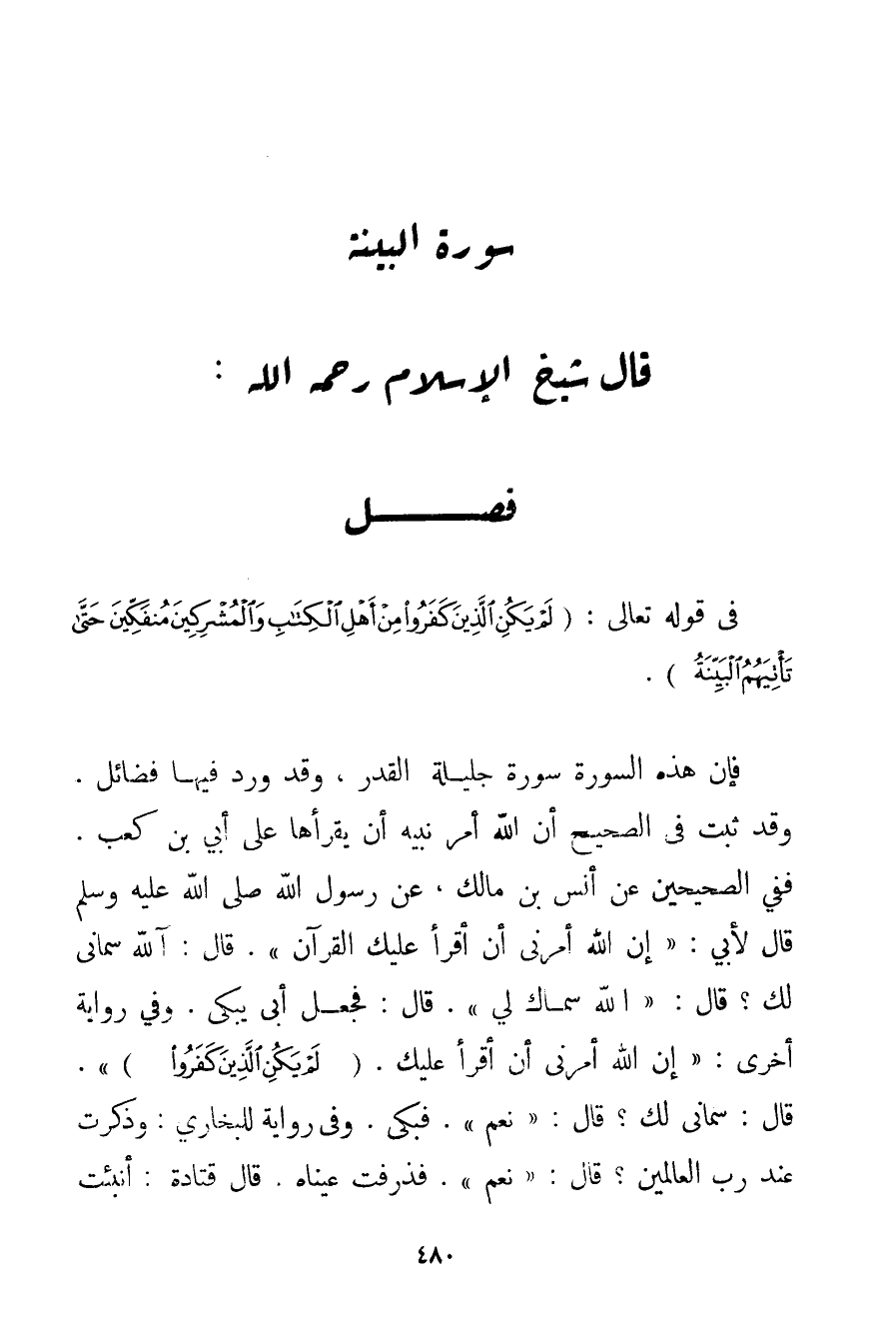 فِي قَوْله تَعَالَى. {لَمْ يَكُنِ الَّذِينَ كَفَرُوا مِنْ أَهْلِ الْكِتَابِ وَالْمُشْرِكِينَ مُنْفَكِّينَ حَتَّى تَأْتِيَهُمُ الْبَيِّنَةُ} . فَإِنَّ هَذِهِ السُّورَةَ سُورَةٌ جَلِيلَةُ الْقَدْرِ وَقَدْ وَرَدَ فِيهَا فَضَائِلُ. وَقَدْ ثَبَتَ فِي الصَّحِيحِ أَنَّ اللَّهَ أَمَرَ نَبِيَّهُ أَنْ يَقْرَأَهَا عَلَى أبي بْنِ كَعْبٍ. فَفِي الصَّحِيحَيْنِ عَنْ أَنَسِ بْنِ مَالِكٍ عَنْ {رَسُولِ اللَّهِ صَلَّى اللَّهُ عَلَيْهِ وَسَلَّمَ قَالَ لأبي: إنَّ اللَّهَ أَمَرَنِي أَنْ أَقْرَأَ عَلَيْك الْقُرْآنَ. قَالَ: آللَّهُ سَمَّانِي لَك؟ قَالَ: اللَّهُ سَمَّاك لِي قَالَ: فَجَعَلَ أبي يَبْكِي} . وَفِي رِوَايَةٍ أُخْرَى: {إنَّ اللَّه أَمَرَنِي أَنْ أَقْرَأَ عَلَيْك. {لَمْ يَكُنِ الَّذِينَ كَفَرُوا} . قَالَ: سَمَّانِي لَك؟ قَالَ: نَعَمْ. فَبَكَى} . وَفِي رِوَايَةٍ لِلْبُخَارِيِّ: {وَذُكِرْت عِنْدَ رَبِّ الْعَالَمِينَ؟ قَالَ: نَعَمْ. فَذَرَفَتْ عَيْنَاهُ.} قَالَ قتادة: أُنْبِئْت