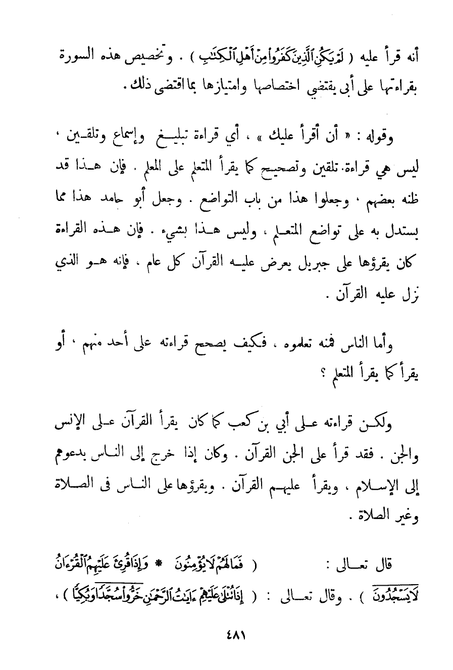 أَنَّهُ قَرَأَ عَلَيْهِ {لَمْ يَكُنِ الَّذِينَ كَفَرُوا مِنْ أَهْلِ الْكِتَابِ} . وَتَخْصِيصُ هَذِهِ السُّورَةِ بِقِرَاءَتِهَا عَلَى أبي يَقْتَضِي اخْتِصَاصَهَا وَامْتِيَازَهَا بِمَا اقْتَضَى ذَلِكَ. وَقَوْلُهُ: {أَنْ أَقْرَأَ عَلَيْك} أَيْ قِرَاءَةَ تَبْلِيغٍ وَإِسْمَاعٍ وَتَلْقِينٍ لَيْسَ هِيَ قِرَاءَةَ تَلْقِينٍ فِي تَصْحِيحٍ كَمَا يَقْرَأُ الْمُتَعَلِّمُ عَلَى الْمُعَلِّمِ. فَإِنَّ هَذَا قَدْ ظَنَّهُ بَعْضُهُمْ وَجَعَلُوا هَذَا مِنْ بَابِ التَّوَاضُعِ. وَجَعَلَ أَبُو حَامِدٍ هَذَا مِمَّا يُسْتَدَلُّ بِهِ عَلَى تَوَاضُعِ الْمُتَعَلِّمِ وَلَيْسَ هَذَا بِشَيْءِ. فَإِنَّ هَذِهِ الْقِرَاءَةَ كَانَ يَقْرَؤُهَا عَلَى جِبْرِيلَ يَعْرِضُ عَلَيْهِ الْقُرْآنَ كُلَّ عَامٍّ فَإِنَّهُ هُوَ الَّذِي نَزَّلَ عَلَيْهِ الْقُرْآنَ. وَأَمَّا النَّاسُ فَمِنْهُ تَعَلَّمُوهُ فَكَيْفَ يُصَحِّحُ قِرَاءَتَهُ عَلَى أَحَدٍ مِنْهُمْ أَوْ يَقْرَأُ كَمَا يَقْرَأُ الْمُتَعَلِّمُ؟ وَلَكِنَّ قِرَاءَتَهُ عَلَى أبي بْنِ كَعْبٍ كَمَا كَانَ يَقْرَأُ الْقُرْآنَ عَلَى الْإِنْسِ وَالْجِنِّ. فَقَدْ قَرَأَ عَلَى الْجِنِّ الْقُرْآنَ. وَكَانَ إذَا خَرَجَ إلَى النَّاسِ يَدْعُوهُمْ إلَى الْإِسْلَامِ وَيَقْرَأُ عَلَيْهِمْ الْقُرْآنَ. وَيَقْرَؤُهُ عَلَى النَّاسِ فِي الصَّلَاةِ وَغَيْرِ الصَّلَاةِ. قَالَ تَعَالَى: {فَمَا لَهُمْ لَا يُؤْمِنُونَ} {وَإِذَا قُرِئَ عَلَيْهِمُ الْقُرْآنُ لَا يَسْجُدُونَ} وَقَالَ تَعَالَى: {إذَا تُتْلَى عَلَيْهِمْ آيَاتُ الرَّحْمَنِ خَرُّوا