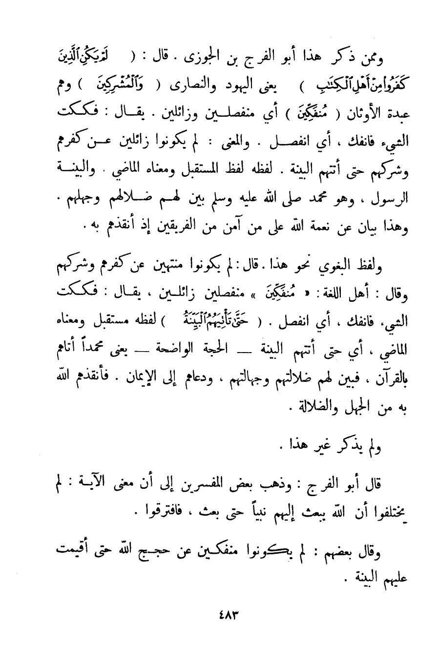 وَمِمَّنْ ذَكَرَ هَذَا أَبُو الْفَرَجِ بْنِ الْجَوْزِيِّ. قَالَ: {لَمْ يَكُنِ الَّذِينَ كَفَرُوا مِنْ أَهْلِ الْكِتَابِ} يَعْنِي الْيَهُودَ وَالنَّصَارَى وَالْمُشْرِكِينَ وَهْم عَبَدَةُ الْأَوْثَانِ {مُنْفَكِّينَ} أَيْ مُنْفَصِلِينَ وَزَائِلِينَ. يُقَالُ: فَكَكْت الشَّيْءَ فَانْفَكَّ أَيْ انْفَصَلَ. وَالْمَعْنَى: لَمْ يَكُونُوا زَائِلِينَ عَنْ كُفْرِهِمْ وَشِرْكِهِمْ حَتَّى أَتَتْهُمْ الْبَيِّنَةُ. لَفْظُهُ لَفْظُ الْمُسْتَقْبَلِ وَمَعْنَاهُ الْمَاضِي. وَالْبَيِّنَةُ الرَّسُولُ وَهُوَ مُحَمَّدٌ صَلَّى اللَّهُ عَلَيْهِ وَسَلَّمَ بَيَّنَ لَهُمْ ضَلَالَهُمْ وَجَهْلَهُمْ. وَهَذَا بَيَانٌ عَنْ نِعْمَةِ اللَّهِ عَلَى مَنْ آمَنُ مِنْ الْفَرِيقَيْنِ إذْ أَنْقَذَهُمْ بِهِ. وَلَفْظُ البغوي نَحْوُ هَذَا. قَالَ: لَمْ يَكُونُوا مُنْتَهِينَ عَنْ كُفْرِهِمْ وَشِرْكِهِمْ وَقَالَ: أَهْلُ اللُّغَةِ: " مُنْفَكِّينَ " مُنْفَصِلِينَ زَائِلِينَ يُقَالُ: فَكَكْت الشَّيْءَ فَانْفَكَّ أَيْ انْفَصَلَ. {حَتَّى تَأْتِيَهُمُ الْبَيِّنَةُ} لَفْظُهُ مُسْتَقْبَلٌ وَمَعْنَاهُ الْمَاضِي أَيْ حَتَّى أَتَتْهُمْ الْبَيِّنَةُ الْحُجَّةُ الْوَاضِحَةُ يَعْنِي مُحَمَّدًا أَتَاهُمْ بِالْقُرْآنِ فَبَيَّنَ لَهُمْ ضَلَالَتَهُمْ وَجَهَالَتَهُمْ وَدَعَاهُمْ إلَى الْإِيمَانِ. فَأَنْقَذَهُمْ اللَّهُ بِهِ مِنْ الْجَهْلِ وَالضَّلَالَةِ. وَلَمْ يَذْكُرْ غَيْرَ هَذَا. قَالَ أَبُو الْفَرَجِ: وَذَهَبَ بَعْضُ الْمُفَسِّرِينَ إلَى أَنَّ مَعْنَى الْآيَةِ: لَمْ يَخْتَلِفُوا أَنَّ اللَّهَ يَبْعَثُ إلَيْهِمْ نَبِيًّا حَتَّى بَعَثَ فَافْتَرَقُوا. وَقَالَ بَعْضُهُمْ: لَمْ يَكُونُوا مُنْفَكِّينَ عَنْ حُجَجِ اللَّهِ حَتَّى أُقِيمَتْ عَلَيْهِمْ الْبَيِّنَةُ.
