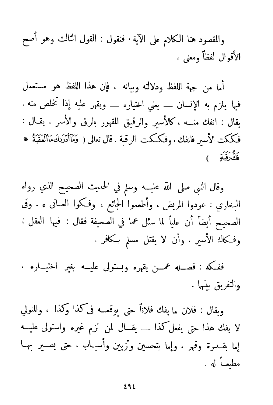 وَالْمَقْصُودُ هُنَا الْكَلَامُ عَلَى الْآيَةِ فَنَقُولُ: الْقَوْلُ الثَّالِثُ وَهُوَ أَصَحُّ الْأَقْوَالِ لَفْظًا وَمَعْنًى. أَمَّا مِنْ جِهَةِ اللَّفْظِ وَدَلَالَتِهِ وَبَيَانِهِ فَإِنَّ هَذَا اللَّفْظَ هُوَ مُسْتَعْمَلٌ فِيمَا يَلْزَمُ بِهِ الْإِنْسَانُ يَعْنِي اخْتِيَارَهُ وَيَقْهَرُ عَلَيْهِ إذَا تَخَلَّصَ مِنْهُ. يُقَالُ: انْفَكَّ مِنْهُ كَالْأَسِيرِ وَالرَّقِيقِ الْمَقْهُورِ بِالرِّقِّ وَالْأَسْرِ. يُقَالُ: فَكَكْت الْأَسِيرَ فَانْفَكَّ وَفَكَكْت الرَّقَبَةَ. قَالَ تَعَالَى {وَمَا أَدْرَاكَ مَا الْعَقَبَةُ} {فَكُّ رَقَبَةٍ} وَقَالَ النَّبِيُّ صَلَّى اللَّهُ عَلَيْهِ وَسَلَّمَ فِي الْحَدِيثِ الصَّحِيحِ الَّذِي رَوَاهُ الْبُخَارِيُّ: {عُودُوا الْمَرِيضَ وَأَطْعِمُوا الْجَائِعَ: وَفُكُّوا الْعَانِي} . وَفِي الصَّحِيحِ أَيْضًا أَنَّ عَلِيًّا لَمَّا سُئِلَ عَمَّا فِي الصَّحِيفَةِ فَقَالَ: فِيهَا الْعَقْلُ وَفِكَاكُ الْأَسِيرِ وَأَنْ لَا يُقْتَلَ مُسْلِمٌ بِكَافِرِ. فَفَكُّهُ: فَصْلُهُ عَمَّنْ يَقْهَرُهُ وَيَسْتَوْلِي عَلَيْهِ بِغَيْرِ اخْتِيَارِهِ وَالتَّفْرِيقُ بَيْنَهُمَا. وَيُقَالُ: فُلَانٌ مَا يَفُكُّ فُلَانًا حَتَّى يُوقِعَهُ فِي كَذَا وَكَذَا وَالْمُتَوَلِّي لَا يَفُكُّ هَذَا حَتَّى يَفْعَلَ كَذَا يُقَالُ لِمَنْ لَزِمَ غَيْرَهُ وَاسْتَوْلَى عَلَيْهِ إمَّا بِقُدْرَةِ وَقَهْرٍ وَإِمَّا بِتَحْسِينِ وَتَزْيِينٍ وَأَسْبَابٍ حَتَّى يَصِيرَ بِهَا مُطِيعًا لَهُ.