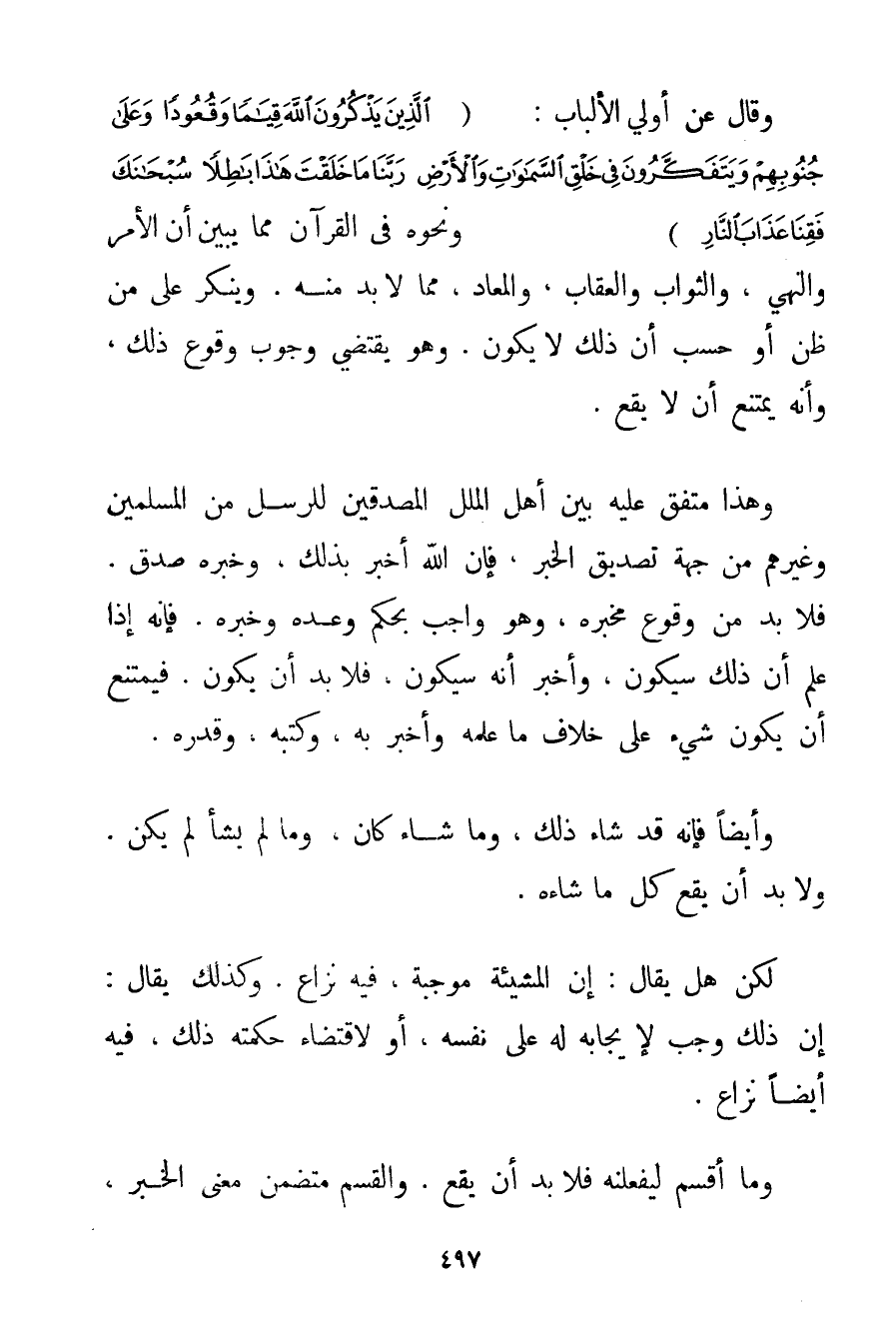 وَقَالَ عَنْ أُولِي الْأَلْبَابِ: {الَّذِينَ يَذْكُرُونَ اللَّهَ قِيَامًا وَقُعُودًا وَعَلَى جُنُوبِهِمْ وَيَتَفَكَّرُونَ فِي خَلْقِ السَّمَاوَاتِ وَالْأَرْضِ رَبَّنَا مَا خَلَقْتَ هَذَا بَاطِلًا سُبْحَانَكَ فَقِنَا عَذَابَ النَّارِ} وَنَحْوُهُ فِي الْقُرْآنِ مِمَّا يُبَيِّنُ أَنَّ الْأَمْرَ وَالنَّهْيَ وَالثَّوَابَ وَالْعِقَابَ وَالْمَعَادَ مِمَّا لَا بُدَّ مِنْهُ. وَيُنْكِرُ عَلَى مَنْ ظَنَّ أَوْ حَسِبَ أَنَّ ذَلِكَ لَا يَكُونُ. وَهُوَ يَقْتَضِي وُجُوبَ وُقُوعِ ذَلِكَ وَأَنَّهُ يَمْتَنِعُ أَنْ لَا يَقَعُ. وَهَذَا مُتَّفَقٌ عَلَيْهِ بَيْنَ أَهْلِ الْمِلَلِ الْمُصَدِّقِينَ لِلرُّسُلِ مِنْ الْمُسْلِمِينَ وَغَيْرِهِمْ مِنْ جِهَةِ تَصْدِيقِ الْخَبَرِ فَإِنَّ اللَّهَ أَخْبَرَ بِذَلِكَ وَخَبَرُهُ صِدْقٌ. فَلَا بُدَّ مِنْ وُقُوعِ مُخْبِرِهِ وَهُوَ وَاجِبٌ بِحُكْمِ وَعْدِهِ وَخَبَرِهِ. فَإِنَّهُ إذَا عَلِمَ أَنَّ ذَلِكَ سَيَكُونُ وَأَخْبَرَ أَنَّهُ سَيَكُونُ فَلَا بُدَّ أَنْ يَكُونَ. فَيَمْتَنِعُ أَنْ يَكُونَ شَيْءٌ عَلَى خِلَافِ مَا عَلِمَهُ وَأَخْبَرَ بِهِ وَكَتَبَهُ وَقَدَّرَهُ. وَأَيْضًا فَإِنَّهُ قَدْ شَاءَ ذَلِكَ وَمَا شَاءَ كَانَ وَمَا لَمْ يَشَأْ لَمْ يَكُنْ وَلَا بُدَّ أَنْ يَقَعَ كُلُّ مَا شَاءَهُ. لَكِنْ هَلْ يُقَالُ: إنَّ الْمَشِيئَةَ مُوجِبَةٌ فِيهِ نِزَاعٌ. وَكَذَلِكَ يُقَالُ: إنَّ ذَلِكَ وَجَبَ لِإِيجَابِهِ لَهُ عَلَى نَفْسِهِ أَوْ لِاقْتِضَاءِ حِكْمَتِهِ ذَلِكَ فِيهِ أَيْضًا نِزَاعٌ. وَمَا أَقْسَمَ لَيَفْعَلَنهُ فَلَا بُدَّ أَنْ يَقَعَ. وَالْقَسَمُ مُتَضَمِّنٌ مَعْنَى الْخَبَرِ