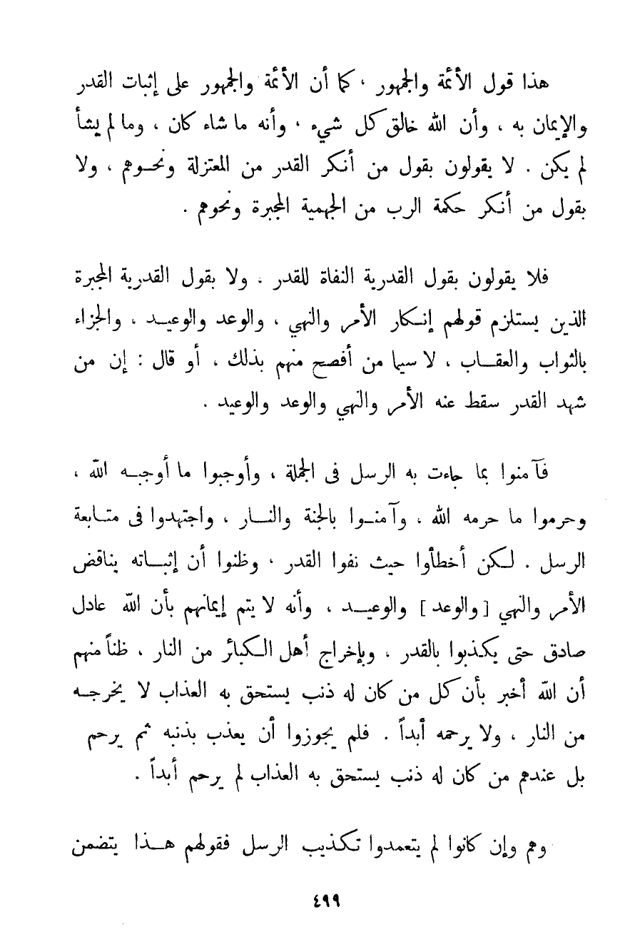 هَذَا قَوْلُ الْأَئِمَّةِ وَالْجُمْهُورِ كَمَا أَنَّ الْأَئِمَّةَ وَالْجُمْهُورَ عَلَى إثْبَاتِ الْقَدَرِ وَالْإِيمَانِ بِهِ وَأَنَّ اللَّهَ خَالِقُ كُلِّ شَيْءٍ وَأَنَّهُ مَا شَاءَ كَانَ وَمَا لَمْ يَشَأْ لَمْ يَكُنْ. لَا يَقُولُونَ بِقَوْلِ مَنْ أَنْكَرَ الْقَدَرَ مِنْ الْمُعْتَزِلَةِ وَنَحْوِهِمْ وَلَا بِقَوْلِ مَنْ أَنْكَرَ حِكْمَةَ الرَّبِّ مِنْ الْجَهْمِيَّة الْمُجْبِرَةِ وَنَحْوِهِمْ. فَلَا يَقُولُونَ بِقَوْلِ الْقَدَرِيَّةِ الْنُّفَاةِ لِلْقَدَرِ وَلَا بِقَوْلِ الْقَدَرِيَّةِ الْمُجْبِرَةِ الَّذِينَ يَسْتَلْزِمُ قَوْلُهُمْ إنْكَارَ الْأَمْرِ وَالنَّهْيِ وَالْوَعْدِ وَالْوَعِيدِ وَالْجَزَاءِ بِالثَّوَابِ وَالْعِقَابِ لَا سِيَّمَا مَنْ أَفْصَحُ مِنْهُمْ بِذَلِكَ أَوْ قَالَ: إنَّ مَنْ شَهِدَ الْقَدَرَ سَقَطَ عَنْهُ الْأَمْرُ وَالنَّهْيُ وَالْوَعْدُ وَالْوَعِيدُ. فَآمَنُوا بِمَا جَاءَتْ بِهِ الرُّسُلُ فِي الْجُمْلَةِ وَأَوْجَبُوا مَا أَوْجَبَهُ اللَّهُ وَحَرَّمُوا مَا حَرَّمَهُ اللَّهُ وَآمَنُوا بِالْجَنَّةِ وَالنَّارِ وَاجْتَهَدُوا فِي مُتَابَعَةِ الرُّسُلِ. لَكِنْ أَخْطَئُوا حَيْثُ نَفَوْا الْقَدَرَ وَظَنُّوا أَنَّ إثْبَاتَهُ يُنَاقِضُ الْأَمْرَ وَالنَّهْيَ وَالْوَعْدَ وَالْوَعِيدَ وَأَنَّهُ لَا يَتِمُّ إيمَانُهُمْ بِأَنَّ اللَّهَ عَادِلٌ صَادِقٌ حَتَّى يُكَذِّبُوا بِالْقَدَرِ وَبِإِخْرَاجِ أَهْلِ الْكَبَائِرِ مِنْ النَّارِ ظَنًّا مِنْهُمْ أَنَّ اللَّهَ أَخْبَرَ بِأَنَّ كُلَّ مَنْ كَانَ لَهُ ذَنْبٌ يَسْتَحِقُّ بِهِ الْعَذَابَ لَا يُخْرِجُهُ مِنْ النَّارِ وَلَا يَرْحَمُهُ أَبَدًا. فَلَمْ يُجَوِّزُوا أَنْ يُعَذَّبَ بِذَنْبِهِ ثُمَّ يُرْحَمَ بَلْ عِنْدَهُمْ مَنْ كَانَ لَهُ ذَنْبٌ يَسْتَحِقُّ بِهِ الْعَذَابَ لَمْ يُرْحَمْ أَبَدًا. وَهُمْ وَإِنْ كَانُوا لَمْ يَتَعَمَّدُوا تَكْذِيبَ الرُّسُلِ فَقَوْلُهُمْ هَذَا يَتَضَمَّنُ