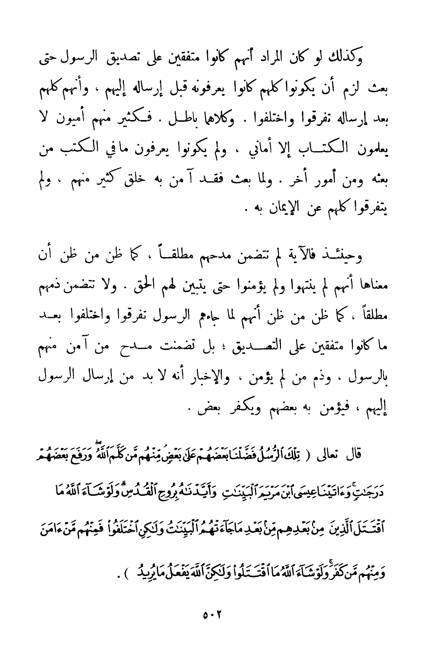 وَكَذَلِكَ لَوْ كَانَ الْمُرَادُ أَنَّهُمْ كَانُوا مُتَّفِقِينَ عَلَى تَصْدِيقِ الرَّسُولِ حَتَّى بُعِثَ لَزِمَ أَنْ يَكُونُوا كُلَّهُمْ كَانُوا يَعْرِفُونَهُ قَبْلَ إرْسَالِهِ إلَيْهِمْ وَأَنَّهُمْ كُلَّهُمْ بَعْدَ إرْسَالِهِ تَفَرَّقُوا وَاخْتَلَفُوا. وَكِلَاهُمَا بَاطِلٌ. فَكَثِيرٌ مِنْهُمْ أُمِّيُّونَ لَا يَعْلَمُونَ الْكِتَابَ إلَّا أَمَانِيَّ وَلَمْ يَكُونُوا يَعْرِفُونَ مَا فِي الْكُتُبِ مِنْ بَعْثِهِ وَمِنْ أُمُورٍ أُخَرٍ. وَلَمَّا بُعِثَ فَقَدْ آمَنَ بِهِ خَلْقٌ كَثِيرٌ مِنْهُمْ وَلَمْ يَتَفَرَّقُوا كُلُّهُمْ عَنْ الْإِيمَانِ بِهِ. وَحِينَئِذٍ فَالْآيَةُ لَمْ تَتَضَمَّنْ مَدْحَهُمْ مُطْلَقًا كَمَا ظَنَّ مَنْ ظَنَّ أَنَّ مَعْنَاهَا أَنَّهُمْ لَمْ يَنْتَهُوا وَلَمْ يُؤْمِنُوا حَتَّى يَتَبَيَّنَ لَهُمْ الْحَقُّ. وَلَا تَتَضَمَّنُ ذَمَّهُمْ مُطْلَقًا كَمَا ظَنَّ مَنْ ظَنَّ أَنَّهُمْ لَمَّا جَاءَهُمْ الرَّسُولُ تَفَرَّقُوا وَاخْتَلَفُوا بَعْدَ مَا كَانُوا مُتَّفِقِينَ عَلَى التَّصْدِيقِ؛ بَلْ تَضَمَّنَتْ مَدْحَ مَنْ آمَنَ مِنْهُمْ بِالرَّسُولِ. وَذَمَّ مَنْ لَمْ يُؤْمِنْ وَالْإِخْبَارُ أَنَّهُ لَا بُدَّ مِنْ إرْسَالِ الرَّسُولِ إلَيْهِمْ فَيُؤْمِنُ بِهِ بَعْضُهُمْ وَيَكْفُرُ بَعْضٌ. قَالَ تَعَالَى {تِلْكَ الرُّسُلُ فَضَّلْنَا بَعْضَهُمْ عَلَى بَعْضٍ مِنْهُمْ مَنْ كَلَّمَ اللَّهُ وَرَفَعَ بَعْضَهُمْ دَرَجَاتٍ وَآتَيْنَا عِيسَى ابْنَ مَرْيَمَ الْبَيِّنَاتِ وَأَيَّدْنَاهُ بِرُوحِ الْقُدُسِ وَلَوْ شَاءَ اللَّهُ مَا اقْتَتَلَ الَّذِينَ مِنْ بَعْدِهِمْ مِنْ بَعْدِ مَا جَاءَتْهُمُ الْبَيِّنَاتُ وَلَكِنِ اخْتَلَفُوا فَمِنْهُمْ مَنْ آمَنَ وَمِنْهُمْ مَنْ كَفَرَ وَلَوْ شَاءَ اللَّهُ مَا اقْتَتَلُوا وَلَكِنَّ اللَّهَ يَفْعَلُ مَا يُرِيدُ} .