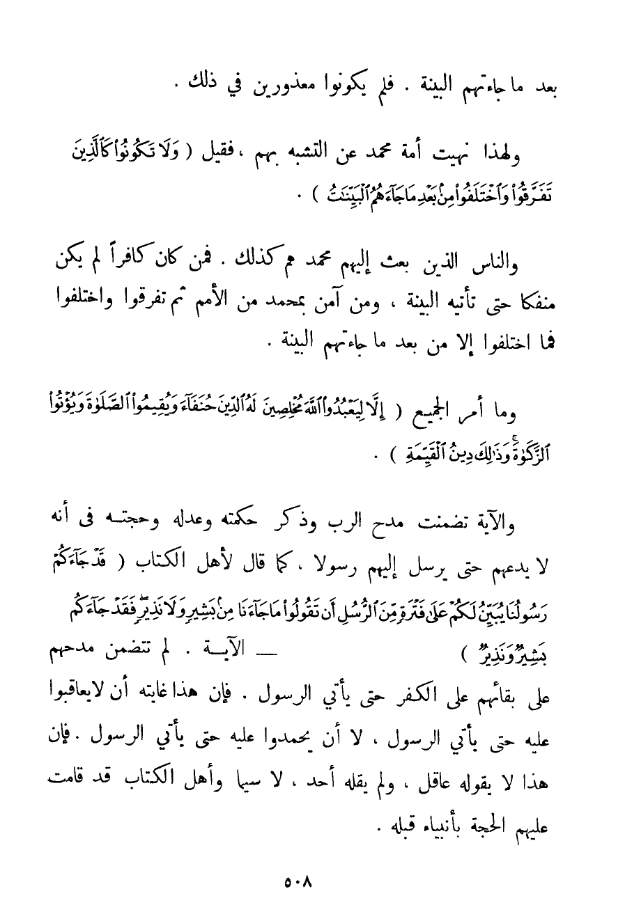 بَعْدِ مَا جَاءَتْهُمْ الْبَيِّنَةُ. فَلَمْ يَكُونُوا مَعْذُورِينَ فِي ذَلِكَ. وَلِهَذَا نُهِيَتْ أُمَّةُ مُحَمَّدٍ عَنْ التَّشَبُّهِ بِهِمْ فَقِيلَ {وَلَا تَكُونُوا كَالَّذِينَ تَفَرَّقُوا وَاخْتَلَفُوا مِنْ بَعْدِ مَا جَاءَهُمُ الْبَيِّنَاتُ} . وَالنَّاسُ الَّذِينَ بُعِثَ إلَيْهِمْ مُحَمَّدٌ هُمْ كَذَلِكَ. فَمَنْ كَانَ كَافِرًا لَمْ يَكُنْ مُنْفَكًّا حَتَّى تَأْتِيَهُ الْبَيِّنَةُ وَمَنْ آمَنَ بِمُحَمَّدِ مِنْ الْأُمَمِ ثُمَّ تَفَرَّقُوا وَاخْتَلَفُوا فَمَا اخْتَلَفُوا إلَّا مِنْ بَعْدِ مَا جَاءَتْهُمْ الْبَيِّنَةُ. وَمَا أُمِرَ الْجَمِيعُ {إلَّا لِيَعْبُدُوا اللَّهَ مُخْلِصِينَ لَهُ الدِّينَ حُنَفَاءَ وَيُقِيمُوا الصَّلَاةَ وَيُؤْتُوا الزَّكَاةَ وَذَلِكَ دِينُ الْقَيِّمَةِ} . وَالْآيَةُ تَضَمَّنَتْ مَدْحَ الرَّبِّ وَذِكْرَ حِكْمَتِهِ وَعَدْلِهِ وَحُجَّتِهِ فِي أَنَّهُ لَا يَدْعُهُمْ حَتَّى يُرْسِلَ إلَيْهِمْ رَسُولًا كَمَا قَالَ لِأَهْلِ الْكِتَابِ {قَدْ جَاءَكُمْ رَسُولُنَا يُبَيِّنُ لَكُمْ عَلَى فَتْرَةٍ مِنَ الرُّسُلِ أَنْ تَقُولُوا مَا جَاءَنَا مِنْ بَشِيرٍ وَلَا نَذِيرٍ فَقَدْ جَاءَكُمْ بَشِيرٌ وَنَذِيرٌ} الْآيَةَ. لَمْ تَتَضَمَّنْ مَدْحَهُمْ عَلَى بَقَائِهِمْ عَلَى الْكُفْرِ حَتَّى يَأْتِيَ الرَّسُولُ. فَإِنَّ هَذَا غَايَتُهُ أَنْ لَا يُعَاقَبُوا عَلَيْهِ حَتَّى يَأْتِيَ الرَّسُولُ لَا أَنْ يُحْمَدُوا عَلَيْهِ حَتَّى يَأْتِيَ الرَّسُولُ. فَإِنَّ هَذَا لَا يَقُولُهُ عَاقِلٌ وَلَمْ يَقُلْهُ أَحَدٌ لَا سِيَّمَا وَأَهْلُ الْكِتَابِ قَدْ قَامَتْ عَلَيْهِمْ الْحُجَّةُ بِأَنْبِيَاءِ قَبْلَهُ.