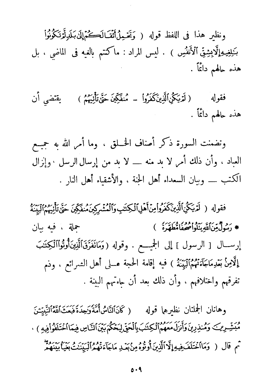 وَنَظِيرُ هَذَا فِي اللَّفْظِ قَوْلُهُ {وَتَحْمِلُ أَثْقَالَكُمْ إلَى بَلَدٍ لَمْ تَكُونُوا بَالِغِيهِ إلَّا بِشِقِّ الْأَنْفُسِ} . لَيْسَ الْمُرَادُ: مَا كُنْتُمْ بَالِغِيهِ فِي الْمَاضِي بَلْ هَذِهِ حَالُهُمْ دَائِمًا. فَقَوْلُهُ " لَمْ يَكُنْ الَّذِينَ كَفَرُوا مُنْفَكِّينَ حَتَّى تَأْتِيَهُمْ " يَقْتَضِي أَنَّ هَذِهِ حَالُهُمْ دَائِمًا. وَتَضَمَّنَتْ السُّورَةُ ذِكْرَ أَصْنَافِ الْخَلْقِ وَمَا أَمَرَ اللَّهُ بِهِ جَمِيعَ الْعِبَادِ وَأَنَّ ذَلِكَ أَمْرٌ لَا بُدَّ مِنْهُ لَا بُدَّ مِنْ إرْسَالِ الرُّسُلِ وَإِنْزَالِ الْكُتُبِ وَبَيَانِ السُّعَدَاءِ أَهْلِ الْجَنَّةِ وَالْأَشْقِيَاءِ أَهْلِ النَّارِ. فَقَوْلُهُ {لَمْ يَكُنِ الَّذِينَ كَفَرُوا مِنْ أَهْلِ الْكِتَابِ وَالْمُشْرِكِينَ مُنْفَكِّينَ حَتَّى تَأْتِيَهُمُ الْبَيِّنَةُ} {رَسُولٌ مِنَ اللَّهِ يَتْلُو صُحُفًا مُطَهَّرَةً} جُمْلَةً فِيهِ بَيَانُ إرْسَالِ الرَّسُولِ إلَى الْجَمِيعِ. وَقَوْلُهُ {وَمَا تَفَرَّقَ الَّذِينَ أُوتُوا الْكِتَابَ إلَّا مِنْ بَعْدِ مَا جَاءَتْهُمُ الْبَيِّنَةُ} فِيهِ إقَامَةُ الْحُجَّةِ عَلَى أَهْلِ الشَّرَائِعِ وَذَمُّ تَفَرُّقِهِمْ وَاخْتِلَافِهِمْ وَأَنَّ ذَلِكَ بَعْدَ أَنْ جَاءَتْهُمْ الْبَيِّنَةُ. وَهَاتَانِ الْجُمْلَتَانِ نَظِيرُهُمَا قَوْلُهُ {كَانَ النَّاسُ أُمَّةً وَاحِدَةً فَبَعَثَ اللَّهُ النَّبِيِّينَ مُبَشِّرِينَ وَمُنْذِرِينَ وَأَنْزَلَ مَعَهُمُ الْكِتَابَ بِالْحَقِّ لِيَحْكُمَ بَيْنَ النَّاسِ فِيمَا اخْتَلَفُوا فِيهِ} ثُمَّ قَالَ {وَمَا اخْتَلَفَ فِيهِ إلَّا الَّذِينَ أُوتُوهُ مِنْ بَعْدِ