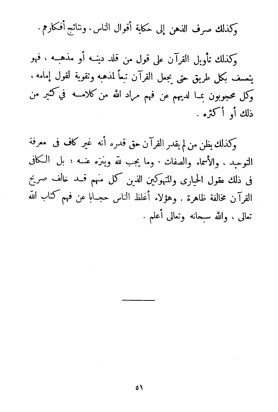 وَكَذَلِكَ صَرْفُ الذِّهْنِ إلَى حِكَايَةِ أَقْوَالِ النَّاسِ وَنَتَائِجِ أَفْكَارِهِمْ. وَكَذَلِكَ تَأْوِيلُ الْقُرْآنِ عَلَى قَوْلِ مَنْ قَلَّدَ دِينَهُ أَوْ مَذْهَبَهُ فَهُوَ يَتَعَسَّفُ بِكُلِّ طَرِيقٍ حَتَّى يَجْعَلَ الْقُرْآنَ تَبَعًا لِمَذْهَبِهِ وَتَقْوِيَةً لِقَوْلِ إمَامِهِ وَكُلٌّ مَحْجُوبُونَ بِمَا لَدَيْهِمْ عَنْ فَهْمِ مُرَادِ اللَّهِ مِنْ كَلَامِهِ فِي كَثِيرٍ مِنْ ذَلِكَ أَوْ أَكْثَرِهِ. وَكَذَلِكَ يَظُنُّ مَنْ لَمْ يُقَدِّرْ الْقُرْآنَ حَقَّ قَدْرِهِ أَنَّهُ غَيْرُ كَافٍ فِي مَعْرِفَةِ التَّوْحِيدِ وَالْأَسْمَاءِ وَالصِّفَاتِ وَمَا يَجِبُ لِلَّهِ وَيُنَزَّهُ عَنْهُ؛ بَلْ الْكَافِي فِي ذَلِكَ عُقُولُ الْحَيَارَى والمتهوكين الَّذِينَ كُلٌّ مِنْهُمْ قَدْ خَالَفَ صَرِيحَ الْقُرْآنِ مُخَالَفَةً ظَاهِرَةً. وَهَؤُلَاءِ أَغْلَظُ النَّاسِ حِجَابًا عَنْ فَهْمِ كِتَابِ اللَّهِ تَعَالَى وَاَللَّهُ سُبْحَانَهُ وَتَعَالَى أَعْلَمُ.