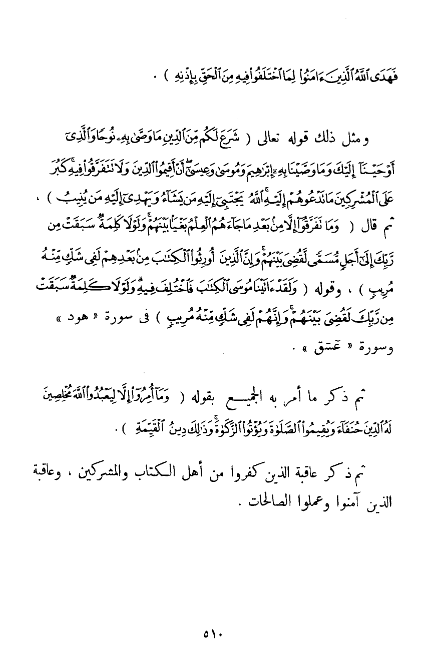 مَا جَاءَتْهُمُ الْبَيِّنَاتُ بَغْيًا بَيْنَهُمْ فَهَدَى اللَّهُ الَّذِينَ آمَنُوا لِمَا اخْتَلَفُوا فِيهِ مِنَ الْحَقِّ بِإِذْنِهِ} . وَمِثْلُ ذَلِكَ قَوْله تَعَالَى {شَرَعَ لَكُمْ مِنَ الدِّينِ مَا وَصَّى بِهِ نُوحًا وَالَّذِي أَوْحَيْنَا إلَيْكَ وَمَا وَصَّيْنَا بِهِ إبْرَاهِيمَ وَمُوسَى وَعِيسَى أَنْ أَقِيمُوا الدِّينَ وَلَا تَتَفَرَّقُوا فِيهِ كَبُرَ عَلَى الْمُشْرِكِينَ مَا تَدْعُوهُمْ إلَيْهِ اللَّهُ يَجْتَبِي إلَيْهِ مَنْ يَشَاءُ وَيَهْدِي إلَيْهِ مَنْ يُنِيبُ} ثُمَّ قَالَ {وَمَا تَفَرَّقُوا إلَّا مِنْ بَعْدِ مَا جَاءَهُمُ الْعِلْمُ بَغْيًا بَيْنَهُمْ وَلَوْلَا كَلِمَةٌ سَبَقَتْ مِنْ رَبِّكَ إلَى أَجَلٍ مُسَمًّى لَقُضِيَ بَيْنَهُمْ وَإِنَّ الَّذِينَ أُورِثُوا الْكِتَابَ مِنْ بَعْدِهِمْ لَفِي شَكٍّ مِنْهُ مُرِيبٍ} وَقَوْلُهُ {وَلَقَدْ آتَيْنَا مُوسَى الْكِتَابَ فَاخْتُلِفَ فِيهِ وَلَوْلَا كَلِمَةٌ سَبَقَتْ مِنْ رَبِّكَ لَقُضِيَ بَيْنَهُمْ وَإِنَّهُمْ لَفِي شَكٍّ مِنْهُ مُرِيبٍ} فِي سُورَةِ " هُودٍ " وَسُورَةِ " عسق ". ثُمَّ ذَكَرَ مَا أُمِرَ بِهِ الْجَمِيعُ بِقَوْلِهِ {وَمَا أُمِرُوا إلَّا لِيَعْبُدُوا اللَّهَ مُخْلِصِينَ لَهُ الدِّينَ حُنَفَاءَ وَيُقِيمُوا الصَّلَاةَ وَيُؤْتُوا الزَّكَاةَ وَذَلِكَ دِينُ الْقَيِّمَةِ} . ثُمَّ ذَكَرَ عَاقِبَةَ الَّذِينَ كَفَرُوا مِنْ أَهْلِ الْكِتَابِ وَالْمُشْرِكِينَ وَعَاقِبَةَ الَّذِينَ آمَنُوا وَعَمِلُوا الصَّالِحَاتِ.