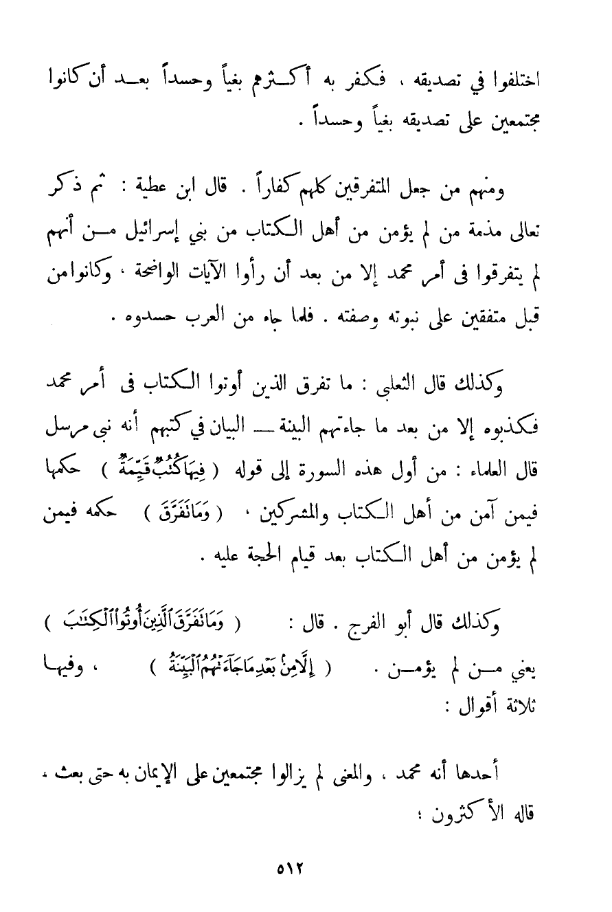 اخْتَلَفُوا فِي تَصْدِيقِهِ فَكَفَرَ بِهِ أَكْثَرُهُمْ بَغْيًا وَحَسَدًا بَعْدَ أَنْ كَانُوا مُجْتَمِعِينَ عَلَى تَصْدِيقِهِ بَغْيًا وَحَسَدًا. وَمِنْهُمْ مَنْ جَعَلَ الْمُتَفَرِّقِينَ كُلَّهُمْ كُفَّارًا. قَالَ ابْنُ عَطِيَّةَ: ثُمَّ ذَكَرَ تَعَالَى مَذَمَّةَ مَنْ لَمْ يُؤْمِنْ مِنْ أَهْلِ الْكِتَابِ مِنْ بَنِي إسْرَائِيلَ مِنْ أَنَّهُمْ لَمْ يَتَفَرَّقُوا فِي أَمْرِ مُحَمَّدٍ إلَّا مِنْ بَعْدِ أَنْ رَأَوْا الْآيَاتِ الْوَاضِحَةِ وَكَانُوا مِنْ قَبْلُ مُتَّفِقِينَ عَلَى نُبُوَّتِهِ وَصِفَتِهِ. فَلَمَّا جَاءَ مِنْ الْعَرَبِ حَسَدُوهُ. وَكَذَلِكَ قَالَ الثَّعْلَبِيُّ: مَا تَفَرَّقَ الَّذِينَ أُوتُوا الْكِتَابَ فِي أَمْرِ مُحَمَّدٍ فَكَذَّبُوهُ إلَّا مِنْ بَعْدِ مَا جَاءَتْهُمْ الْبَيِّنَةُ الْبَيَانُ فِي كُتُبِهِمْ أَنَّهُ نَبِيٌّ مُرْسَلٌ قَالَ الْعُلَمَاءُ: مِنْ أَوَّلِ هَذِهِ السُّورَةِ إلَى قَوْلِهِ {فِيهَا كُتُبٌ قَيِّمَةٌ} حُكْمُهَا فِيمَنْ آمَنُ مِنْ أَهْلِ الْكِتَابِ وَالْمُشْرِكِينَ {وَمَا تَفَرَّقَ} حُكْمُهُ فِيمَنْ لَمْ يُؤْمِنْ مِنْ أَهْلِ الْكِتَابِ بَعْدَ قِيَامِ الْحُجَّةِ عَلَيْهِ. وَكَذَلِكَ قَالَ أَبُو الْفَرَجِ. قَالَ: {وَمَا تَفَرَّقَ الَّذِينَ أُوتُوا الْكِتَابَ} يَعْنِي مَنْ لَمْ يُؤْمِنْ. {إلَّا مِنْ بَعْدِ مَا جَاءَتْهُمُ الْبَيِّنَةُ} وَفِيهَا ثَلَاثَةُ أَقْوَالٍ: أَحَدُهَا أَنَّهُ مُحَمَّدٌ وَالْمَعْنَى لَمْ يَزَالُوا مُجْتَمِعِينَ عَلَى الْإِيمَانِ بِهِ حَتَّى بُعِثَ قَالَهُ الْأَكْثَرُونَ؛