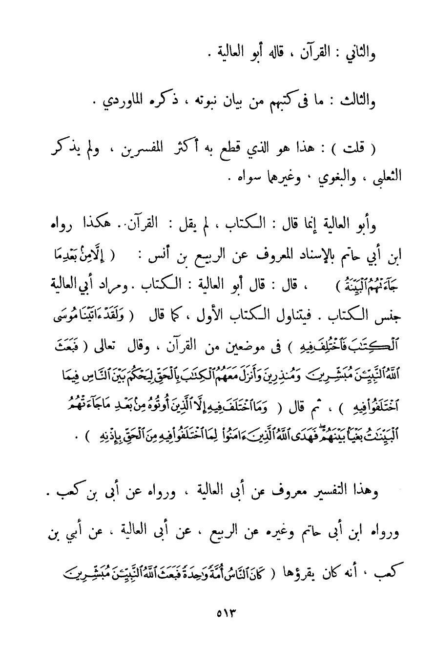 وَالثَّانِي: الْقُرْآنُ قَالَهُ أَبُو الْعَالِيَةِ. وَالثَّالِثُ: مَا فِي كُتُبِهِمْ مِنْ بَيَانِ نُبُوَّتِهِ ذَكَرَهُ الماوردي. (قُلْت: هَذَا هُوَ الَّذِي قَطَعَ بِهِ أَكْثَرُ الْمُفَسِّرِينَ وَلَمْ يَذْكُرْ الثَّعْلَبِيُّ والبغوي وَغَيْرُهُمَا سِوَاهُ. وَأَبُو الْعَالِيَةِ إنَّمَا قَالَ: الْكِتَابُ لَمْ يَقُلْ: الْقُرْآنَ. هَكَذَا رَوَاهُ ابْنُ أَبِي حَاتِمٍ بِالْإِسْنَادِ الْمَعْرُوفِ عَنْ الرَّبِيعِ بْنِ أَنَسٍ: {إلَّا مِنْ بَعْدِ مَا جَاءَتْهُمُ الْبَيِّنَةُ} قَالَ: قَالَ أَبُو الْعَالِيَةِ: الْكِتَابُ. وَمُرَادُ أَبِي الْعَالِيَةِ جِنْسُ الْكِتَابِ. فَيَتَنَاوَلُ الْكِتَابَ الْأَوَّلَ كَمَا قَالَ {وَلَقَدْ آتَيْنَا مُوسَى الْكِتَابَ فَاخْتُلِفَ فِيهِ} فِي مَوْضِعَيْنِ مِنْ الْقُرْآنِ وَقَالَ تَعَالَى {فَبَعَثَ اللَّهُ النَّبِيِّينَ مُبَشِّرِينَ وَمُنْذِرِينَ وَأَنْزَلَ مَعَهُمُ الْكِتَابَ بِالْحَقِّ لِيَحْكُمَ بَيْنَ النَّاسِ فِيمَا اخْتَلَفُوا فِيهِ} ثُمَّ قَالَ {وَمَا اخْتَلَفَ فِيهِ إلَّا الَّذِينَ أُوتُوهُ مِنْ بَعْدِ مَا جَاءَتْهُمُ الْبَيِّنَاتُ بَغْيًا بَيْنَهُمْ فَهَدَى اللَّهُ الَّذِينَ آمَنُوا لِمَا اخْتَلَفُوا فِيهِ مِنَ الْحَقِّ بِإِذْنِهِ} . وَهَذَا التَّفْسِيرُ مَعْرُوفٌ عَنْ أَبِي الْعَالِيَةِ وَرَوَاهُ عَنْ أبي بْنِ كَعْبٍ. وَرَوَاهُ ابْنُ أَبِي حَاتِمٍ وَغَيْرُهُ عَنْ الرَّبِيعِ عَنْ أَبِي الْعَالِيَةِ عَنْ أبي بْنِ كَعْبٍ أَنَّهُ كَانَ يَقْرَؤُهَا {كَانَ النَّاسُ أُمَّةً وَاحِدَةً فَبَعَثَ اللَّهُ