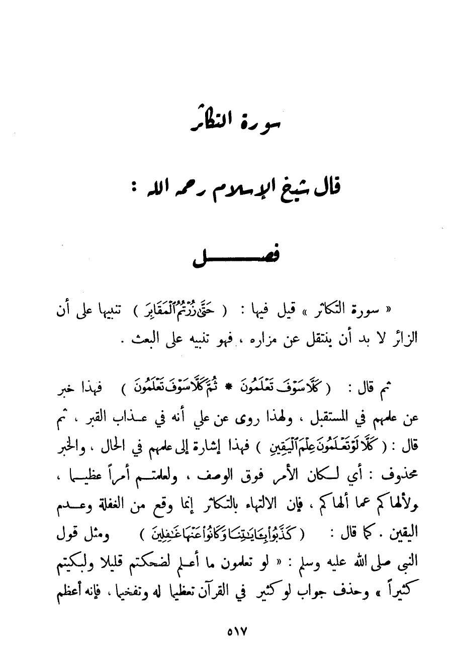 " سُورَةُ التَّكَاثُرِ " قِيلَ فِيهَا: {حَتَّى زُرْتُمُ الْمَقَابِرَ} تَنْبِيهًا عَلَى أَنَّ الزَّائِرَ لَا بُدَّ أَنْ يَنْتَقِلَ عَنْ مَزَارِهِ فَهُوَ تَنْبِيهٌ عَلَى الْبَعْثِ. ثُمَّ قَالَ: {كَلَّا سَوْفَ تَعْلَمُونَ} {ثُمَّ كَلَّا سَوْفَ تَعْلَمُونَ} فَهَذَا خَبَرٌ عَنْ عِلْمِهِمْ فِي الْمُسْتَقْبَلِ وَلِهَذَا رُوِيَ عَنْ عَلِيٍّ أَنَّهُ فِي عَذَابِ الْقَبْرِ ثُمَّ قَالَ. {كَلَّا لَوْ تَعْلَمُونَ عِلْمَ الْيَقِينِ} فَهَذَا إشَارَةٌ إلَى عِلْمِهِمْ فِي الْحَالِ وَالْخَبَرُ مَحْذُوفٌ: أَيْ لَكَانَ الْأَمْرُ فَوْقَ الْوَصْفِ وَلَعَلِمْتُمْ أَمْرًا عَظِيمًا وَلَأَلْهَاكُمْ عَمَّا أَلْهَاكُمْ فَإِنَّ الِالْتِهَاءَ بِالتَّكَاثُرِ إنَّمَا وَقَعَ مِنْ الْغَفْلَةِ وَعَدَمِ الْيَقِينِ. كَمَا قَالَ: {كَذَّبُوا بِآيَاتِنَا وَكَانُوا عَنْهَا غَافِلِينَ} وَمِثْلُ قَوْلِ النَّبِيِّ صَلَّى اللَّهُ عَلَيْهِ وَسَلَّمَ {لَوْ تَعْلَمُونَ مَا أَعْلَمُ لَضَحِكْتُمْ قَلِيلًا وَلَبَكَيْتُمْ كَثِيرًا} وَحَذْفُ جَوَابِ لَوْ كَثِيرٌ فِي الْقُرْآنِ تَعْظِيمًا لَهُ وَتَفْخِيمًا فَإِنَّهُ أَعْظَمُ